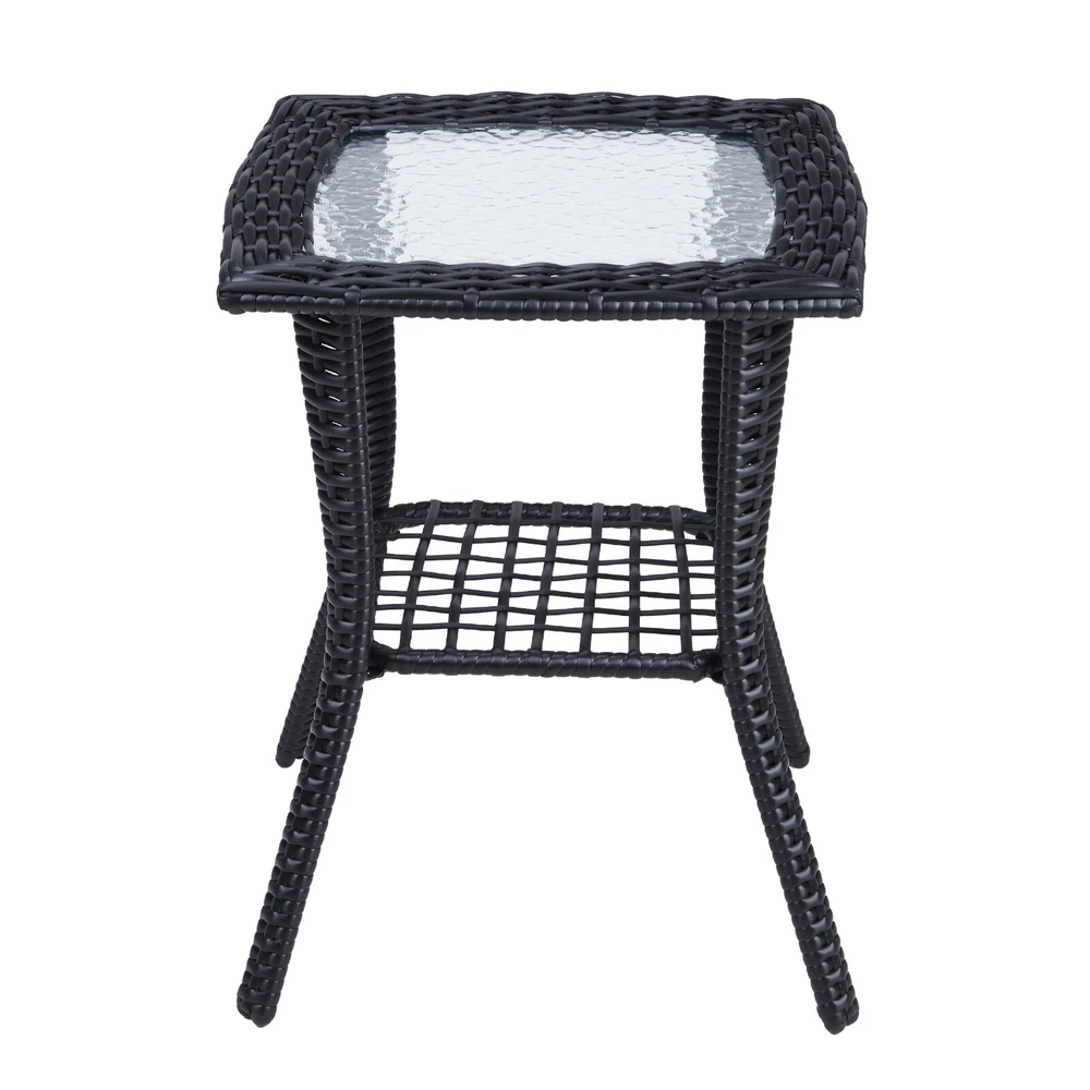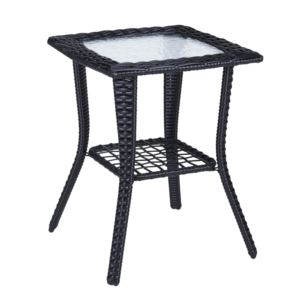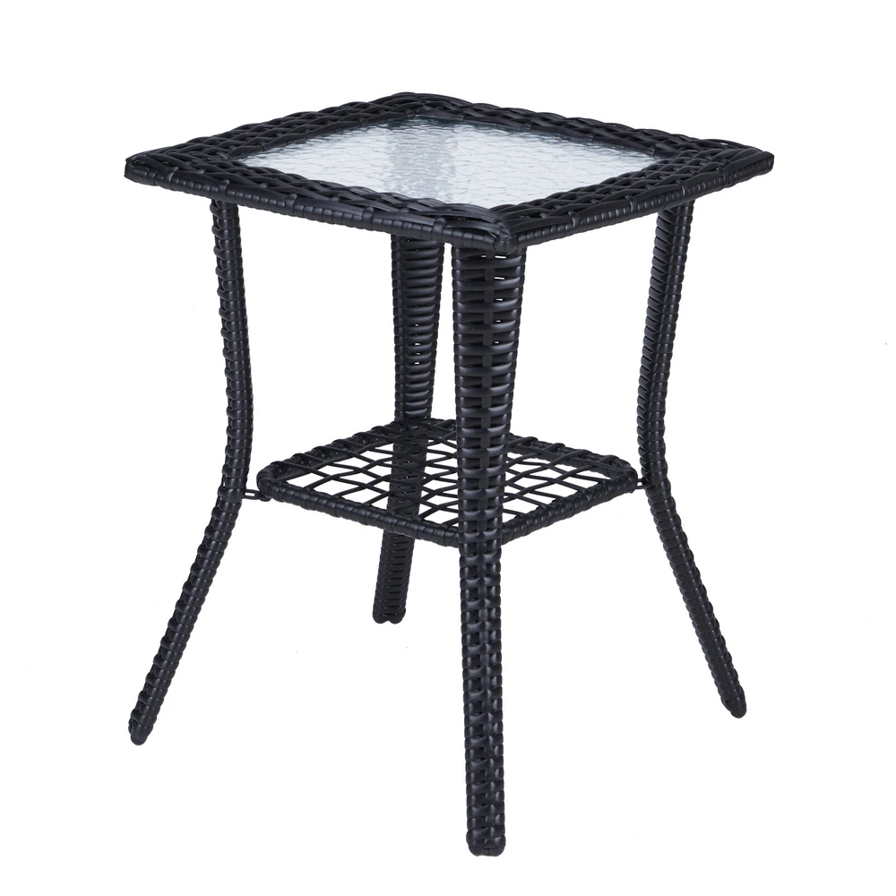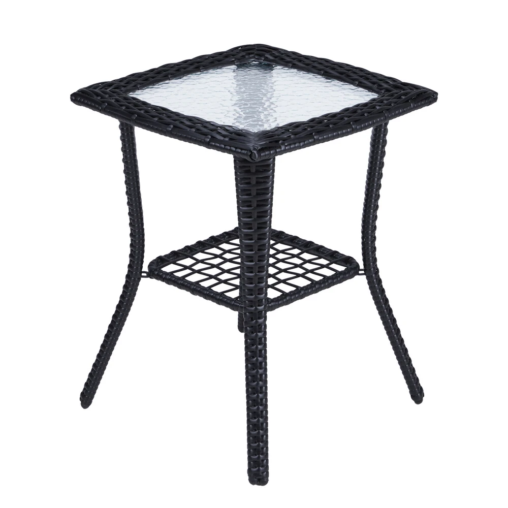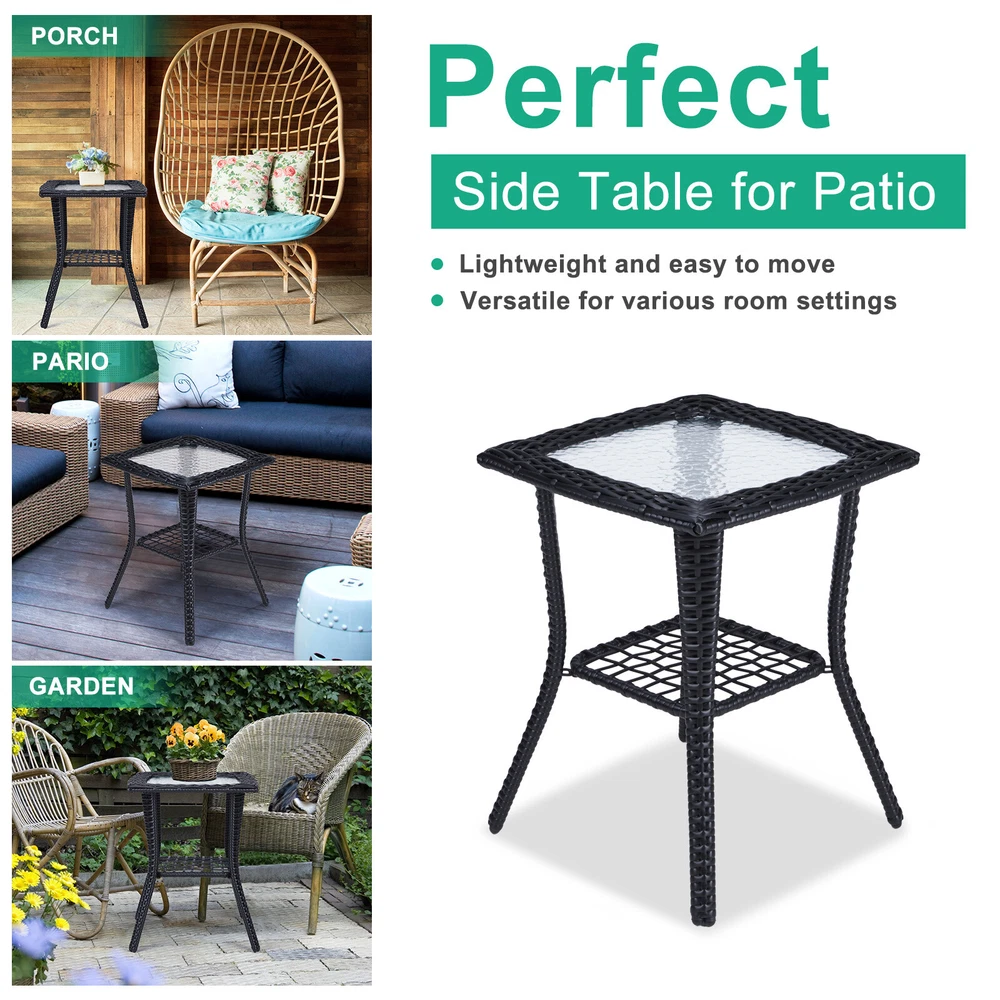 Introductions: Elevate your living space with our Outdoor Wicker Side Table, a perfect blend of style and functionality. Designed for both indoor and outdoor environments, this table showcases a sophisticated hand-woven wicker pattern paired with a unique water ripple-patterned tempered glass top. Constructed with a durable powder-coated steel frame and all-weather wicker, it guarantees longevity and resilience against the elements. The table's two-tier design not only enhances its visual appeal but also offers ample storage space. With easy assembly and a versatile design, this side table is an essential addition to your garden, porch, balcony, or living room. Features: 1. Sophisticated Elegance: Features a hand-woven wicker design and a tempered glass top with a distinctive water ripple pattern, adding a refined to any setting. 2. All-Weather Durability: Constructed with a powder-coated steel frame and premium all-weather wicker for enduring strength and weather resistance. 3. Versatile Storage Solution: The lower shelf provides additional storage space, making it practical for organizing outdoor essentials or displaying decorative items. 4. Effortless Setup: Comes with high-quality hardware and a detailed instruction manual for quick, hassle-free assembly. 5. Seamless Integration: Its elegant design ensures compatibility with any existing decor, making it suitable for both indoor and outdoor use. Specifications: 1. Material: Powder-Coated Steel / PE Wicker / Tempered Glass 2. Overall Dimensions: (17.9 x 17.9 x 22.6) in / (45.5 x 45.5 x 57.5) cm 3. Lower Shelf Dimensions: (11.2 x 11.2) in / (28.5 x 28.5) cm 4. Glass Top Dimensions: (12.6 x 12.6 x 0.2) in / (32 x 32 x 0.5) cm 5. Distance Between Legs: 16.9 in / 43 cm 6. Weight Capacity: 111 lbs / 50 kg 7. Net Weight: 9.9 lbs / 4.5 kg Package Includes: 1 x Wicker Side Table 1 x Set of Assembly Hardware 1 x Assembly Manual