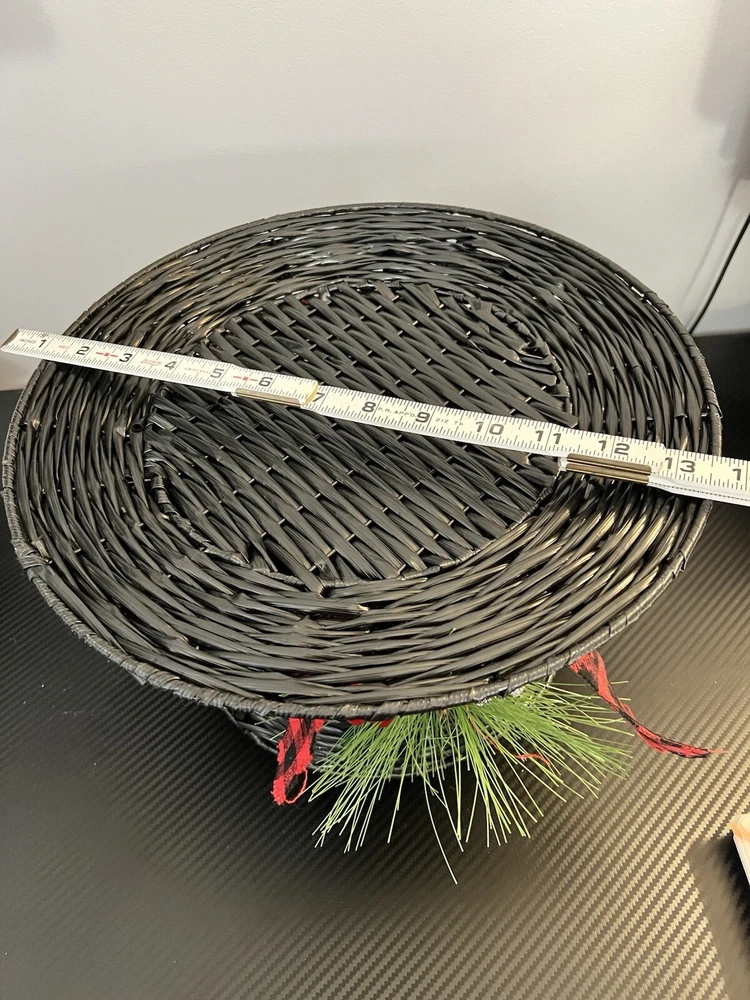 Black Wicker Snowman Hat Planter Display 7” X 13” Red Black Sash W/ Pine Accent good pre-owned condition - no flaws noticed