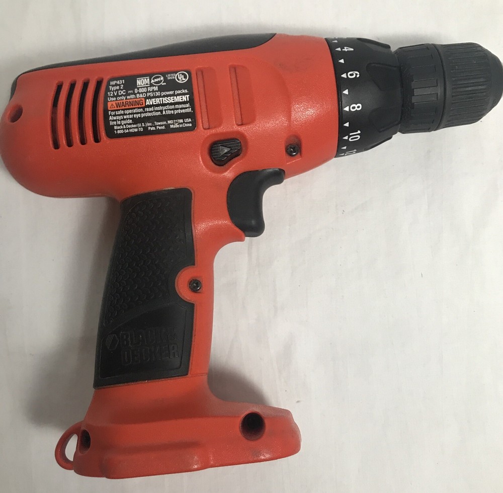 Black and decker firestorm 12v Cordless drill DRILL NO battery/charger (works with battery pack model PS130 or equivalent) 6 drill bits in case Thanks for your business Have a great day!