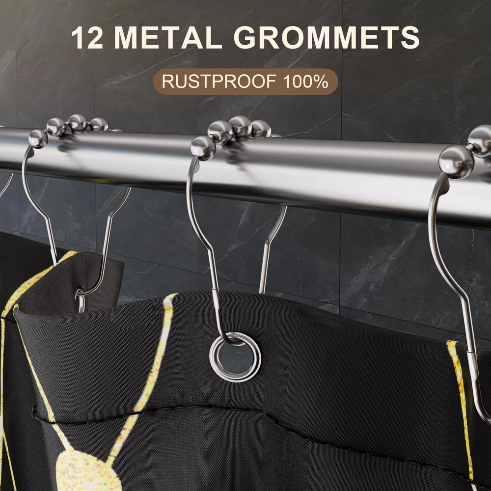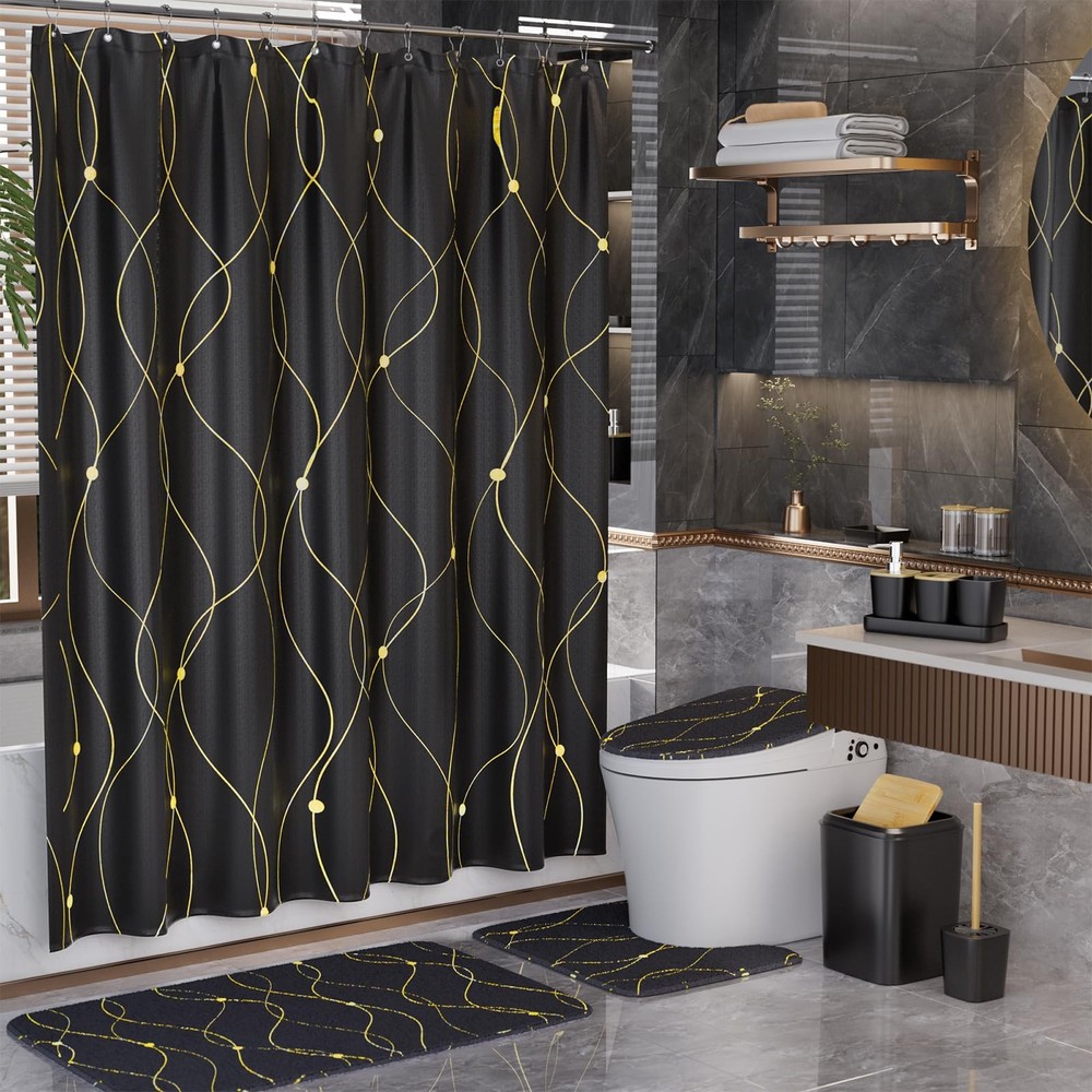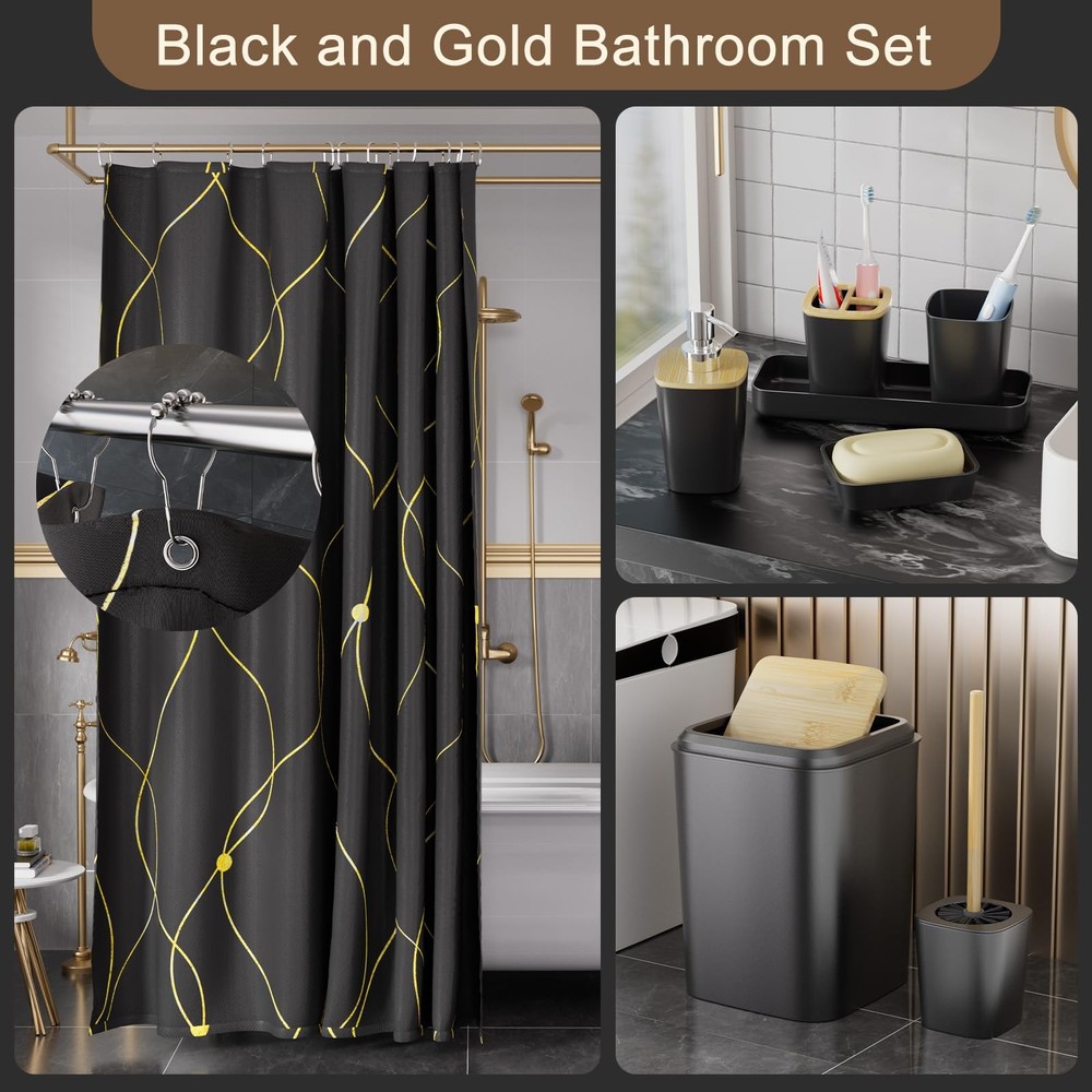 1.Full Functionality bathroom sets: Complete bathroom sets with shower curtain and rugs inclould: 70.9"L*70.9"W Shower curtains, 3PCS Bath Rugs set, trash can , toothbrush cup, toothbrush holder, lotion dispenser,toilet brush, soap holder, vanity tray, two Q-tip holder with lids,and all in one Bathroom Sets, to meet the various needs of your bathroom decoration and daily use. 2. Non-Slip & Ultra-Absorbent Bathroom Rugs:3PCS Flannel Bathroom mat set , memory foam and PVC backing, the flannel surface provides a soft and cozy touch while the PVC memory foam layer ensures good support and stability. adopt advanced HD pattern printing technology, No fading. Dry and comfortable for both bare feet and shoes! 3. Shower Curtain with Rugs :WATER-PROOF Shower curtain for bathroom sets with rugs is made of polyester, weights3.17OZ, size 70.9*70.9 inches; safeguarding your bathroom floor from splashes and spills for a cleaner and drier bathing experience.Printed Bath mat set of 3 (upgraded model) rectangle mat size 17.7*29.5 inches; U-shape mat size 17.7*15.7 inches; toilet mat size 17.7*13.8 inches.Creative and unique patterns instantly refresh and warm your bathroom. 4. Excellent & Refresh Bathroom Decor : This bathroom accessories set is made for you who seeks quality and style. Each product is made of STURDY & LONG-LASTING plastic used in the process of not worrying about falling will break, exquisite design and practicality perfect combination to meet the various needs of your daily life. bathroom set complete not only practical, but also beautiful, shower curtain and rug set make your bathroom space more neat and comfortable. 5.How To Care:Hand wash or machine wash in cold water, hang to dry, iron at low temperature, do not bleach. Please soak them (recommended) before using the mats, so that wrinkles can be removed well. Feel free to us with any questions.