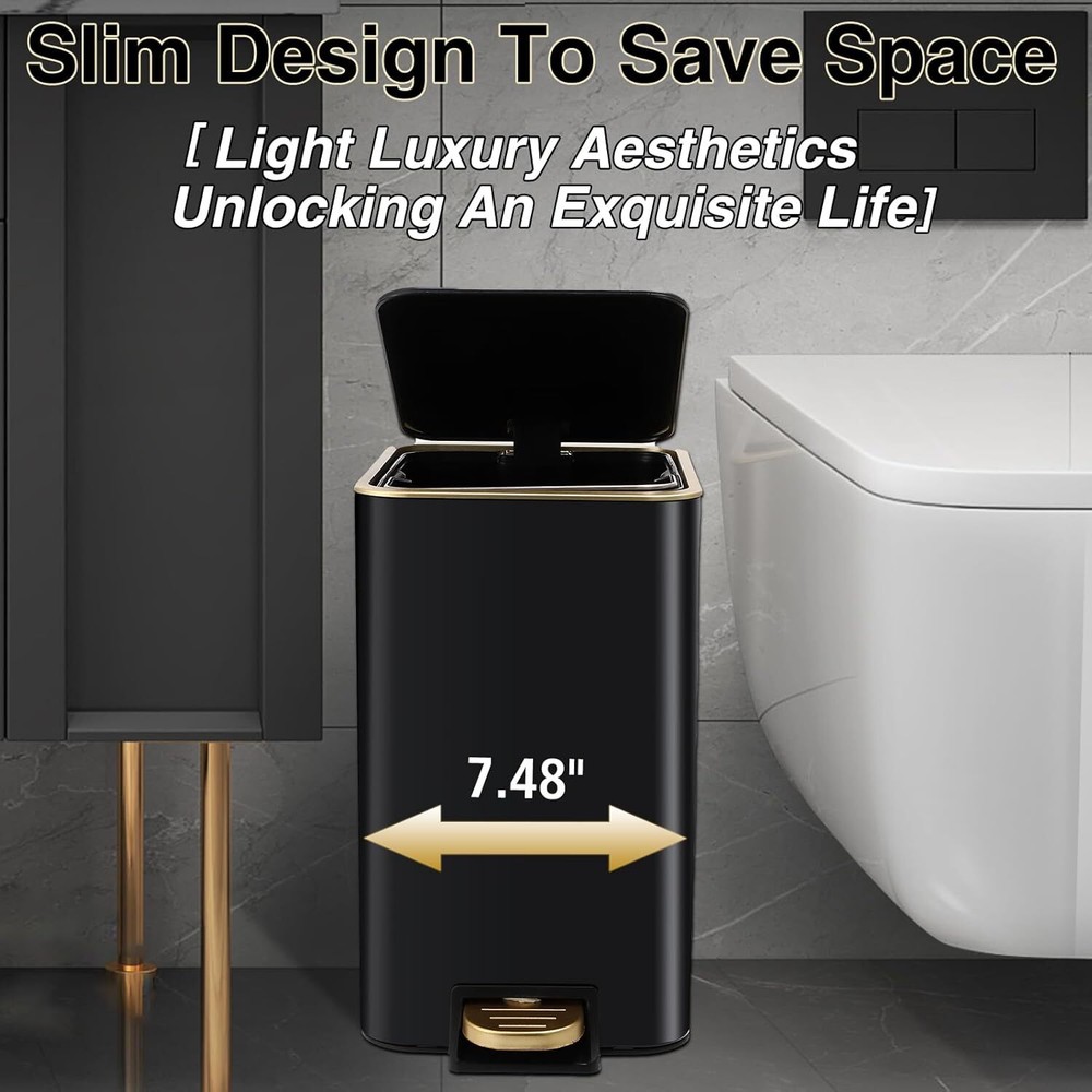 Luxury Bathroom Upgrades-we have carefully designed this black and gold bathroom set. Our bathroom kit accessories set complete including black and gold trash can with pedal, a Lotion Dispenser,Toothbrush Holder,Toothbrush Cup,toilet brush,Vanity Tray,Soap holder. Bringing the ultimate in quality and convenience to your bathroom. Durability Materials-Black and gold bathroom accessories Set Made of selected durable stainless steel materials and plastic materials are selected to ensure durability and rust resistance. Whether you use it daily or for a long period of time, it will keep its original appearance and add a touch of timeless splendor to your bathroom. Easy to clean-Our black and gold bathroom accessories sets complete not only provide high quality stainless steel trash cans and beautiful plastic accessories set, but also focus on easy-to-clean design. black and gold Stainless steel trash can has a smooth surface that is easy to wipe down, plastic accessories set are simple to maintain, and the waterproof design. Fully functional set-From black and gold trash cans to toilet brushes, from toothbrush holders to soap holder, each accessory is carefully selected to meet your daily needs. Our black and gold bathroom set complete not only practical, but also beautiful, make your bathroom space more neat and comfortable. Plus, with our exquisite bathroom accessories toothbrush holder set, your dental care essentials will be elegantly organized, adding both functionality and style to your daily routine. Create a new bathroom experience-This black and gold bathroom trash can set provides you with an all-around bathroom experience and gives your bathroom a new look. The black and gold bathroom accessories set complete not only a simple trash can, but also a thoughtful assistant for your life, adding more convenience and comfort to your life!