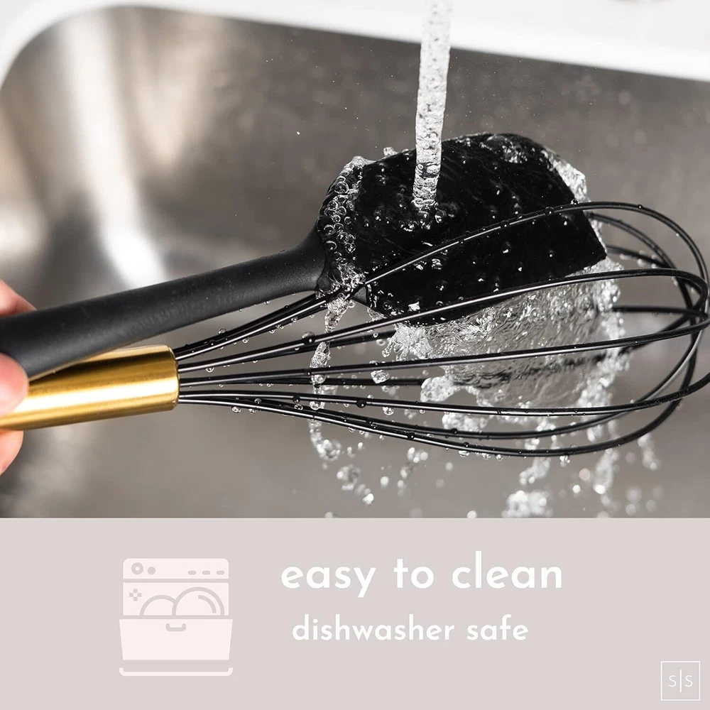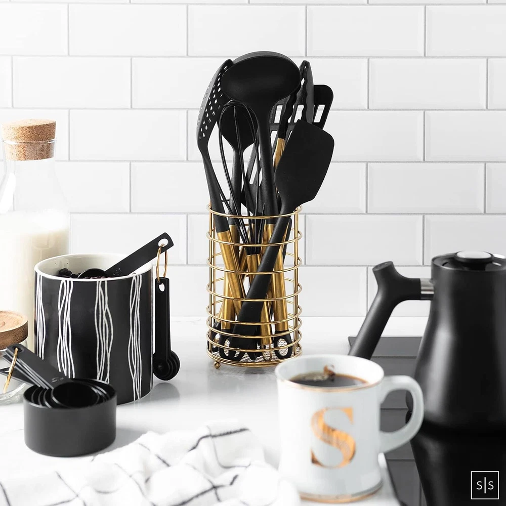 Color Black & Gold Material Nylon Item Weight 2.7 Pounds About this item ✔ BEAUTIFULLY DESIGNED AND CONVENIENT STARTER SET TO COMPLEMENT GOLD KITCHEN ACCESSORIES – eliminate multiple purchases and mismatched utensils; outfit your kitchen with this complete and cohesive 18-piece set of stylish gold kitchen utensils; includes black and gold tongs, skimmer, gold ladle, gold serving spoons, spatula turner, gold whisk, black spatula, black measuring cups and spoons set, and matching gold utensil holder to keep things organized. ✔ HIGH QUALITY MEETS HIGH STYLE– sturdy nylon is food safe, highly durable and resistant to cold and hot temperatures, making this set of gold serving utensils perfectly suited for all your kitchen needs; from cooking and baking to preparing and serving food, this black and gold cooking utensils set with holder and black measuring cups and spoons set are worth being seen ✔ NON-STICK AND EASY TO CLEAN MAKES COOKING A BREEZE – gold plated stainless steel handles are perfectly weighted and dishwasher-safe; durable non scratch gold and matte black kitchen utensils made of non-stick and stain-resistant nylon helps minimize messes and protects pots and pans, making this gold and black kitchen utensils set perfectly suited for all your kitchen needs ✔ THE PERFECT UNIQUE AND PRACTICAL GIFT – from novice to professional cooks, this sophisticated and classic black and gold cooking utensils set with holder would be a welcome addition to any kitchen and a great gift for birthdays, holidays, housewarming and more; perfect complement for gold kitchen decor, black kitchen decor or black kitchen accessories Color Black & Gold Material Nylon Item Weight 2.7 Pounds Size small UPC 857133007372 Package Dimensions 14.72 x 4.96 x 4.88 inches Item Weight 2.66 pounds