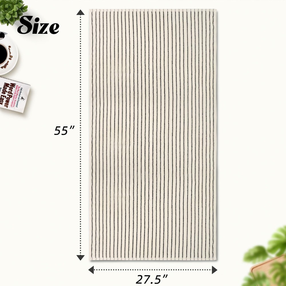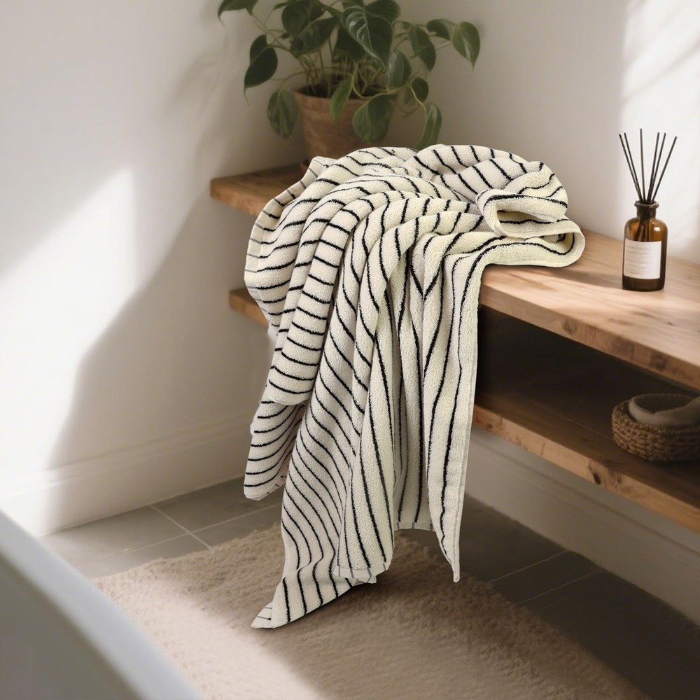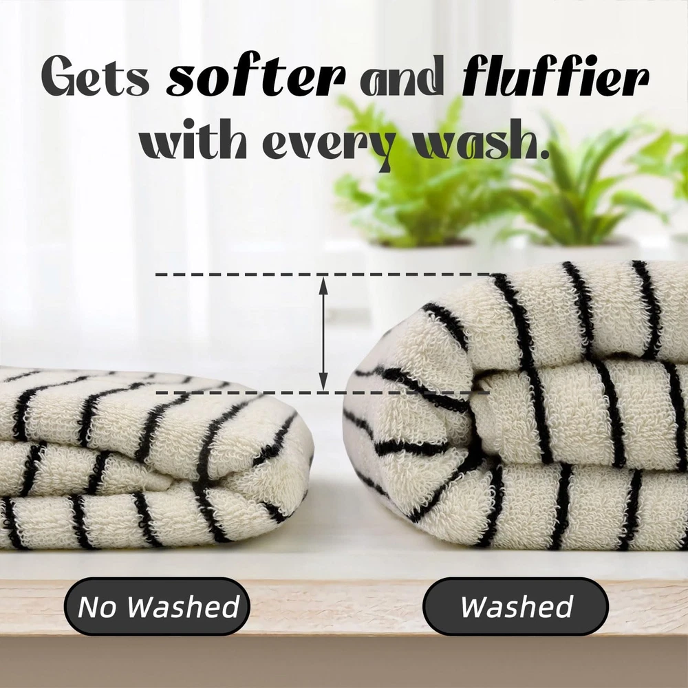 Soften Your Mornings & Evenings Cotton bath towels offer a luxurious softness that feels incredible against your skin while providing exceptional absorbency. Whether you're wrapping up after a hot shower or packing for a weekend trip, the lightweight texture and quick-dry fabric of cute towels bring comfort and joy you can feel, day after day. Black and Ivory Towels for Bathroom - Classic & Timeless Indulge in a luxury experience with these black towels that combine functionality with fashion. Their cabana stripes not only strike the perfect balance between modern farmhouse and rustic minimalism but also make funny bath towels set of 2 a delightful gift for friends and family. Attention to detail through with hemstitching technique that gives decorative towel set a finished, polished look. One Set, Endless Uses - From Bathroom to Beach Bag Extra large towels 27.5 x 55 inches are ideal for post-shower, poolside lounging, spa treatments, workouts, beach days, or RV travel. A versatile towel set that adapts to every lifestyle. Farmhouse or Modern: Bring timeless charm to your bathroom, guest room, or poolside setup with black and ivory cabana stripe bath towels, suits rustic, minimalist, or farmhouse bathroom styles Large Size: Feel ample coverage with large towels measuring 27.5 x 55 inches, perfect for wrapping up after a refreshing shower or swim. Suitable for men, women, teens, or kids Quick Drying: Designed for convenience, these lightweight bath towels dry faster than bulky ones, making them perfect for busy mornings, outdoor days, or decorative guest towels. Fast dry towels are ready for your next use Super Soft and Absorbent: Made from breathable cotton fabric, bathroom towels offer a plush, spa-like feel, and are highly absorbent that’s gentle on sensitive skin, perfect for daily pampering Versatile Use: Set of 2 black towels for bathroom, shower towels, beach days, pool, workout, dorm, travel, or summer gifts, soft and cute bath towels are your go-to companion for all occasions