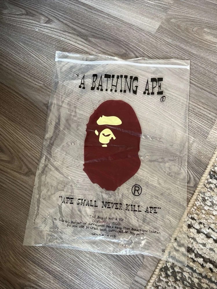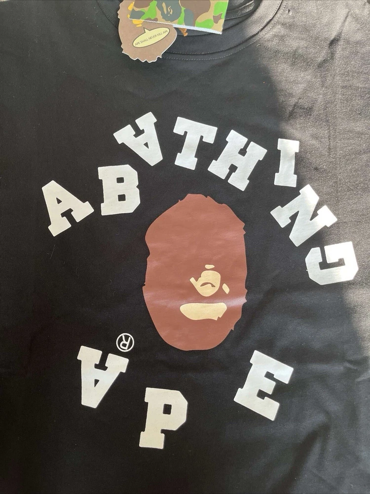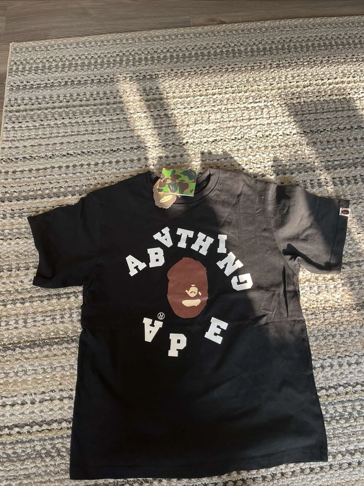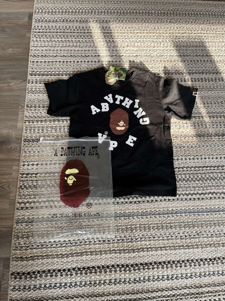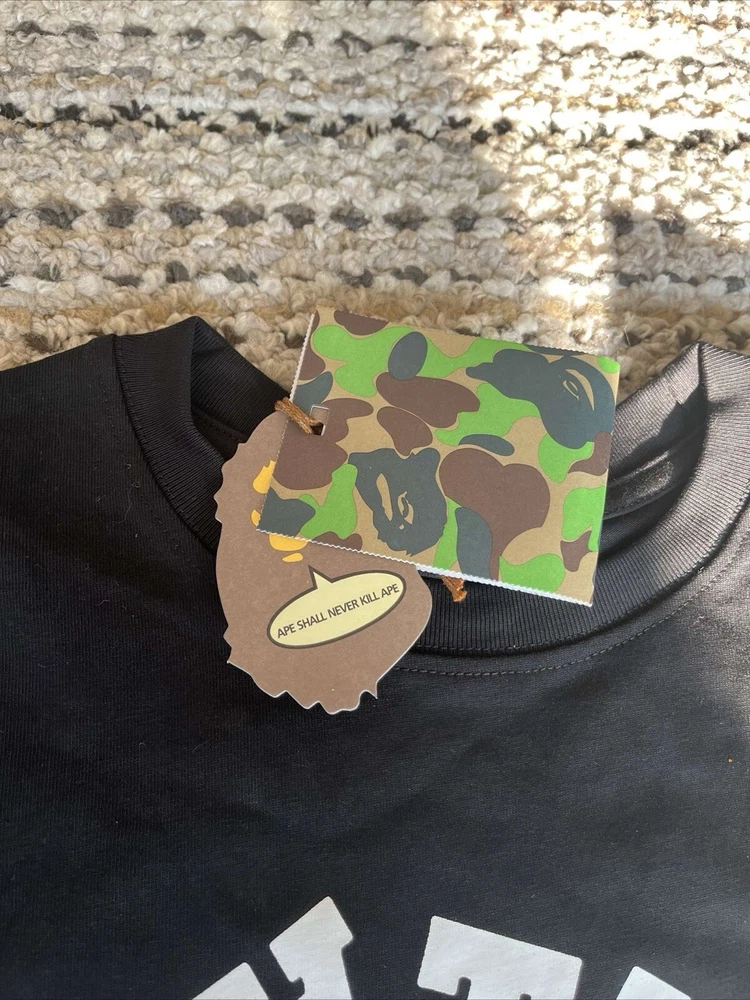 This black A Bathing Ape tee is perfect for college students looking for a stylish and comfortable shirt. With a crew neckline and short sleeves, it's perfect for summer classes or casual outings. Made of 100% cotton, it's both soft and durable, ensuring that it will last for many wears to come. The shirt comes in a size M and is a regular fit, making it ideal for most men. The design features a broken college bape theme, making it a great addition to any casual wardrobe. Don't miss out on this authentic tee, complete with tags and bag.