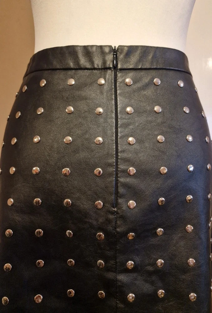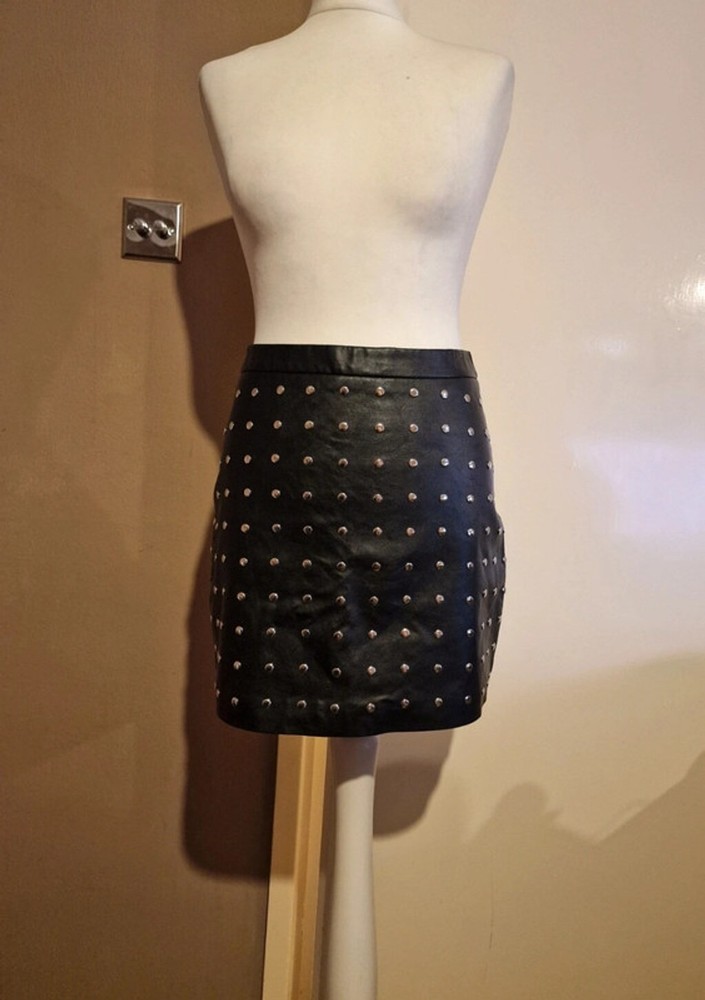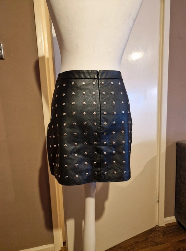 Dancing Leopard faux leather skirt - size 10. Gorgeous silver studding all over. Back zip fastening. Cute floral pattern fully lined fabric. Small scuff under the zip at the back, think it's where I may have caught the zip to the fabric once. Not noticeable when wearing.