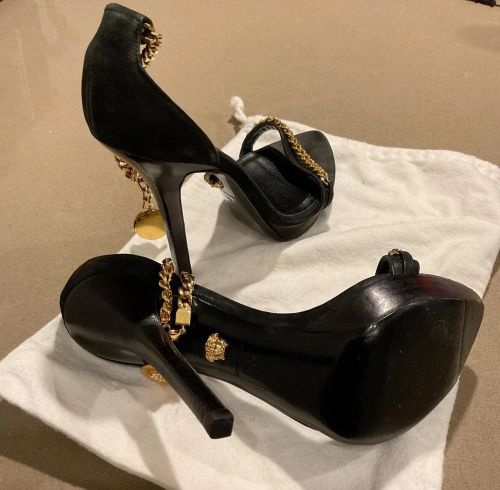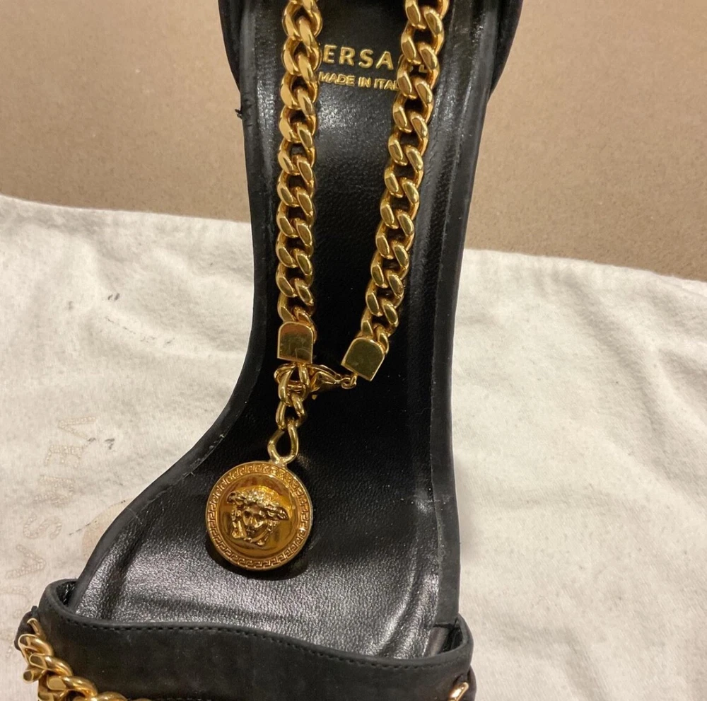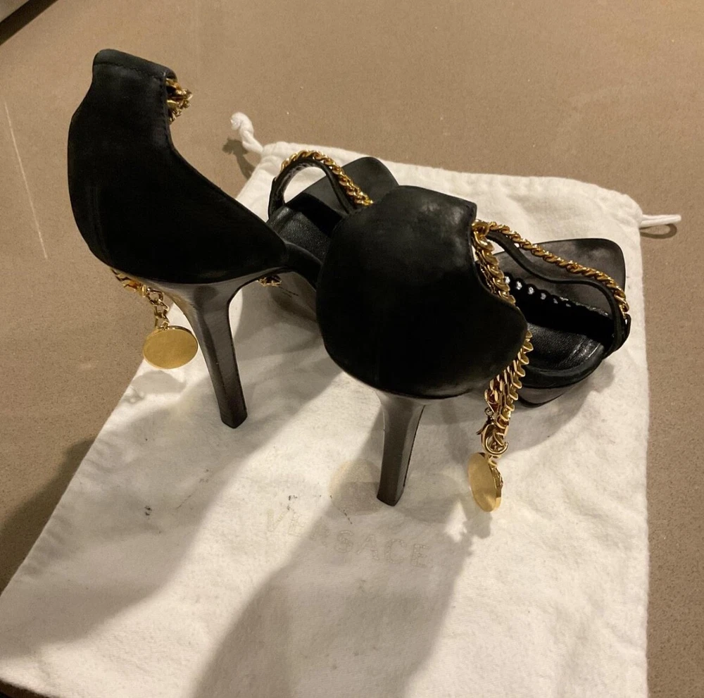 Department: Women Brand: Versace Heel Style: Stiletto Color: Black Theme: Metal Type: Heel Style: Strappy Upper Material: Leather, Suede US Shoe Size: 8