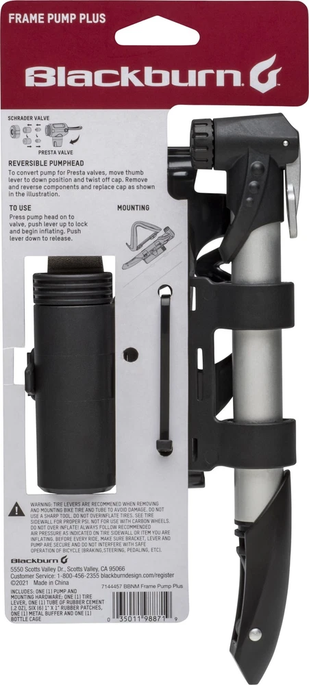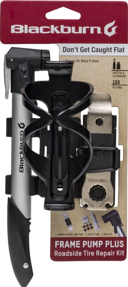 Our Blackburn Bicycle Frame Pump plus Tire Repair Kit is an all-in-one solution for most tube repairs in a convenient carry package. Included is a tire lever with a 15mm wrench to be able to remove your wheel, a glued patch kit with storage, and a frame pump to get you rolling again. All while still being able to mount this complete kit with a water bottle cage, so you don't have to sacrifice anything to get all the essentials on your bike. Presta and Schrader compatible reversible pump head Complete patch kit to tackle flat repair while out on a ride Steel tire lever with 15mm wheel wrench to remove tire easily Blackburn frame mount with integrated storage for tools Included water bottle cage; 100 max PSI