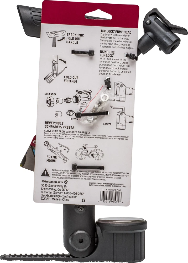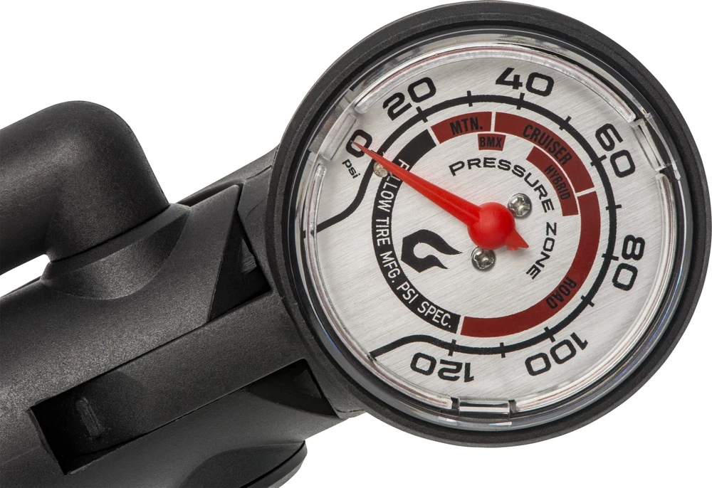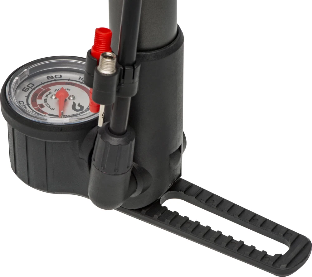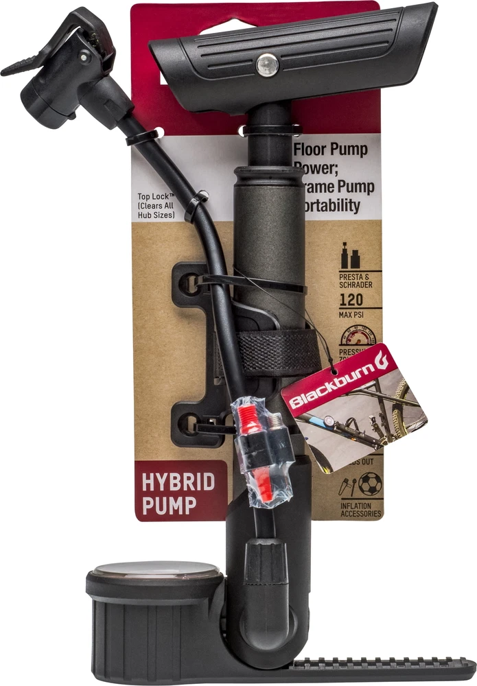 The Hybrid Bicycle Frame Pump gives the rider the best of both worlds: the stroke volume of a floor pump with the portability of a frame pump. The pivoting foot-peg stabilizes the pump in use while the reversible pump head works with both Schrader and Presta valves. The Pressure Zone Gauge up to 120 max PSI makes it easy to see when you've reached the perfect pressure for your tires. Includes inflation accessories and mounting bracket. Reversible pump head with exclusive Top Lock™ XL lever for easier use works with Presta or Schrader valves Built in 2" Pressure Zone gauge with convenient target inflation ranges by bicycle type in addition to PSI Pivoting T-handle for a secure grip while pumping Ball Needle and inflation cone included for all your inflation needs Wide barrel allows for quick and efficient tire inflation on the go, inflating tires up to a max 120 PSI