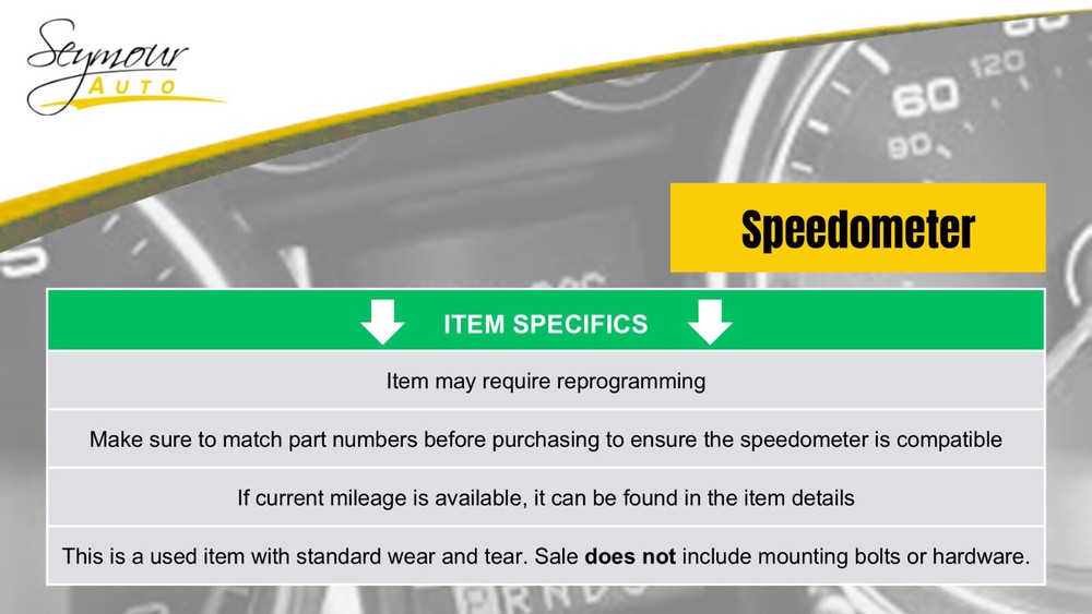 Hollander Welcome to our eBay store! Speedometer Cluster Blacked Out Panel MPH Fits 05 MAZDA 6 1044367 Description Donor Vehicle Model : MAZDA 6 Year : 2005 Mileage : 0 (0 = not available or unknown) Stock Number : 026500 Notes : This Part Will Fit These Makes And Models With These Options MAZDA 6 05 (cluster), blacked out panel, MPH, AT About Us Payment Shipping Returns Warranty About Us We are a locally owned business with over 70 years of experience in the automotive industry with an extensive collection of used car parts and accessories for thousands of different vehicles. Our knowledgeable and caring staff work hard every day making sure all of our parts are high quality and functional to fit your needs. We are happy to verify fitment for you prior to purchase via your vehicle’s VIN (Vehicle Identification Number). Please contact us with any questions prior to purchasing. Orders are sent to the shipping department throughout the day therefore we cannot guarantee adjustments to orders after payment is received. Payment Payment details: Please contact us with any questions prior to purchasing. Orders are sent to the shipping department throughout the day therefore we cannot guarantee adjustments to orders after payment is received. All orders must be paid in full prior to shipment. Payments are processed through eBay by eBay. If payment is not received within a reasonable time from when the order is placed, it will be cancelled without notice. All purchase prices are final. No price match or discount can be made while an item is awaiting payment. Shipping Shipping Details: Items are shipped after being paid in full. We only ship to US addresses within the continental 48 states. Shipping to AK, HI and PO Box's require a special rate and are subject to additonal charges. All parts listed with Free Shipping have a one day handling time and may not be picked up by the carrier the same day the part is ordered. Any estimated delivery dates provided are only estimates and are not guaranteed to be accurate. We are not responsible for any delays with UPS, Fed-Ex or USPS. We must be contacted same day if an item is received damaged. All address changes must be completed before the part is shipped. Address changes that take place after the part has been shipped are subject to an address change fee. Overnight and expedited shipping options are available for an additional cost. All parts listed as, Pick Up Only , can be shipped if the shipping cost is covered by the buyer. All parts listed as, Pick Up Only , will be held at Seymour Auto Wrecking (107 New Haven Rd, Seymour CT 06483) for the buyer. International orders are shipped via eBay’s Global Shipping Program. We are not responsible for any shipping charge associated with eBay's Global Shipping Program. We are unable to change the delivery address on all orders shipped through eBay's Global Shipping Program. eBay must be contacted directly. We are not responsible for any delays or issues reagrding any item purchased and shipped through eBay's Global Shipping Program. Returns All parts sold have a standard 30-Day return window. Return Details: We must be contacted within 30 days of the carrier provided delivery date for the return to be accepted. No return wil be accepted if contacted after 30 days from the carrier provided delivery date. We may require more information reagrding a return request. ex: pictures, receipts, videos, etc. A free return label will not be provided for remorse return reasons. ex: changed mind, ordered by mistake/by accident, didn't like it The buyer must ship the return within 21 days of receiving a return label or starting a return. All returns must be sent in the appropriote sized box with adequate packaging. Any return received damaged may be eligible for a refund deduction. All returns made must be occompanied with a return reason. All returns that are received without a reason will not be processed. If a return label is issued by eBay, we are not responsible for reimbursing the buyer for the cost of the label. In the event the part returned does not match the original part sent, a case will be opened up with eBay. Warranty All parts come with our standard 6-month warranty. Please contact us for more details prior to ordering. The warranty begins as soon as the buyer takes possession of the part. Standard 6-Month Warranty: If a part is proven to be defective within the 6 month warranty period, a replacement or refund will be sent at our discretion. We are not responsible or liable for any incidental or consequential loss or damage. We will require more information reagrding a warranty request. ex: pictures, receipts, videos, etc. No warranty claims or reimbursement on labor. All body parts are sold as is. Any part that is damaged or altered by the buyer will not be eligible for warranty or return. No warranty claim can be made based on color or trim package. We are not responsible for the buyer's error. ex: Accidental orders, late address changes. We do not offer an extended warranty with eBay. If you experience any issue with your part, please contact us prior to attempting to repair or remove the part. Failure to do so will void the warranty. We make no claim as to the suitability of any part for any particular purpose. The buyer is responsible for determining the suitability of the part purchased for its intended purpose. In the event an incorrect part is shipped, please contact us immediatley so an exchange can be processed. Copyright © 2022, All Rights Reserved. Template Design & Developed By: Copyright © 2022, All rights reserved. Design & Developed By : eFusionWorld