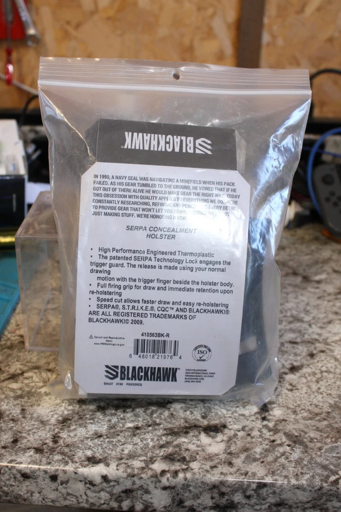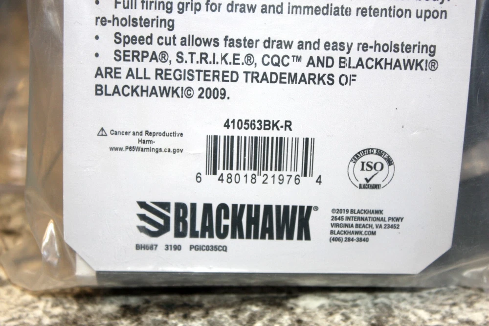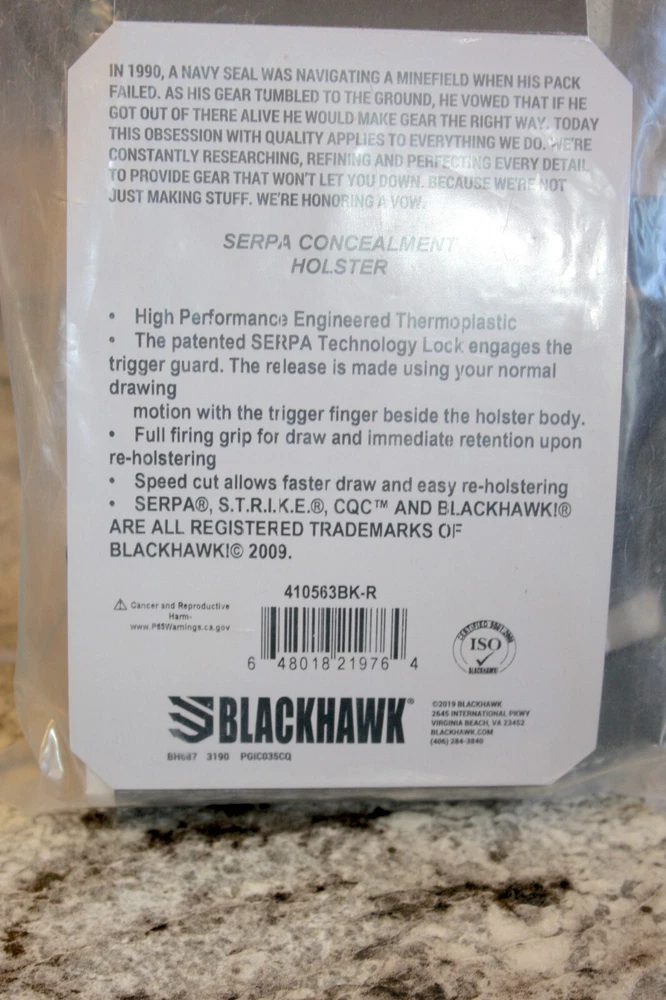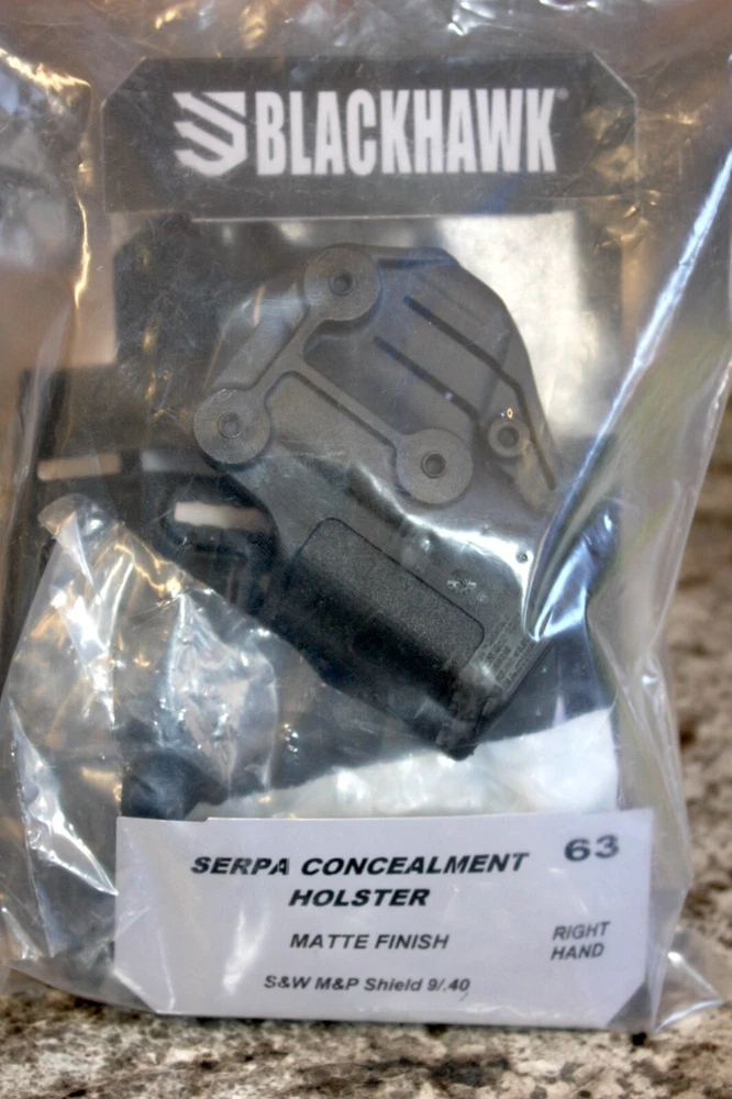 This is Brand new and has never been used STock # 160331830-XN/2.26XY The BlackHawk Serpa CQC Concealment Holster, Smith & Wesson M&P 9 Shield/Smith & Wesson M&P 40 Shield, Right Hand, Matte, Black, 410563BK-R Color: Black, Gun Make: Smith & Wesson, Gun Model: Smith & Wesson M&P 40 Shield, Smith & Wesson M&P 9 Shield, Barrel Length: 4 in, Hand: Right, Holster Type: Belt Holster, Paddle Holster, Holster Material: Injection Molded Polymer, Light/Laser Attachment: No, Attachment/Mount Type: Belt Loop/Slot, Paddle, Holster Size: 63, Finish: Matte, Quantity: 1, Fastener/Closure Type: SERPA, Condition: New, Fabric/Material: Injection Molded Polymer, Holster Finish: Matte The Blackhawk SERPA CQC Concealment Holster delivers unparalleled handgun security and a smooth draw in a compact, concealable package. The patented SERPA Auto-Lock offers Level 2 retention, and releases by simply dragging the index finger along the release in the draw cycle. The speed cut design promotes both a rapid draw and solid re-holster. A belt loop and paddle platform are included, and the SERPA CQC Concealment Holster also fits shoulder, S.T.R.I.K.E., Quick Disconnect and Tactical Holster Platforms, making it extremely versatile. Features: SERPA Auto Lock solidly secures firearm, only releases during draw cycle Aids in rapid draw, target acquisition and re-holster Belt loop, paddle platform included; also fits Shoulder, S.T.R.I.K.E., Quick Disconnect and Tactical Holster Platforms Passive retention detent adjustment screw aids in weapon retention Features of Blackhawk Serpa CQC Concealment Holsters w/Matte Finish SERPA Auto Lock solidly secures firearm, only releases during draw cycle Aids in rapid draw, target acquisition and re-holster Belt loop, paddle platform included; also fits Shoulder, S.T.R.I.K.E., Quick Disconnect and Tactical Holster Platforms Passive retention detent adjustment screw aids in weapon retention