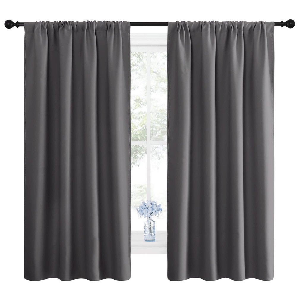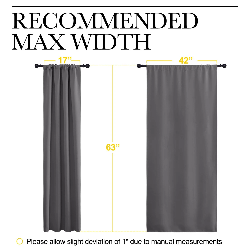 ELEGANT DESIGN: 2 panels per package. Each Blackout Curtain Panel measures 42 inches wide x 63 inches long. The drapery is constructed with rod pocket, fitting the curtain rod of your choice up to 2 inches in diameter, making the curtains easy to install and slide. LENGTH ADJUSTABLE: Don't worry if this blackout curtains are a few shorter than your windows. You can hang this curtain panels with rings and hooks. That could be adjustable for height max 3 inches. Hooks space distance around 4-6 inches. AMAZING MATERIAL: This unique, soft and heavy-duty blackout fabric is woven with three-layer construction. The middle layer of black yarns creates a curtain panel that is excellent for blocking out 85%-99% of light (Dark color works better on blocking light) while providing privacy. GOOD CHOICE: Perfect drapery option for anyone seeking to block daylight, take a nap, or keep sun glare off your TV. Besides, you can choose blackout valance and sheer curtains in the store to match. Such curtain sets provide a more permanent harmonious window dressing. EASY MAINTENANCE: Machine or hand washable. Mild detergent no bleaching. Low-temperature ironing. Measure your pole and window size before you choosing curtains.