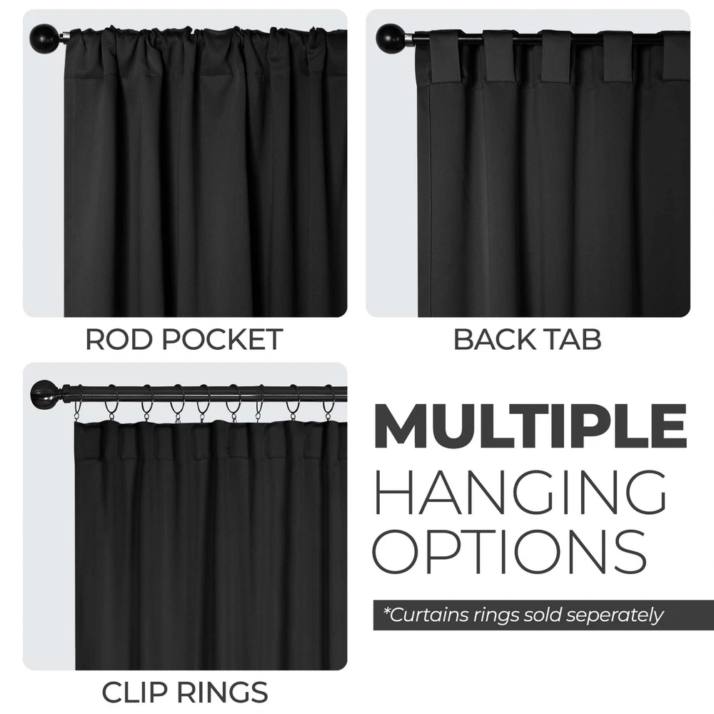 Update the look of your windows with the Solid Classic Modern Blackout Curtain Set. This lovely panel duo reduces up to 70% of sunlight and UV rays and features a triple-weave for thicker, more decadent curtains. The 4” back tab header offers three stylish installation options: neat and streamlined back tabs, a rod pocket, or the ability to attach clip rings (sold separately), all designed to enhance the elegance of your home with ease. Available in an assortment of solid colors and sizes, these curtains will provide a tailored finish to any windows in your home. DURABLE AND MORE PRIVACY: Crafted from 100% polyester, our blackout curtains block 70-80% sunlight and UV rays; Thick triple-weave helps maximize privacy and reduce noise; Perfect room darkening curtains for bedroom, living room, room or nursery ENERGY SMART: Thermal insulating fabric balances room temperature and helps to protect your home from summer heat and winter chill; Stay comfortable and protect your furniture and home decor from sunlight damage with these curtains VERSATILE HEADER: 52" width curtains with 4” back tab header offers three stylish installation options: streamlined back tab, rod pocket, or attached clip rings (sold separately); make a tailored finish to your living, dining, or bedroom GORGEOUS COLORS: Discover a timeless solid pattern in a stunning array of color options: Aqua, Black, Cappuccino, Chrome, Grey, Ivory, Light Blue, Marshmallow, Mauve Chalk, Navy Blue, Olive, Green, Sage, Sangria, Silver, Smoked Ash, Snow White, Wisteria EASY TO MAINTAIN: For luxurious results, these polyester curtain panels are easily machine washable; Wash cold on gentle cycle; Tumble dry low; Do not bleach; Press with warm iron when needed; Always care label instructions for best results