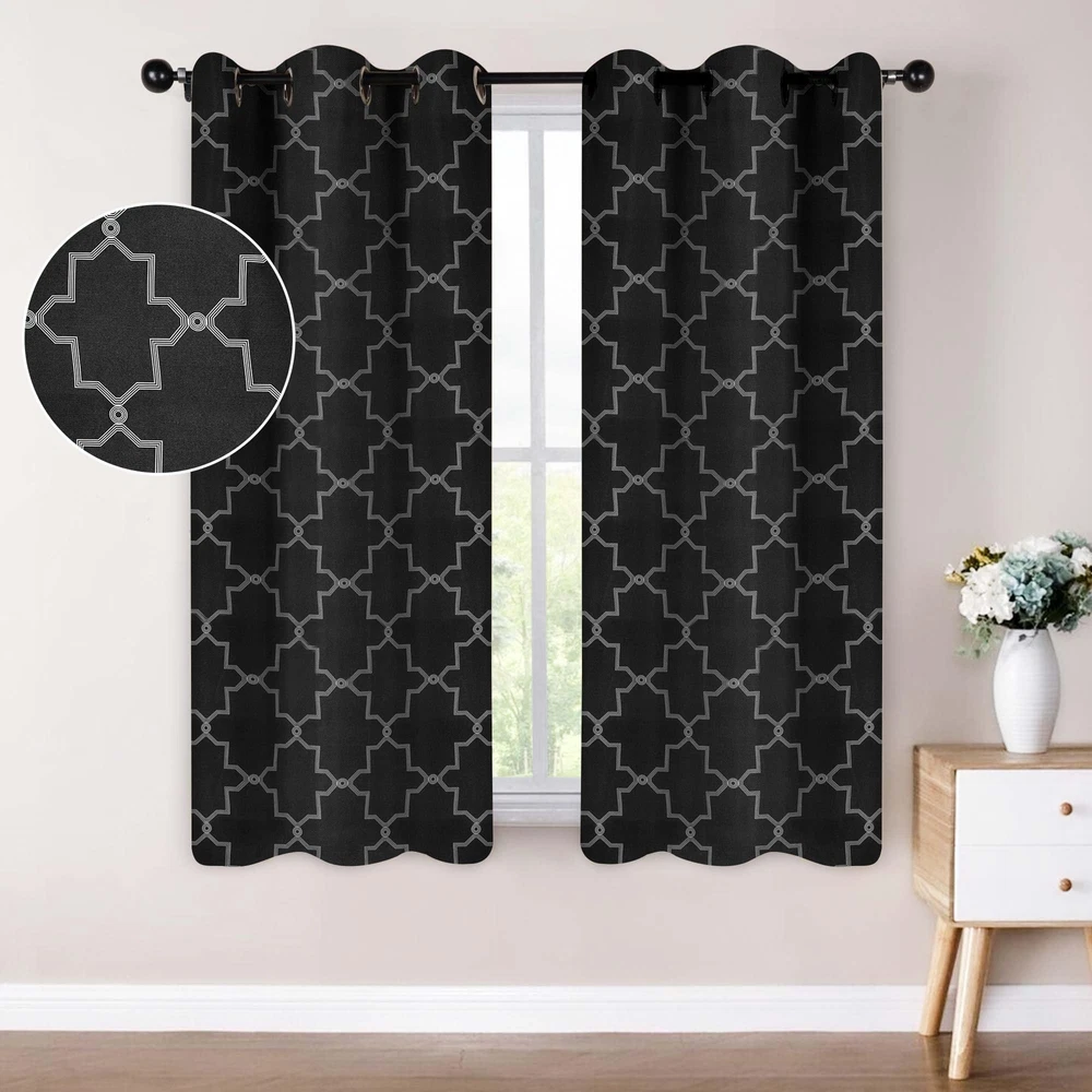 Sleep in utmost comfort and with the exquisite Trellis Blackout Curtains. This lovely panel duo reduces up to 70% of sunlight and UV rays and features a triple-weave for a thicker, more decadent curtain. Crafted from 100% polyester with rod pockets or a stainless grommet header (depending on size), these curtains are durable and modern in design. Available in various colors and sizes, the gorgeous lattice pattern has a versatile matte finish that adds timeless beauty to your decor. DURABLE AND PRIVACY-ENHANCING: Crafted from 100% polyester, our blackout curtains block 70-80% of sunlight and UV rays; the thick triple-weave fabric maximizes privacy, making them perfect for bedrooms or living rooms; Set Includes: (2) Curtain Panels ENERGY SMART: The thermal insulating fabric balances room temperature and helps protect your home from summer heat and winter chill; impress your guests while staying comfortable, and protect your furniture with these prestigious and versatile curtains VERSATILE HEADER: Drape these curtains with style and convenience; depending on size, the curtains feature different headers: 26" width curtains come with a rod pocket header, while 42" and 52" width curtains feature stainless steel grommet headers EASY TO MAINTAIN: For luxurious results, these polyester curtain panels are machine washable; wash cold on a gentle cycle and tumble dry low; do not bleach; press with a warm iron when needed; always care label instructions for best results EXCELLENT GIFT: Our curtain designs match a variety of styles and make great gifts for friends and family; perfect for weddings, housewarmings, or any holiday; instantly update any room in your home, dorm, or apartment with this curtain panel set