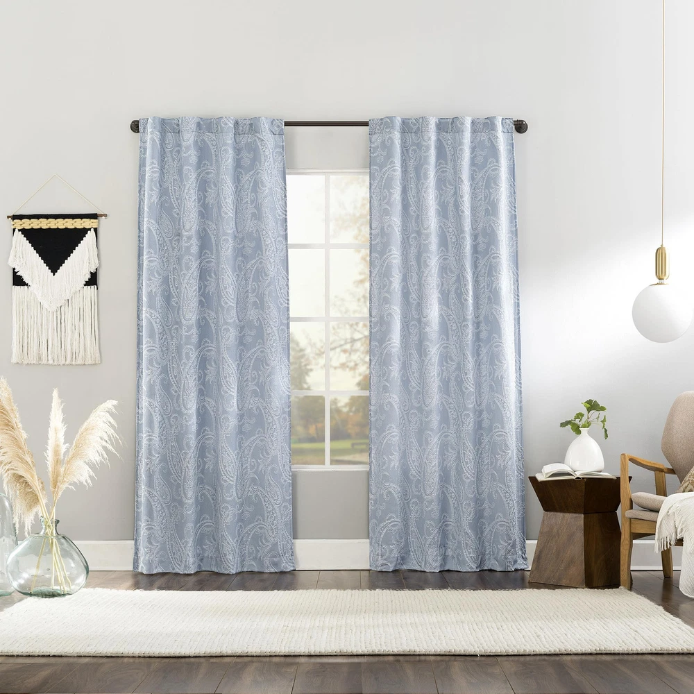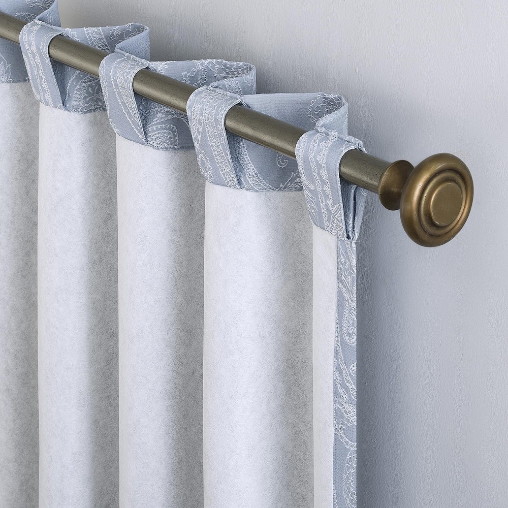 Featuring an intricately embroidered paisley pattern, Pedra Paisley Embroidery 100% Blackout Back Tab Curtain Panels add delicate detail to any living space. Equipped with back tabs for easy hanging on standard curtain rods up to 1.5" in diameter. Extreme Blackout™ Thermal Lining is laboratory tested to block out 100% of light, reduce outside noise by up to 40%, and decrease energy lost through your windows by up to 40%. Comfort is optimized with thermal properties that help keep summer heat and winter chill out of your home. Built-in metal grommets allow for easy slide-through installation on curtain rods up to 1.5" in diameter. Hang in your entertainment room to eliminate screen glare and reduce distracting outside noise, or in your bedroom for enhanced privacy and a sounder, more uninterrupted sleep. Sold as individual panels measuring 40" width by 84" length in color tranquil blue. Measure carefully before selecting your desired size and quantity. Rod not included. Machine wash cold on gentle cycle. Use non-chlorine bleach when needed. Tumble dry on low heat, using a cool iron as needed. Intricately embroidered paisley pattern adds delicate detail Extreme Thermal Blackout technology blocks out 100% of outside light Thermal properties help keep summer heat and winter chill out of your home Noise reduction up to 40% helps you get a sounder, more uninterrupted sleep back tabs fit curtain rods up to 1.5" in diameter Panels sold individually. Measure carefully prior to purchase (Image features 2 panels)