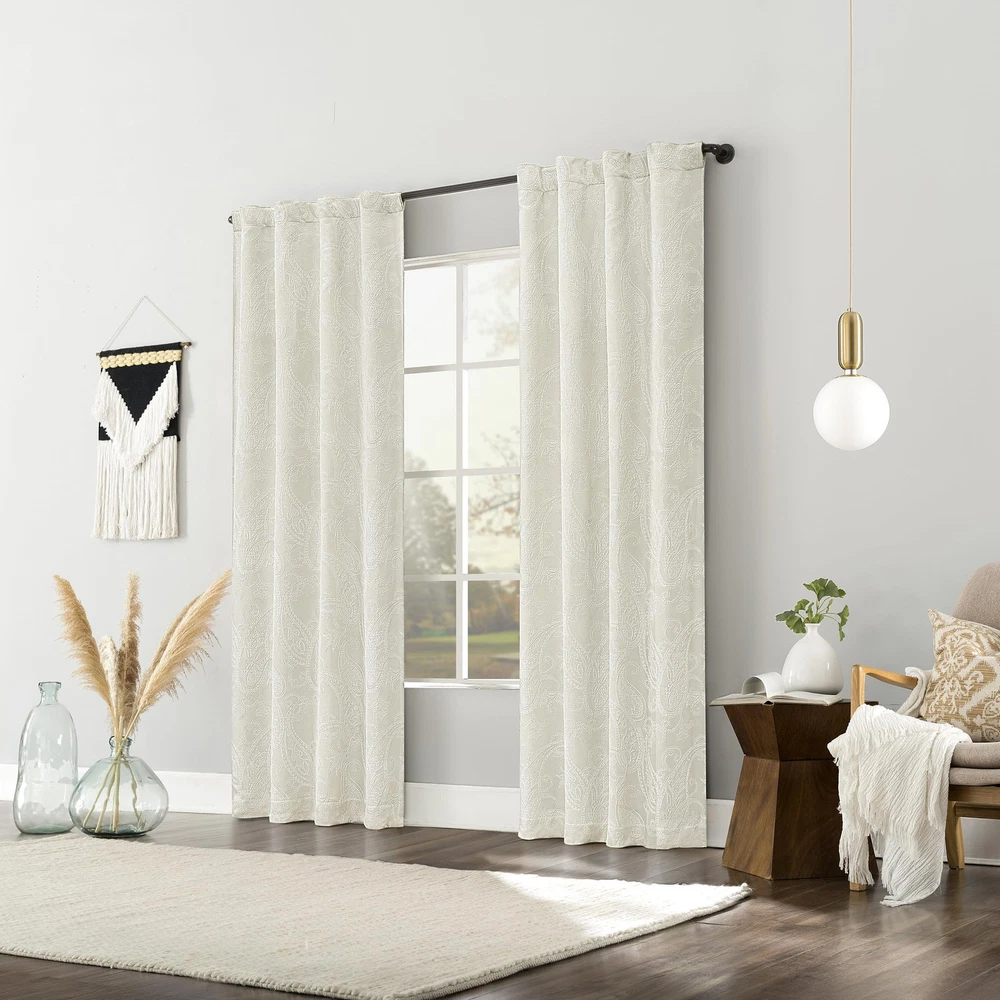 Featuring an intricately embroidered paisley pattern, Pedra Paisley Embroidery 100% Blackout Back Tab Curtain Panels add delicate detail to any living space. Equipped with back tabs for easy hanging on standard curtain rods up to 1.5" in diameter. Extreme Blackout™ Thermal Lining is laboratory tested to block out 100% of light, reduce outside noise by up to 40%, and decrease energy lost through your windows by up to 40%. Comfort is optimized with thermal properties that help keep summer heat and winter chill out of your home. Built-in metal grommets allow for easy slide-through installation on curtain rods up to 1.5" in diameter. Hang in your entertainment room to eliminate screen glare and reduce distracting outside noise, or in your bedroom for enhanced privacy and a sounder, more uninterrupted sleep. Sold as individual panels measuring 40" width by 96" length in color pearl white. Measure carefully before selecting your desired size and quantity. Rod not included. Machine wash cold on gentle cycle. Use non-chlorine bleach when needed. Tumble dry on low heat, using a cool iron as needed. Intricately embroidered paisley pattern adds delicate detail Extreme Thermal Blackout technology blocks out 100% of outside light Thermal properties help keep summer heat and winter chill out of your home Noise reduction up to 40% helps you get a sounder, more uninterrupted sleep back tabs fit curtain rods up to 1.5" in diameter Panels sold individually. Measure carefully prior to purchase (Image features 2 panels)