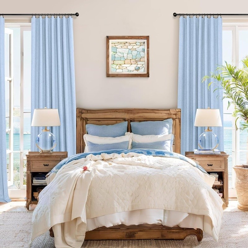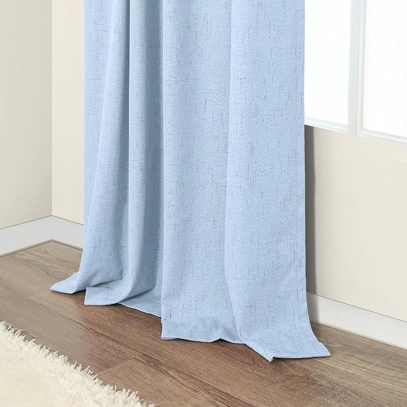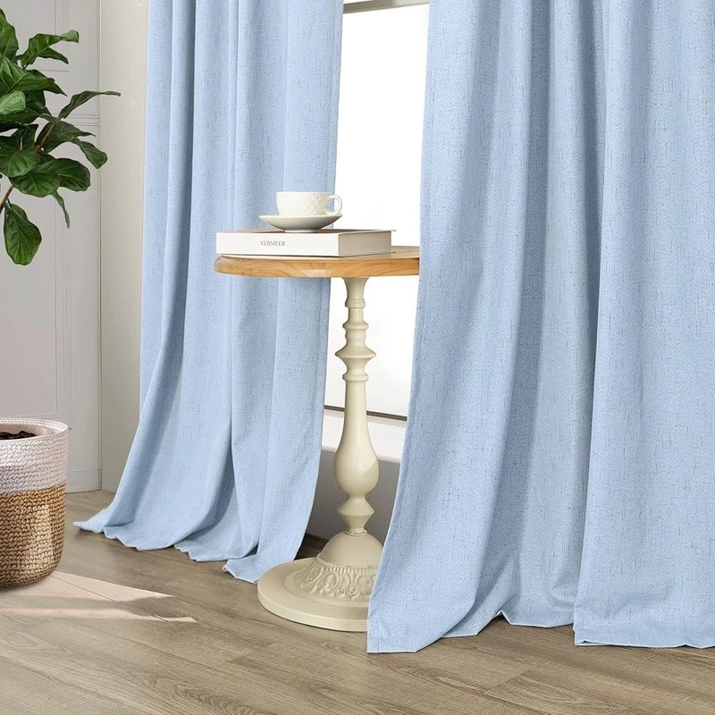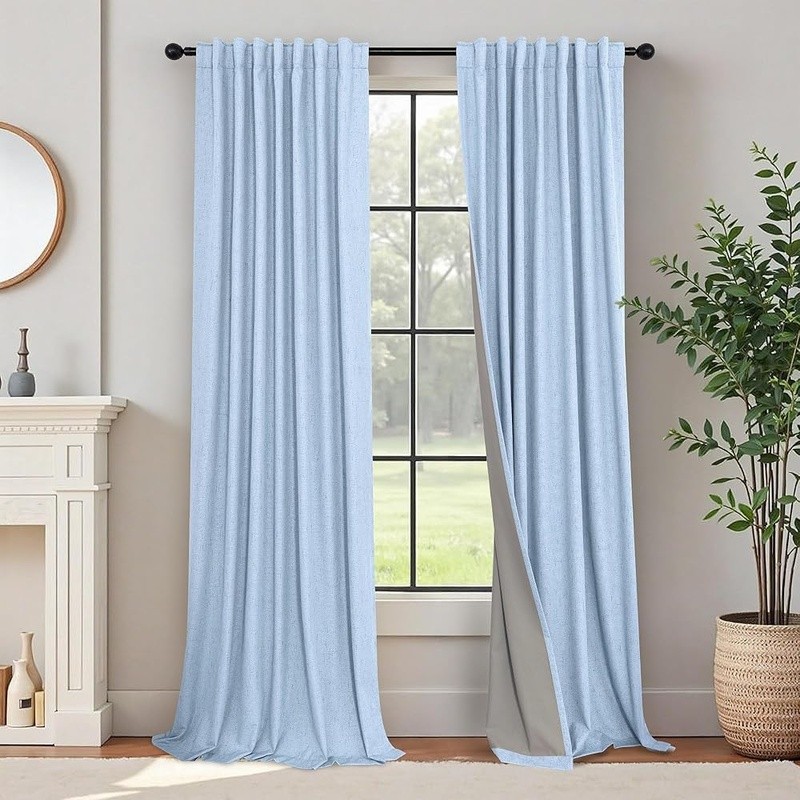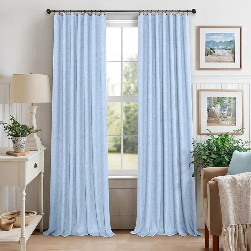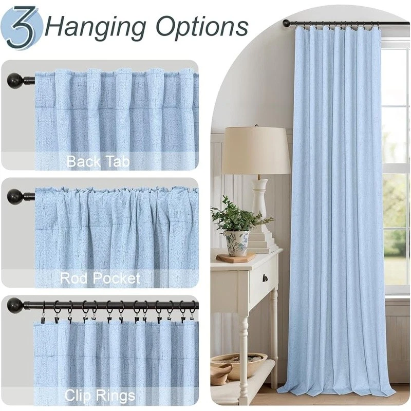 About this item Pair Sold: 2 panels per package. Each panel measures 52 inches wide by 108 inches Long, pair measures 104 inch width x 108 inch Length. 3 in 1 hanging style includes (1) using the back loops to create an elegant pleated effect, (2) from the 3 inch rod pocket for a classic look, or (3) using clip rings for easy, slide open and closed (clip rings not included) 100% Blackout Curtains: A total blackout thermal coating layer is attached to the back of our faux linen curtains, blocking 100% of sun light and UV rays. Providing a completely dark environment for sleep and privacy. Good choice for bedroom, nursery room, kids room, living room, dining room, office, sliding glass door Beautiful Linen Style Texture: black out curtains are crafted from thick, textured linen look fabric. The 250gsm fabric allows the panels to drape well while remaining lightweight and soft, similar to linen and cotton. Affordable dupes of expensive real linen cotton drapes. Burlap and neutral tones create a more classic look. Perfect for boho, modern farmhouse, shabby chic, country, rustic, vintage decorations Energy Smart: thermal insulated blackout shades are not only light blocking and room darkening but also provide thermal insulating, noise reducing, and heat blocking in summer while reducing indoor heat loss in winter to maintain a balanced temperature, achieving energy savings Easy Care: Cool iron on the FRONT SIDE if needed. DO NOT iron the coating on the back side. Machine washable in cold water, do not bleach, tumble dry low. To better protect the coating, avoid using the dryer. Find more linen curtains in Store › Brand: Color: Light Blue Material: Polyester Product Dimensions: 108"L x 52"W Opacity: Blackout Inches