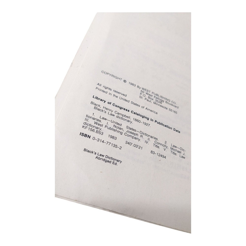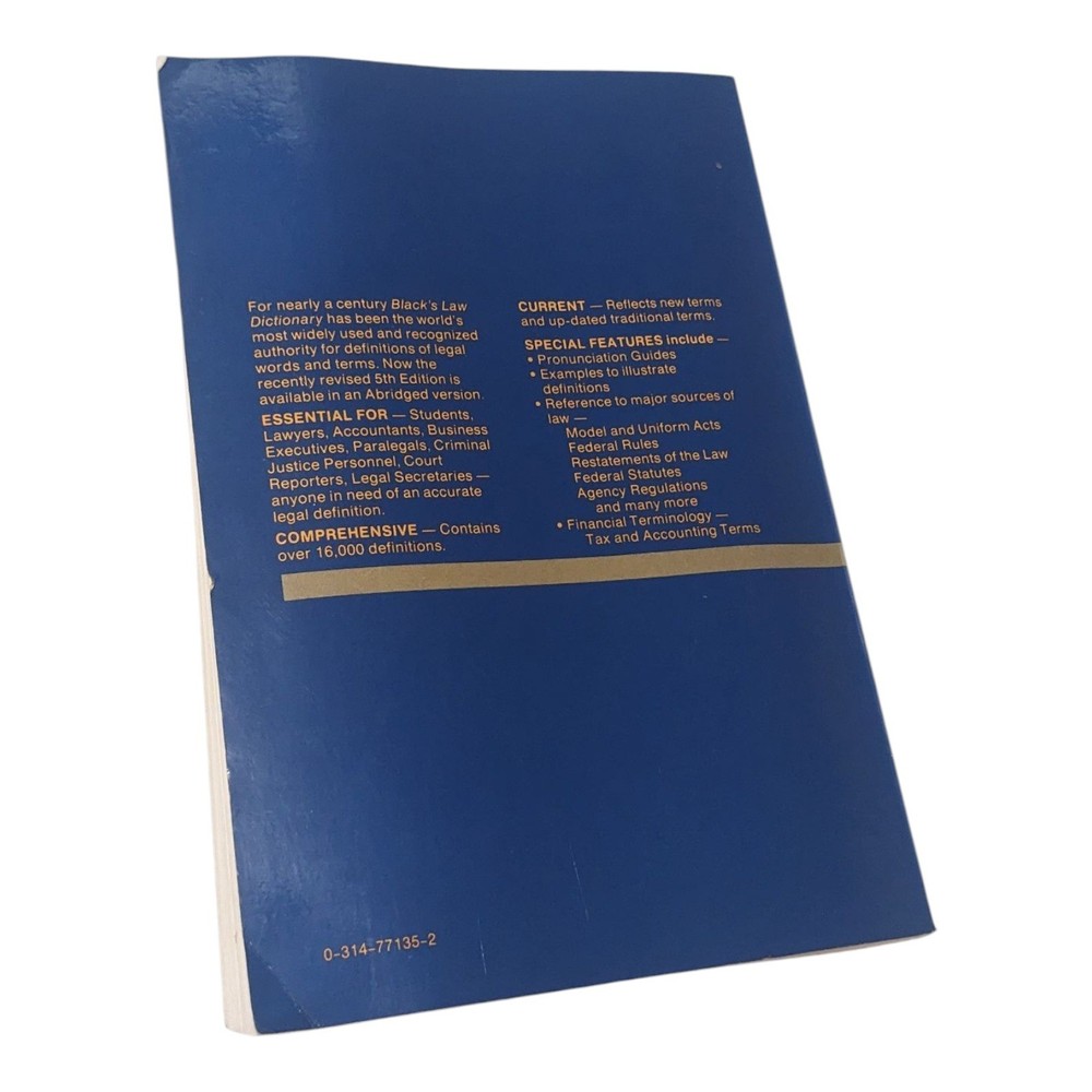 Abridged Fifth Edition of Black's Law Dictionary, a renowned legal reference book offering definitions and pronunciations for legal terms. This edition, copyrighted in 1983 by West Publishing Co., is an essential resource for students, lawyers, accountants, business executives, paralegals, criminal justice personnel, court reporters, and legal secretaries. The dictionary contains over 16,000 definitions and includes special features such as pronunciation guides and examples to illustrate definitions. It also references major sources of law, Model and Uniform Acts, Federal Rules, Restatements of the Law, Federal Statutes, Agency Regulations, Financial Terminology, and Tax and Accounting Terms. The abridged format makes it a convenient and comprehensive tool for anyone needing accurate legal definitions. Keywords: Black's Law Dictionary, Law Dictionary, Legal Dictionary, Abridged Edition, Fifth Edition, Law Reference, Legal Terms, Dictionary, 1983 Edition, Legal Definitions