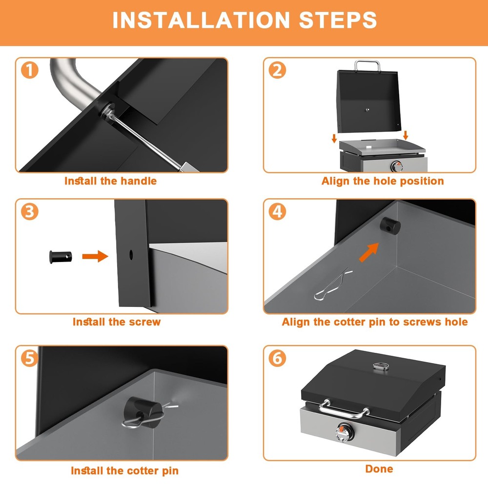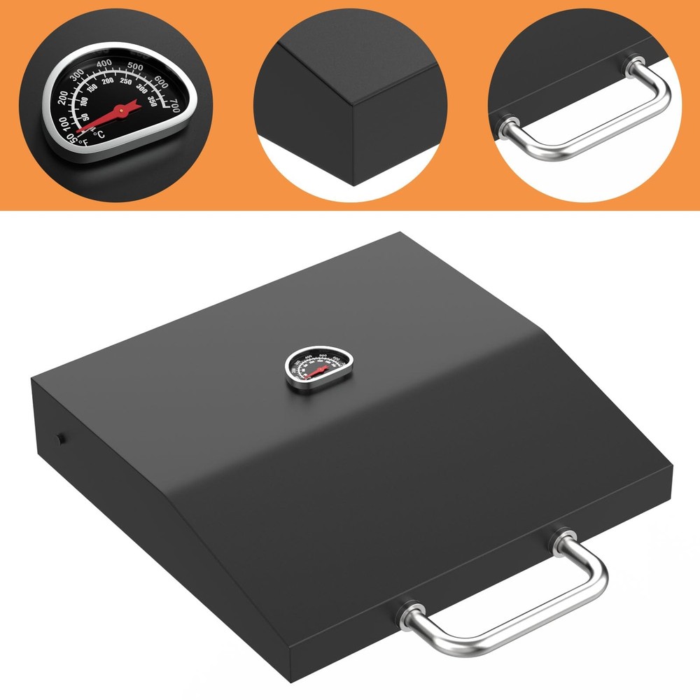 17 inch Griddle Lid for Blackstone 17 inch Griddle Hood 1832 Adventure Ready Tabletop Griddle, for blackstone tabletop griddle Blackstone 1971 17 inch Griddle Accessories,Blackstone 17 inch Hard Cover &Blackstone Lid Replacement The griddle lid with temperature gauge fit these Blackstone 17 inch grill Griddles: Hard cover for Blackstone Adventure Ready 1832 17 Inch Griddle; Hard cover for Blackstone 1971 Flat Top Grill Station Griddle. Specification: Package Includes 1-Pack griddle hood for Blackstone with temperature gauge and mounting screws.(Note: The screwdriver is not included). Material: It is made of high-quality black lacquered steel; Color: Black. Great for blackstone 17 inch hard cover, blackstone griddle cover 17 inch, blackstone 17 inch griddle hood 1832. Customized specifically for blackstone adventure ready 1832 17 inch tabletop griddle and blackstone 1971 grill lid(model before Year 2021). Plaease Note: The griddle lid only fits blackstone 1832, 1971(model before Year 2021), and it doesn't fit blackstone 5010 models. The lid can be easily opened and closed from the front of the Blackstone grill. Install it once and you'll be completely hands-free. Not only can it be stored on its own, but it does not have to be lifted up and hung on the back of the griddle grills. The 17 inch hard cover is made of high-quality materials and is waterproof. When stored outdoors, it will help protect the surface of your Blackstone grill from rust. While cooking, this lid will ensure that heat does not leak out, reducing your cooking time. The included thermometer gives you more control while cooking. High quality stainless steel handle: comfortable to hold and very easy to open and close the lid. Easy to install and clean.A must have for your blackstone 17 inch grill griddle! Package Includes 1-Pack griddle hood for Blackstone with temperature gauge and mounting screws.(Note: The screwdriver is not included). If you receive our griddle lid and have any problem, please feel free to us, we will definitely solve it for you at the first time.