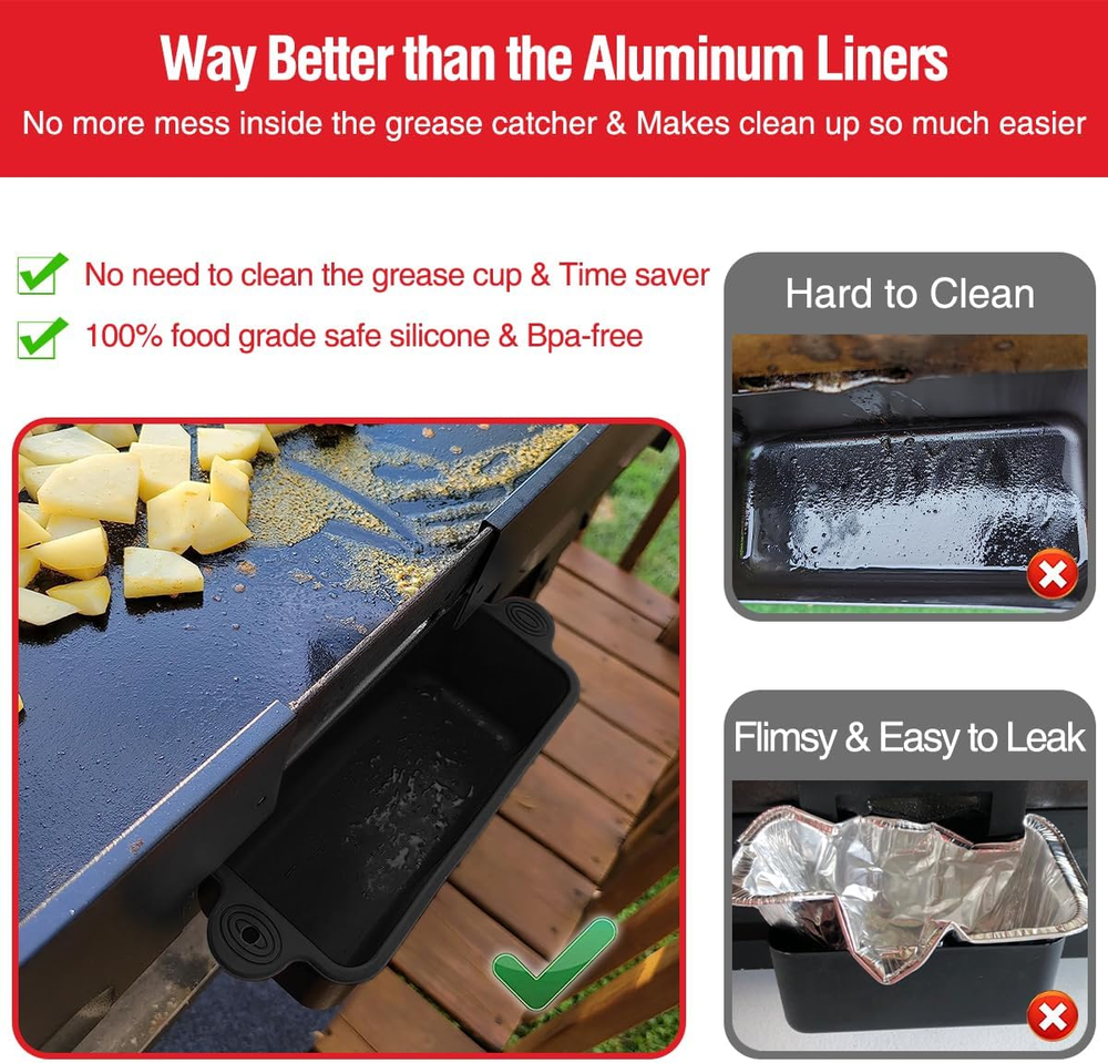 Store New Arrivals Add to Favorite View Feedback Contact Grease Catcher Drip Pans for Blackstone 28 & 36 Inch Griddle, Replacement Description Item model number fyouhe-heise2pk Item Weight 0.22 Kilograms Color Black Material Silicone Country of Origin China Is Dishwasher Safe Yes Has Nonstick Coating No Shape Rectangular Package Dimensions 8.43 x 3.07 x 2.05 inches Must Have Blackstone Griddle Accessories: 2 Pack Silicone Grease Cup Liners for Blackstone Grill. No more scrubbing and scraping the grease and residue from the griddle, makes your cooking/grilling experience easier and more enjoyable. Silicone grease cups measure 7 x 3.3 x 2.8 inches and are designed to fit perfectly on 36/28/22/17 inch Blackstone grills Easy to Clean & Dishwasher Safe: These reusable drip pan liners make cleaning the grill a breeze. Cleaning the liners is incredibly easy too. You can either wash them with ordinary detrgent and water or just wipe with paper towel and throw them in the dishwasher, allowing to quickly remove any grease or residue without any hassle Better than the Aluminum Foil Pans/Liners: Still keep buying disposable aluminum foil pans? Aluminum foil pans are easy to leak, easy to blow away, and the griddle grease catcher will be an absolute mess. Silicone are soft so no worry about accidentally cutting the fingers on the foil pans. No more wasting money on a lot of disposal foil trays. Great value actually saves you money and pays for itself almost immediately Reusable, Durable & Heat-Resistant: The Grill Grease Cup Liners are made of heat-resistant silicone material that can withstand high temperatures and rough outdoor conditions. They are also reusable, which is great for the environment and your wallet. Unlike disposable foil trays, these silicone trays are non-t0xic, non-hazard0us, and can be used over and over again. The silicon pan is also much easier to remove than regular aluminum pans for disposal of grease and cleaning Keep Your Griddle Clean & Extend the Life of Your Griddle: The Grill Grease Cup Liners provide a convenient, efficient, and eco-friendly solution for keeping your grill clean. If you're looking for a reliable and affordable way to make your grilling experience easier, these silicone Blackstone grease cup liners are definitely worth considering AKSDTH 2 Pack Blackstone Silicone Grease Cup Liners for 36 28 22 17 Inch Griddle, Reusable Grease Catcher Liner Grill Grease Tray Blackstone Accessories, Replacement of Aluminum Foil Drip Pans, Black ABOUT US We offer high-quality home products at competitive prices. At laydremgoodsofficial , we're committed to providing a seamless and satisfying shopping experience with a touch of American comfort. SHIPPING We are always working hard to ensure your package arrives as soon as possible. Please understand that some factors like weather, high postal traffic, and the performance of shipping companies are outside of our control. We offer free shipping to the lower 48 states and ship within 2 business days of payment, usually sooner. We do not accept P.O. Boxes. Please provide a physical address. Orders ship within 1–2 business days after payment Standard delivery: 3–5 business days Expedited shipping options available U.S. domestic orders only RETURNS We offer a 30-Day Return Policy on items which you are not completely satisfied with. You have the option for a full-refund or an exchange of the item. Item must be in original condition Original packaging and tags included Return request made within 30-day window For assistance, message us through eBay. PAYMENT Our Payment methods managed by eBay. CONTACT US This page content is yet to come Please ad us to your favorite seller and visit again later Thank You WHY BUY FROM US U.S.-based & fast shipping Premium quality home & travel accessories Top-rated customer satisfaction Responsive and friendly communication CUSTOMER SATISFACTION We try our very best to make sure every customer is completely satisfied. If there's a problem, message us! We're happy to help. We're available 24/7 via eBay messaging. Whether you have questions about products, tracking, or returns — we're here to help!