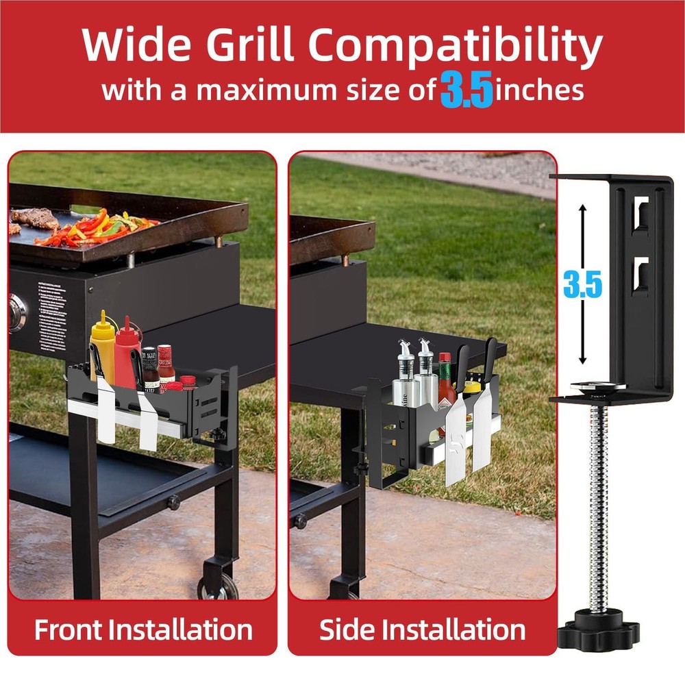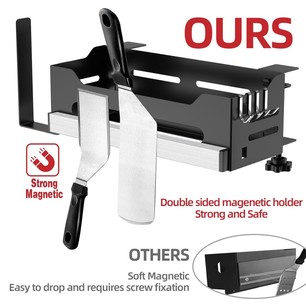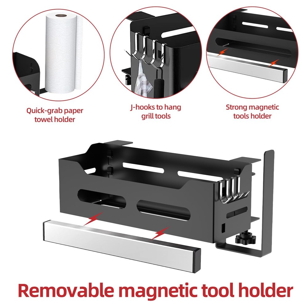 Blackstone Caddy, Grill Griddle Caddy for Blackstone 28"/36" Griddles, Space Saving Blackstone Griddle Caddy, BBQ Blackstone Accessories Caddy with Paper Towel Holder & Magnetic Tool Holder Ample and Functional Tool: Our Blackstone caddy boasts a paper towel holder, 4 J-hooks, and a magnetic tool holder, offering generous storage for all your grilling necessities. By clearing your countertop, our griddle caddy opens up more room for preparation and maintains a neat workspace, guaranteeing a seamless BBQ party. Versatile Fit with Various Countertop: Our outdoor Blackstone griddle caddy provides stability and versatility for griddles beyond 28 or 36 inches. Our Blackstone storage securely fits on side shelves, tables, or countertops, ensuring convenient access to your Blackstone accessories. Easy installation of the Blackstone tool holder ensures a swift start to your grilling enjoyment. Improved Strong Magnetic Strip: Our double-sided magnetic strip ensures a secure placement for your Blackstone griddle accessories, providing superior stability. Say farewell to accidental slips and loose items—our Blackstone accessories caddy offers a dependable hold, without the need for screws. Paper Towel Holder & 4 J-Hooks: Featuring a paper towel holder, our Blackstone grill caddy allows for easy and quick clean-up during your grilling sessions. The stable J-hooks ensure your tools stay securely in place, without any wobbling or accidental drops. This thoughtful design aims to enhance your barbecue experience with added convenience and efficiency. Package: You will receive 1 versatile Blackstone caddy, 1 paper towel holder, 1 magnetic tool strip, 4 J-hooks, and 2 clamps, all backed by our reliable 24-month warranty and our consistently friendly customer service.