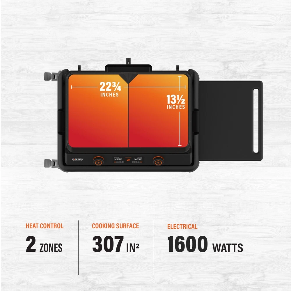 Product details Bring what you love about cooking on a Blackstone indoors with this Blackstone E-Series 22” Electric Tabletop Griddle with Prep Cart. Whether you want to place this griddle right on your tabletop or use the cart to wheel it out onto your patio, this electric griddle and cart combination means you can cook on your Blackstone indoors or outdoors. This griddle includes a digital temperature display and a removable transparent glass hood that allows you to easily keep an eye on your food. The non-stick griddle surface and Blackstone-patented Rear Grease Management system make grease management and cleanup so much easier. With 312 square inches of cooking space and two variable temperature zones, you can create delicious and savory meals for breakfast, lunch, and dinner whether indoors or out. Blackstone E-Series 2-Burner 22" Electric Tabletop Griddle with Prep Cart 312 sq in cooktop surface with 2 independently controlled burners Non-stick ceramic titanium-coated griddle surface for easy cooking and cleanup Large LCD digital display for easy readability The patented rotate and remove glass hood provides sleek protection and traps heat for cooking and steaming The Blackstone-patented Rear Grease Management System and a dishwasher-safe grease cup make cleanup quick and easy Counter-height cart with a folding side shelf makes it possible to use the griddle indoors or outdoors 1600W/120V/10A electrical requirements Assembled dimensions (including cart): 37.62" L x 20" W x 40.16" H 1-Year Limited Warranty Customer Service: +1 (435) 252-3030 Ext. 1 Model # 8003