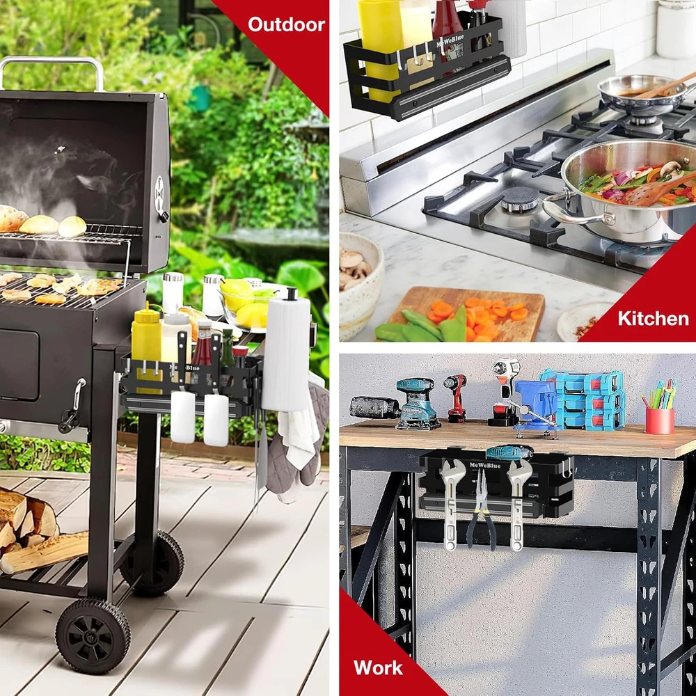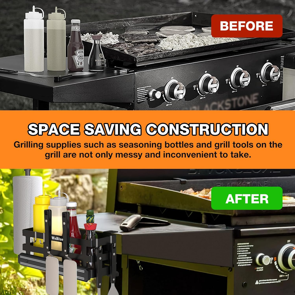 Griddle Caddy Organizer Grill Accessories Holder for Blackstone 28€?-36€? Griddle 【EFFORTLESS SETUP】— Tight the 2 mounting brackets on your Blackstone griddle's side shelf, and hang our grill caddy on them. Next, install the magnetic tool holder with the included 2 screws. Your Blackstone griddle accessories and seasonings will be beside your hand with this griddle caddy. 【SPACIOUS INTERIOR】 — (BOTTLES AND SPATULAS NOT INCLUDED) 4 bottles can enjoy this spacious BBQ caddy with its large space design (L=13.0” x W=4.3” x H=4.7”). Including many rain holes under this griddle tool holder to keep itself and your griddle accessories dry. 【PORTABLE DESIGN】— Travel light with this griddle caddy. The caddy will weigh just 3.5 lbs. Perfect for use as a camping kitchen, mount it on your camping table, make camping cooking in good order, and help the camping table to release the space to put your dishes! 【STORAGE MORE】 — The 6 polished hooks can be hung anywhere on this BBQ utensil holder, Hanging them on the side closest to you is the best option for easy access to your grill accessories without bending over. The magnetic tool holder is a great addition to holding your spatula. 【ANTI-SLIP & ANTI-SCRATCH】— 4 silicone gaskets can be used to stuck on the place where the mounting brackets are in contact with the flat top grill. Anti-slip function keeps the griddle caddy stick tightly to your grill, anti-scratch function Reflected in Isolate metal and metal contact, protects the surface of your griddle. Product Description Designed for Blackstone griddle, grill, table and kitchen. Makes your countertop neater and provides more space for you. Storage all of your barbecue accessories and seasonings, to make cooking easier. Removable and Clamped Hooks The J hook's rear end is clamped, and very stable. Won't fall out of the hole like the S hook. Always still, won't wobble like the S hook, and easy access to grilling tools. Hang the hooks higher and closer to you, you don't have to bend over so hard to get your tools and the accessories will stay on your fingertip. Spacious Interior L=13.0” x W=4.3” x H=4.7” The caddy can hold about 6 bottles, your seasonings will be easily accessible, and the countertop can be used to place your dishes, making your cooking more organized and comfortable. Detachable Magnetic Strip Very easy to install on caddies or ovens or in places like kitchens and warehouses, supplied with black screws in the same color as the magnetic strip, solve the trouble that some people don't like silver screws. Protect Your Griddle Silicone gaskets will avoid direct contact between your griddle and the metal mounting bracket, protect your griddle from scratches and rust, and there is also anti-slip effect, making the caddie more stable. No Drill & Fast Installation Mounting bracket already assembled Install the magnetic tool holder. Tight the 2 mounting brackets. Slip the caddy in the lip of 2 brackets. High Load-bearing Capacity The installation method that conforms to engineering mechanics creates the strong bearing capacity of our caddy, so it can hold up to 30 lbs, keep your accessories very well! Item model number SK200(MAGNET) Included Components 1 x Griddle Caddy, 1 x Magnetic Tool Holder, 2 x Mounting Brackets, 6 x Hooks, 4 x Silicone Anti-slip Gaskets Room Type Kitchen Assembly Required Yes Shelf Type Hanging Shelf Color Black Special Feature Manual Product Dimensions 4.3"D x 13.1"W x 4.7"H Material Alloy Steel Country of Origin China Style Modern Item Weight 3.52 pounds Indoor/Outdoor Usage Indoor Number of Shelves 1 Mounting Type Hanging Size SK200(Magnet) Finish Type Polished Recommended Uses For Product Tools Shipping Fast shipping is very important for us. Our expedited US shipping service is FREE. Your order will be shipped within 2 business days upon full payment received. Your order will be delivered within 2-3 business days after the handling time. Warranty & Returns 30-Day FREE Return Policy offered for unsatisfactory items. Options include: Refund or Exchange for another item. Contact us Customer satisfaction is our top priority. If you encounter any issues with our product, please don't hesitate to reach out to us. We are committed to ensuring your satisfaction and will go above and beyond to assist you. Your happiness is our goal! Thank you for shopping at our store.