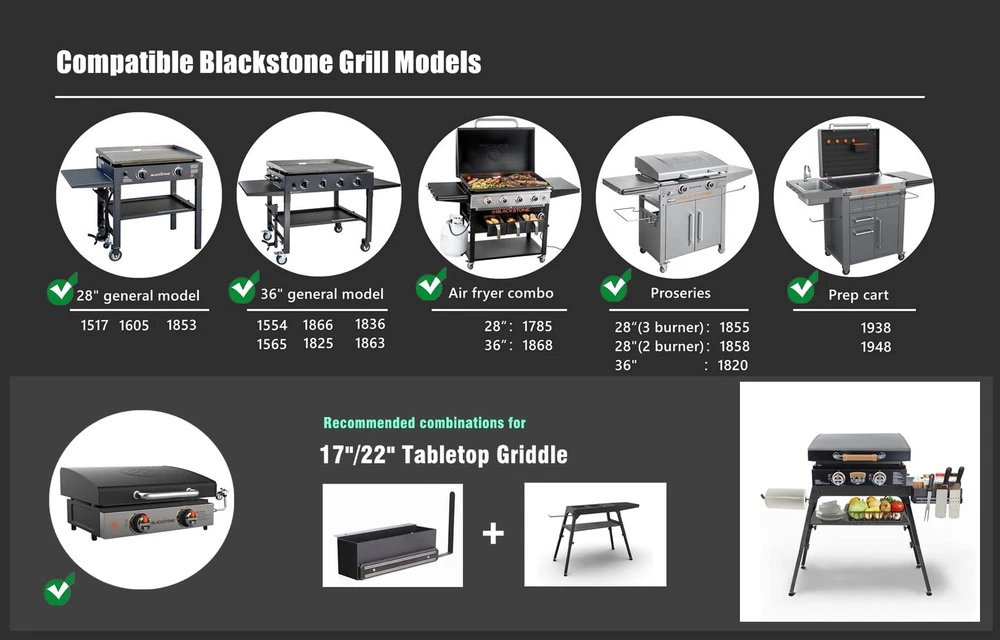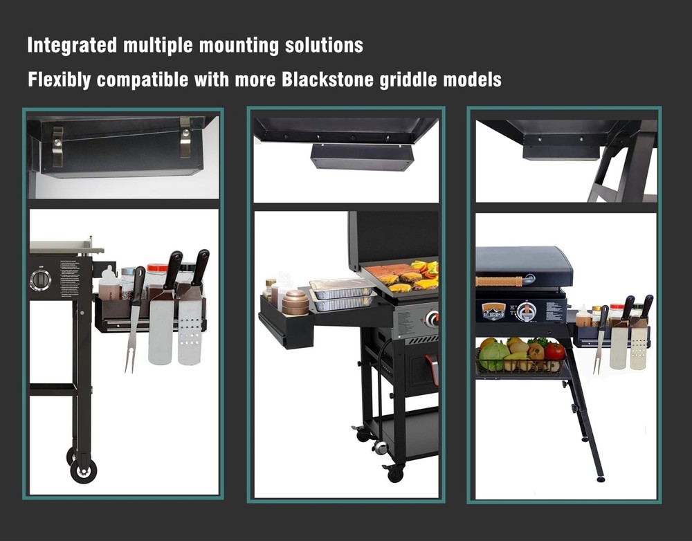 1 BBQ ๐ ๐ฎ๐๐๐ฒ๐ฟ'๐ ๐ ๐๐๐-๐๐ฎ๐๐ฒ - Enhance your cooking experience, This compact griddle caddy will keep all BBQ utensils, sauces, oil bottle, spatulas, Scraper, and others are all within your reach Fully Compatible โ The improved assembly solution allows this caddy to be compatible with multiple models of Blackstone griddle, Include 17 inch, 22inch, 28 inch, 36 inches, Pro-series, and Air-Fryer Combo, Please refer to the product description for compatible model list Perfect Match โ Made of the same materials and coating process as your Blackstone griddle, perfect match, just like the original parts Easy to Install - For all compatible models of griddles, You can install it in just a few minutes, The "z" type mounting plate can firmly fix the caddy on your griddle PLEASE NOTE - if you need this caddy to work on a 17-inch or 22-inch tabletop griddle, the heat from the combustion chamber may damage the items placed in the caddy because the installation location is close to the air outlet, such as squeeze bottle. So you may need to install wind guards for your Tabletop griddle to block the heat. no worry for other griddle models