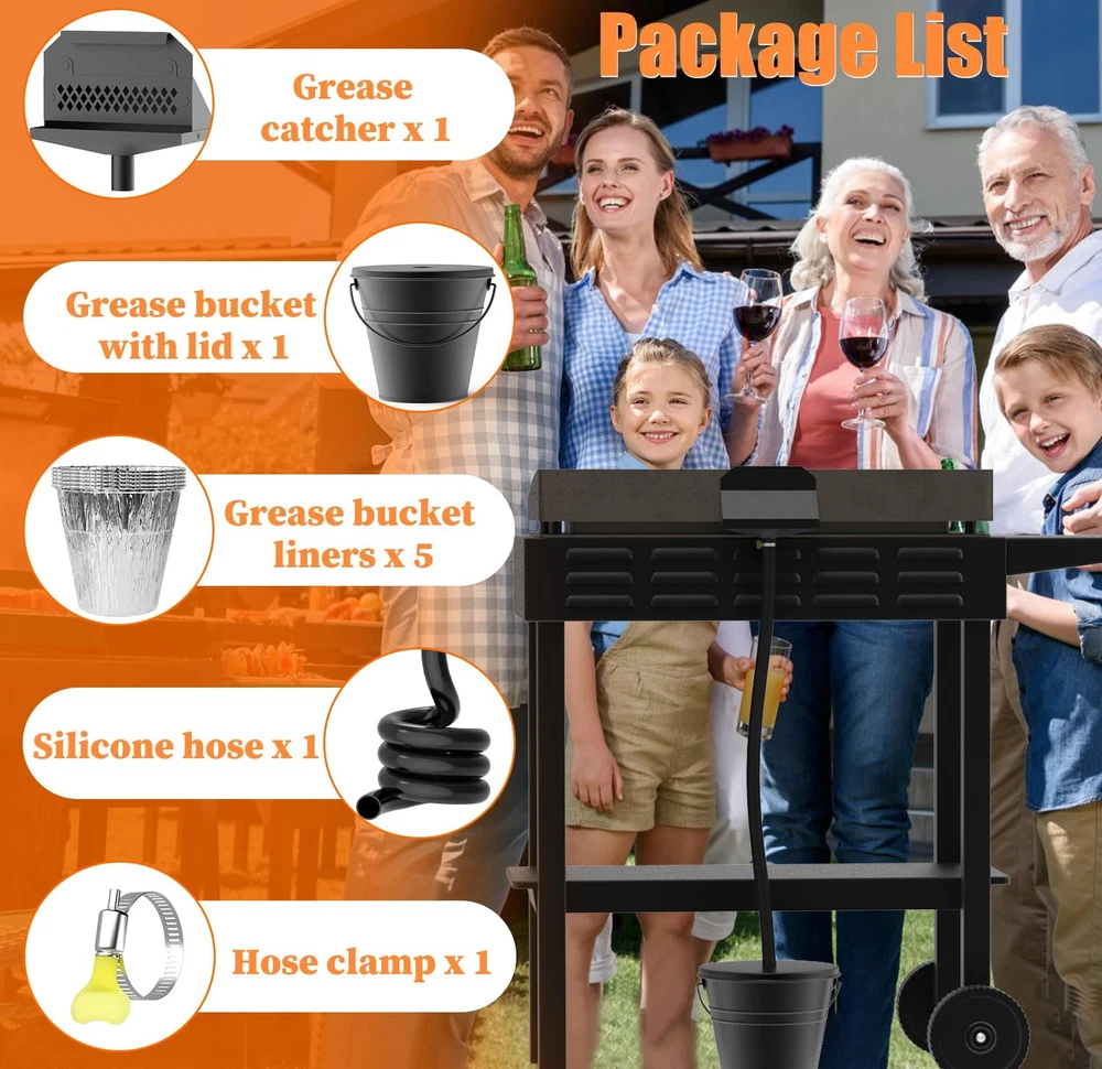 rear grease drainage system for blackstone grease catcher rear grease drainage funnel for blackstone rear grease drainage system for blackstone rear grease drainage funnel for blackstone grill griddle rear grease exit rear grease drainage catcher rear grease drainage for blackstone rear grease drainage funnel rear grease drainage catcher for blackstone rear grease drainage for blackstone 🥩 EASY TO USE, ONE STEP: Enhance your cooking experience and get rid of the hassle of repeatedly emptying the traditional grease tray of Blackstone. Simply attach the heat-resistant silicone hose to the grease funnel with the clip and hang it on the grease outlet at the back of the grill. The silicone hose quickly guides grease to the grease bucket with lid, keeping the grill area clean. Enjoy hassle-free grilling, it's that simple! 🥩 COMPATIBLE WITH BLACKSTONE GRILLS: This rear grease drainage funnel fits most Blackstone grills, including 17/22/28/36 inch models. The upgraded design will not interfere with the use of Blackstone accessories such as wind guards, hood or lid. Note: Do not fit for Blackstone E-Series, Culinary-Series and models 1891/1899/2151! 🥩 ENHANCED GREASE COLLECTION: This rear grease system for Blackstone comes with an enlarged grease bucket and disposable aluminium foil cups with 2.5 times the capacity of a standard drip tray. Perfect for hosting large family or friend BBQ parties. The grease bucket measures 6.77 x 4.33 x 6.34 inches, foil liner measures 6.38 x 3.86 x 6.06 inches. 🥩 DESIGN OPTIMISATION: The grease catcher for Blackstone with built-in magnets facilitates easy attachment to the grease drain at the top of the grill. The integrated rear grease gate prevents food from falling into the grease tray, especially when cooking or preparing foods such as stir-fries. 🥩 HIGH TEMPERATURE RESISTANT MATERIAL: Both the grease funnel and the grease bucket are made of heavy-duty coated steel that is resistant to heat, corrosion and rust, ensuring durability. Meanwhile, the included 3.5-foot heat-resistant silicone hose can withstand temperatures up to 572°F for easy collection of hot grease. Hose lengths can be cut as needed. 🥩 PERFECT BBQ ASSISTANT: This enlarged griddle grease catcher is particularly suitable for use during large BBQs or when making large batches of bacon. It reduces the need for frequent cleaning of standard grease trays, allowing you to focus more on the fun of cooking. It is absolutely ideal for cooking enthusiasts.