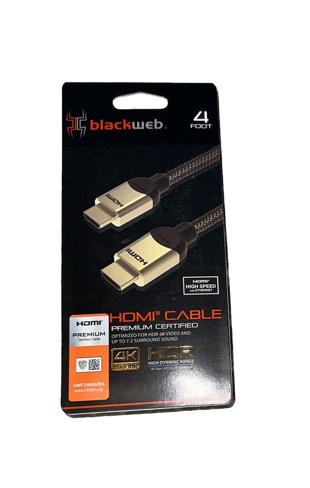 The Blackweb Premium Certified 4K ULTRA HD HDMI 4 Foot Cable is a high-quality, black HDMI cable designed for universal compatibility. It features a 1:8 connection split/duplication and a multi-strand fiber type for optimal performance. With a 30 gauge and gold plated connectors, this HDMI cable supports high speed with Ethernet, 7.2 surround sound, and 60 Hz refresh rate. The 4-foot cable is backed by a 1-month manufacturer warranty and is suitable for various applications in both residential and commercial settings.