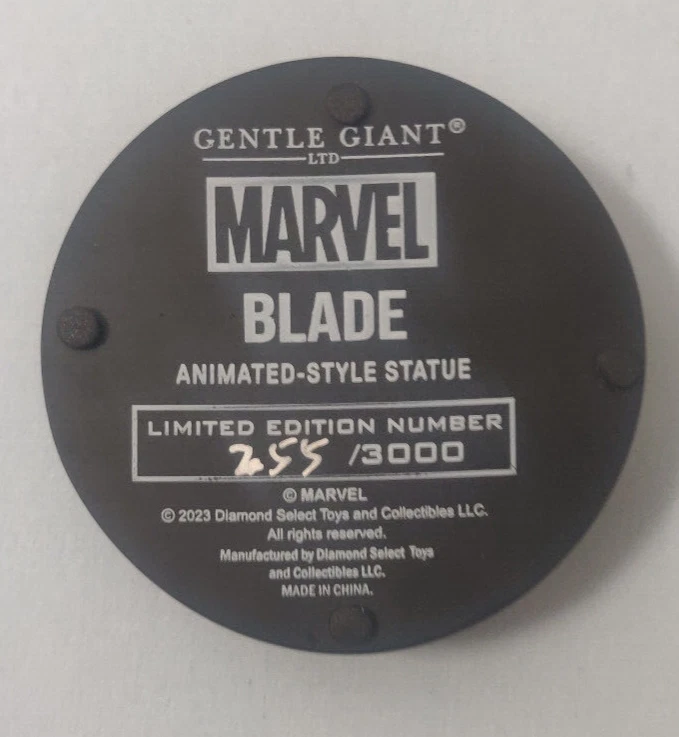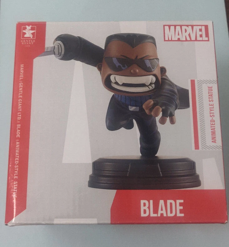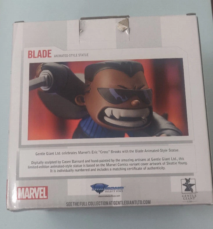 Item Condition Statue is in very nice condition (3 parts - hand with sword, rest of blade, and the stand). The box is okay condition (minor wear on the corners and some damage on the pull tab to open the box). Does not come with the inner styrofoam packaging. Item Description Blade Statue (design based on Skottie Young cover) from Marvel Gentle Giant Limited Edition (255/3000) Shipping Information. Shipping will be free. Shipping will be sent Ground Advantage service through USPS with tracking and insurance. Comic Book will be securely packed in a box. Comic Book will be mailed out 1-3 business days after payment Refund Policy No refunds unless the item does not match the description in the listing.