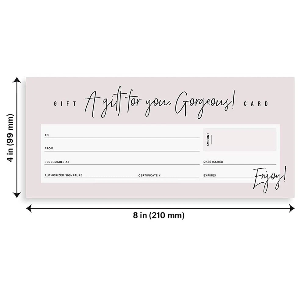 Blank Gift Certificate Card Vouchers For Small Businesses, 4x9 Inch Heavyweight Cards for Spa, Beauty Makeup or Hair Salon Business, Perfect for Holiday or Christmas season 25 Pack These beautifully designed gift certificates are sure to impress and leave a lasting impression with the recipient. They are just what you need for your small business. ► PRODUCT DETAILS: - 25 Pack - 4x9 inches - generous space to fill in the recipient's name, sender's name, entitled amount, date, expiration, business name, authorized signature and certificate number. - Printed on high quality 120lb premium uncoated white card stock - Perfect Use For: Beauty Salons, Massage, Nail, Makeup or Hair Salons, Restaurants, Cafes and lots of other businesses! - Single sided classic yet modern design ► WHAT MAKES US UNIQUE: - 100% UNIQUE DESIGNS: Created by our in-house design team - you won't find these designs anywhere else! - HIGH QUALITY PAPER: Every product uses the finest quality papers. - OPTIMAL ENVIRONMENTAL CHOICE: Uncoated stock is acid-free and FSC certified and contains 10% post-consumer recycled content. - WE STAND BEHIND OUR PRODUCTS: We take pride in the quality of our products and the services we provide. - KNOW YOU'RE SUPPORTING A SMALL, FAMILY-OWNED BUSINESS: With an A+ Better Business Bureau rating. - USA MADE: Designed and printed in the USA. 4" x 9" gift cards on 120 lb premium, uncoated white card stock that's easy to write on. Envelopes are NOT included. Perfect gifts for beauty salons, spas, restaurants, cafes and more! Lots of room to fill in all the necessary details. Made in the USA with 100% unique designs by . Recommended Envelope Size: #10 Envelopes (4 1/8 in x 9 1/2 in)
