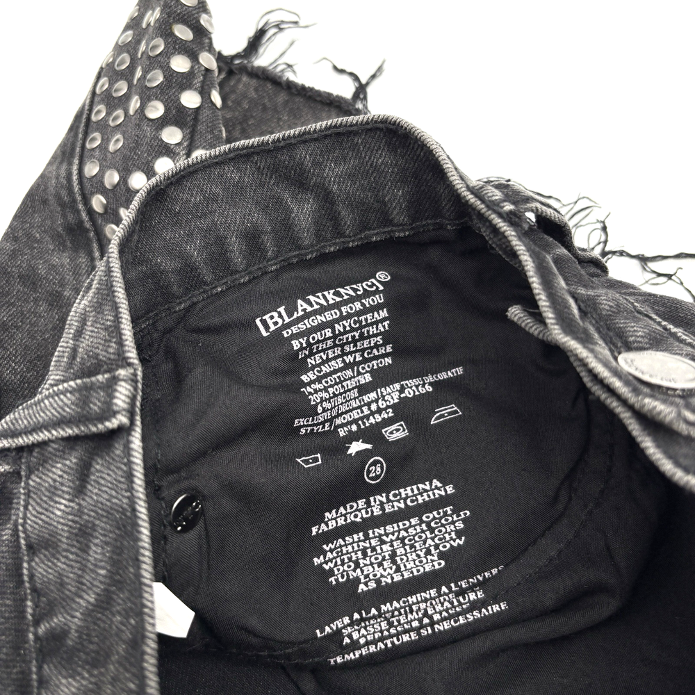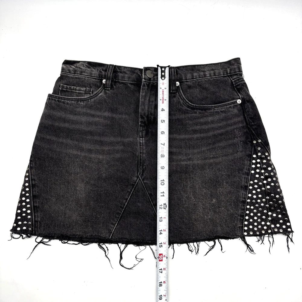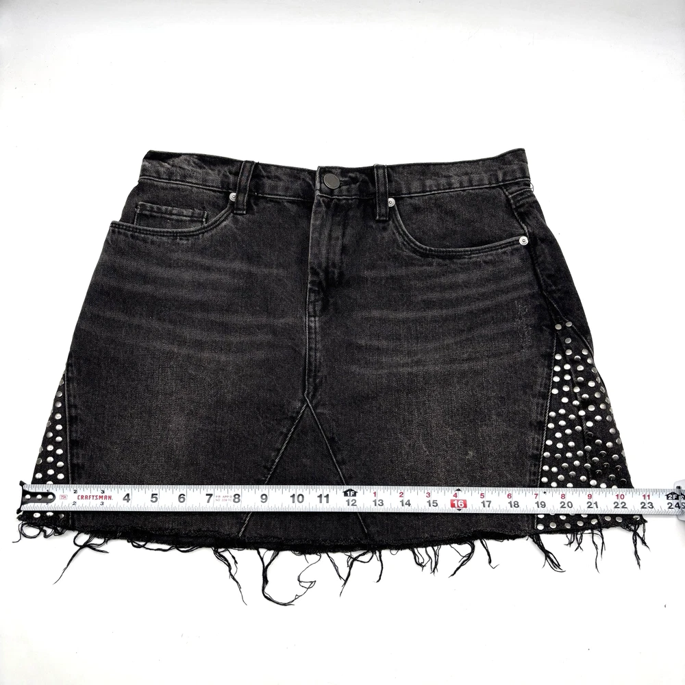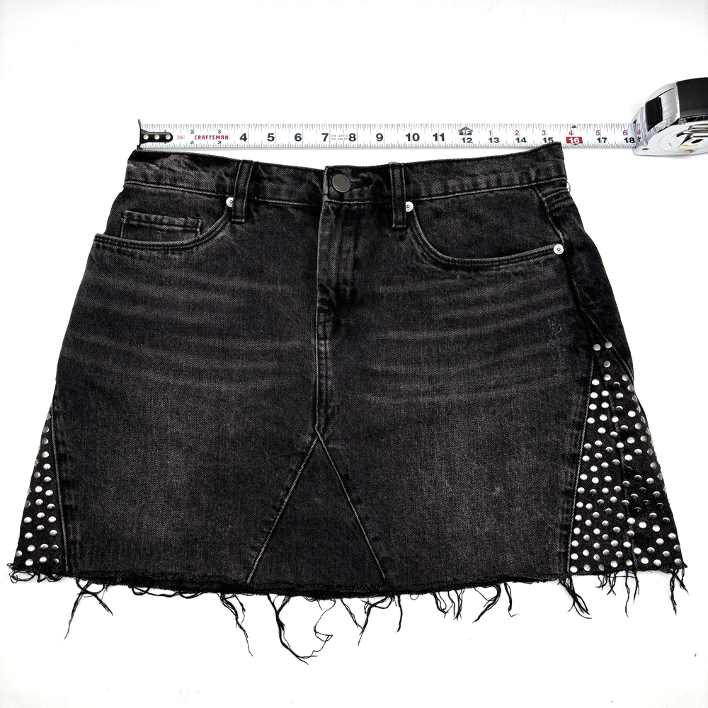 Blank NYC A-line Mini Skirt 74% Cotton, 20% Polyester, 6% Viscose Black Denim Above Knee Length Flat Front A-line Silver-tone Rivet Studs on Sides 5 Pocket Design Zip and Button Closure Unlined Raw Hem No stretch! Women's Size 28 Please refer to measurements below to ensure accurate fit before purchase! 15" waist (30" circumference) 19.5" hips 22" hem 30" full length from waist to hem Measurements made with garment laying flat. Excellent pre owned condition. Very gently owned. No rips, tears, stains, holes or other notable flaws. Clean and from a smoke free home.