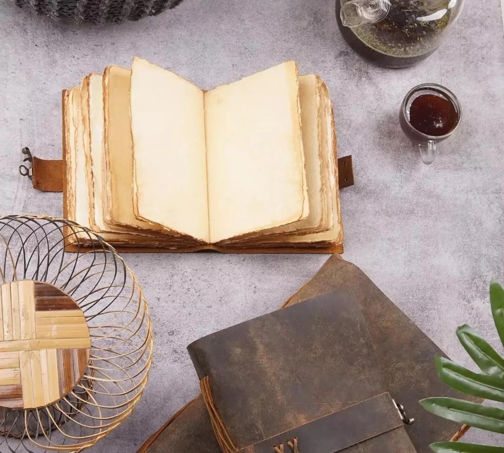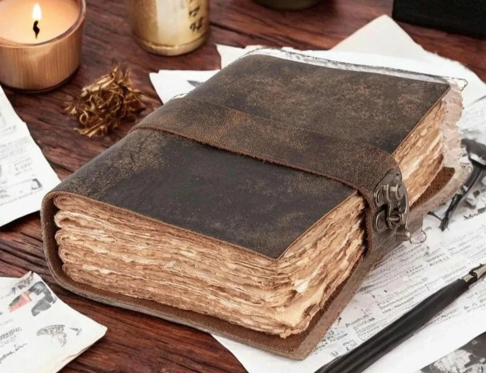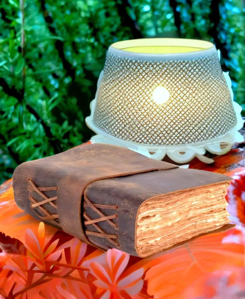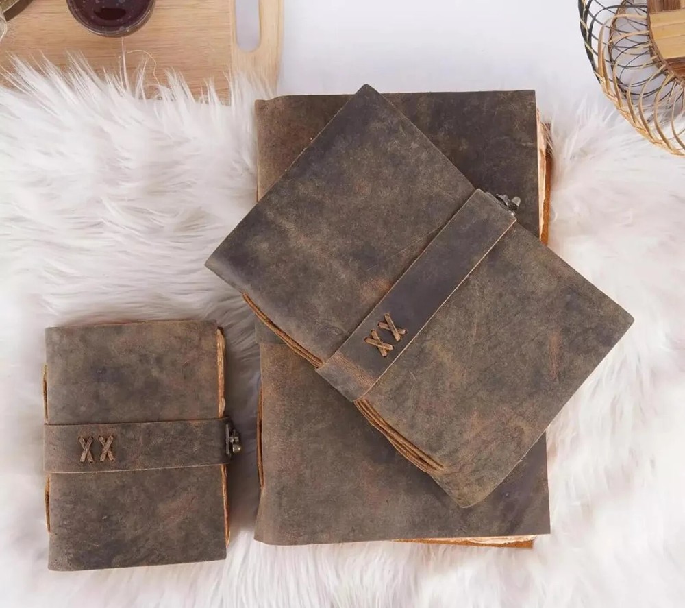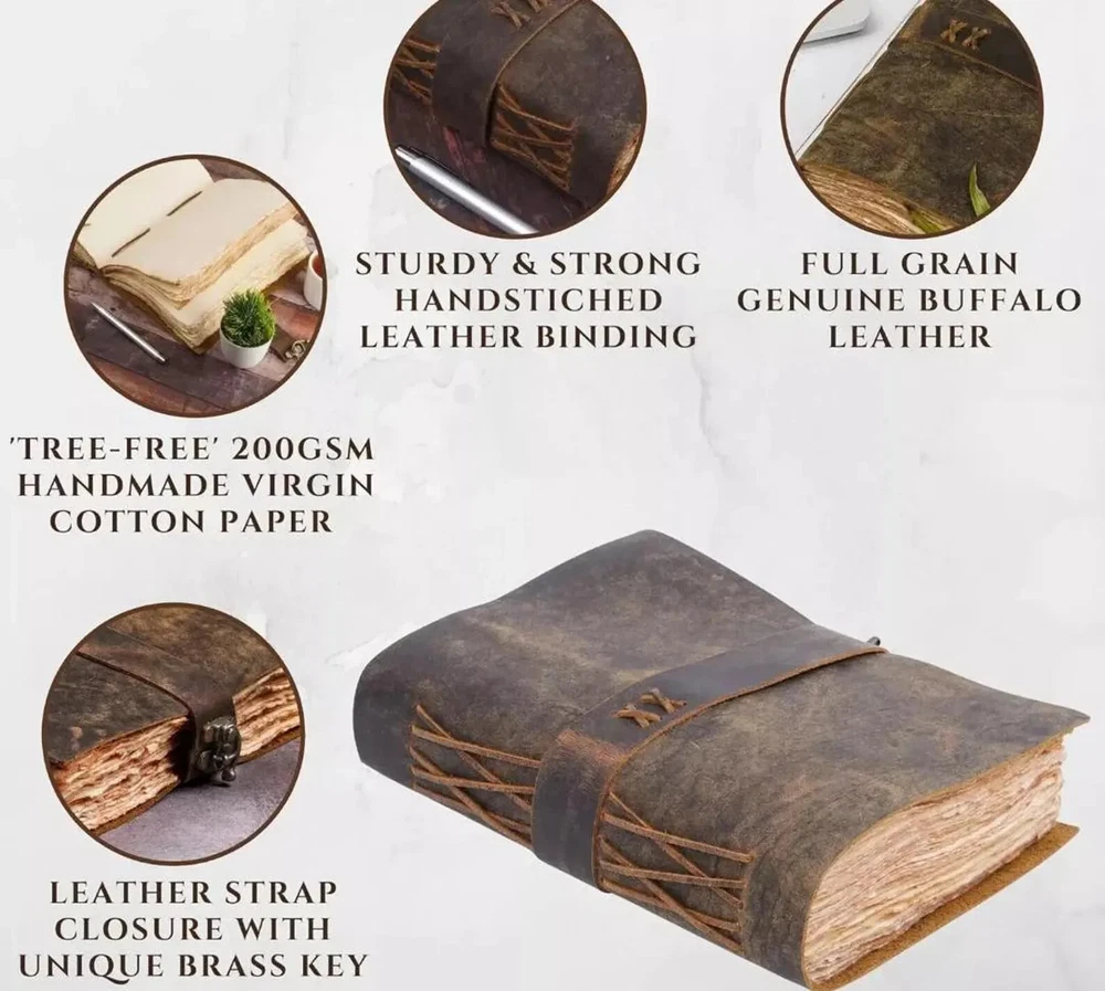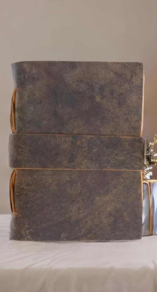 This product is a luxurious and limited edition Blank Spell Book of Shadows, Grimoire Journal, Travel Writing Notebook, Deckle. Handmade in India, it features a leather cover and is personalized to the user's preferences. This unique journal is perfect for those looking for a special and intricate writing experience, with a touch of mysticism and sophistication. Vintage deckle edge old paper • handmade rustic cotton paper • 100 Sheet (200 pages both side) - Leather journal witchcraft book of shadows notebook is made with 200 pages of Antique Paper which looks like it was pulled from history. You will fall in love with the the antique handmade cotton paper which is unique to our Vintage Journal Notebook. ● will keep all your valuable writing locked inside.Sturdy hand stitched binding to make sure that no paper comes out loose from your spell notebook. ● The witchcraft supplies journal is printed with a special seven stone called “Chakra healing” which helps to reveal inner truth within yourself and encourage self-awareness and self expression. We have taken extra to make sure that the emboss is perfect in every piece. ● Sketch, Doodle, Write on your Leather Blank Spell Journal with a Calligraphy Pen Fountain Pen, Brush Pen, Ball Pen, Acrylic Colours, Watercolor and many more. We guarantee no bleed through. ● Can be used as a notepad, journal, writing notebook, sketch book. 1.25 inch thickness, easy for handwriting, drawing or sketching and compact for carrying in your bag. Ideal for alternative ● Artist Sketchbooks, Photo Album, Traveling Notes, Business Executive, Logbook, Poetry Work, Journalists, Food Planner, Instagram Scrapbook and Bible Journaling. ● Best Gift For Your Companion: A Journal Is Like A Trusted Friend. You Can Use It To Solve Queries, Get Inventive, Or Record Valuable Memories For Them To Last Forever Or You Can Just Use It As A Gift For Your Wife, Son, Or A Daughter Or For Some Enthusiastic Writer In Your Family. Even For Looking For A Miraculous Spell Book Or A D&D Gamer Looking For His Quest Book. ● Perfectly Sized For Multi-Purpose Use: Length 5", Width 1", Height 7" Inches, This Easy To Carry Personal Diary Is Perfect To Use As A Health Journal, Sketchbook, And Poetry Journal. It’S An Ideal Journal Which Records Your Daily Thoughts And Life Lists. And Also Good For Designing, Doodling, Or Calligraphy Of Your Choice. Handmade journal, Blank Books, vintage diary, Genuine Leather Journal, Anniversary gift, Gifts for her, Personalized , Gifts for him, Valentines Gifts, a5 Journa PERFECT FOR ALL YOUR DAILY WRITING AND DRAWING NEEDS -- Junk Journal -- Dungeons and Dragons Journal - DND -- Mothers Day Gift -- Nature journaling -- Instagram photobook or scrapbook -- Teen journal or girls' diary -- Travel diary -- Weight Watchers Records -- New baby records or journal -- Letters to your loved ones -- Letters to give to your children when they grow up -- Daily Notepad or Bullet Journal -- Scheduling and appointment reminders -- Life moments tracker -- Vacation scrapbook -- Story writing -- Notebook to write in