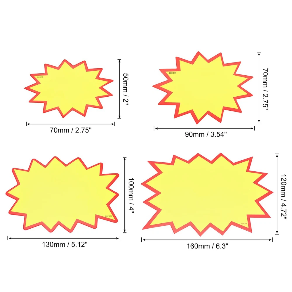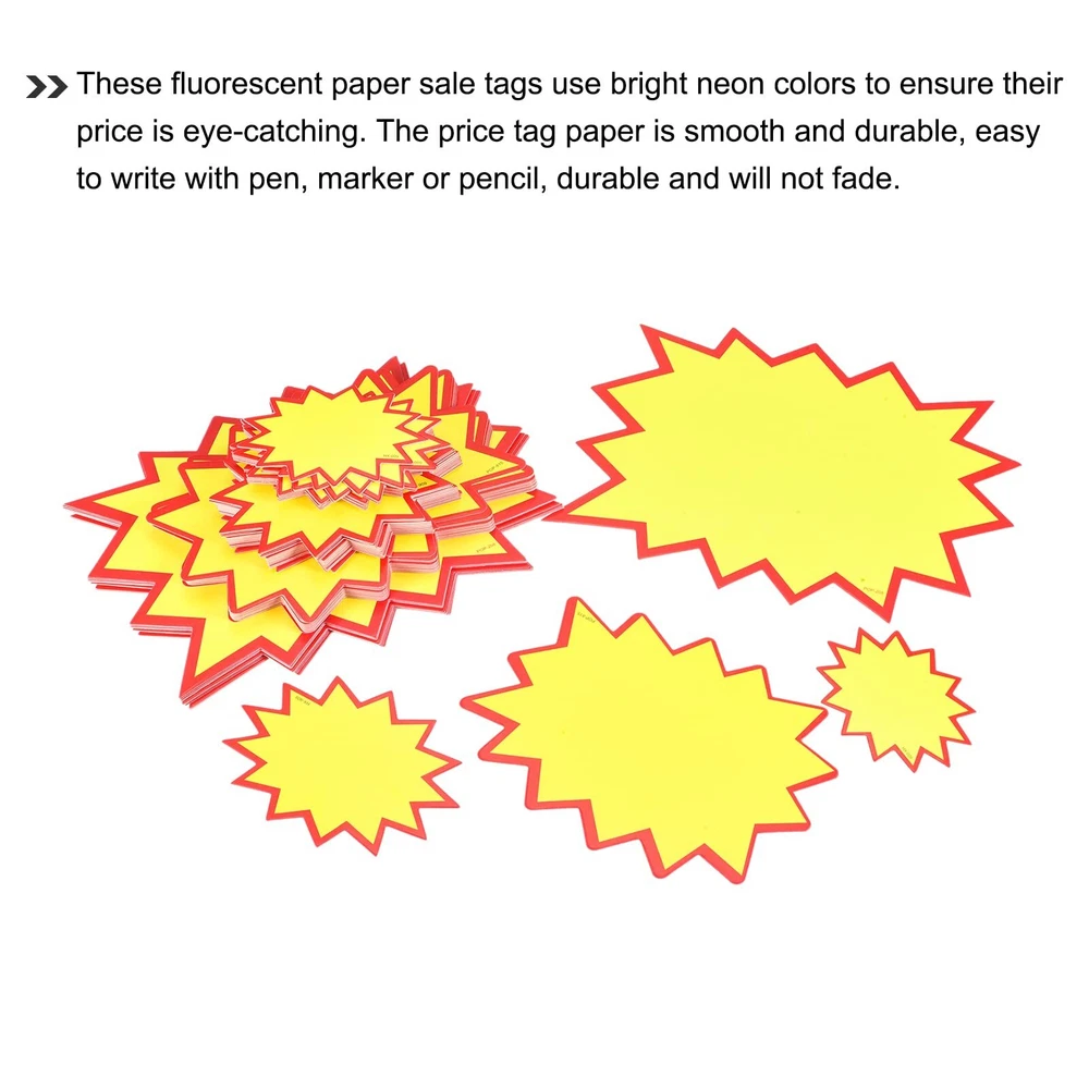 Blank Star Burst Signs Price Tags Paper Pricing Labels Yellow for Retail Sales Pricing, Pack of 100 Blank Star Burst Signs Price Tags Paper Pricing Labels Yellow for Retail Sales Pricing, Pack of 100 Description What is this? Price display sign, capture customers' attention and achieve your sales, suitable for displaying price in retail stores, shops, supermarkets, shopping malls, garage sales, etc. What will I get? Package Content: 100 x Retail Signs Size 1: 90x70mm/3.54x2.75 inch Size 2: 70x50mm/2.75x2 inch Size 3: 130x100mm/5.12x4 inch Size 4: 160x120mm/6.3x4.72inch Are there any advantages of the product? These paper tags use bright colors to ensure their price is eye-catching. The price tag paper is smooth and durable, easy to write with pen, marker or pencil, durable and will not fade. How to use it? Simply clip or stick a price tag next to your product, write the price, and grab your customer's attention, let your customers know the daily price of your products. What should I notice? Sturdy and not easy to break, can be used for a long time. Due to manual measurement, please allow 2-3mm error. Key Features Price display sign, capture customers' attention and achieve your sales, suitable for displaying price in retail stores, shops, supermarkets, shopping malls, garage sales, etc. Package: 100 x Retail Signs; Each 25 pieces These paper tags use bright colors to ensure their price is eye-catching. The price tag paper is smooth and durable, easy to write with pen, marker or pencil, durable and will not fade. Simply clip or stick a price tag next to your product, write the price, and grab your customer's attention, let your customers know the daily price of your products. Sturdy and not easy to break, can be used for a long time. Due to manual measurement, please allow 2-3mm error. Return Information ⦿ Items can be returned within 30 days. Please contact us through eBay messaging for return instructions. ⦿ We ensure 100% satisfaction. If you're not satisfied, we will resolve any issues promptly. ⦿ Free shipping and returns with a 30-day money-back guarantee. ⦿ Please contact us for the return shipping address. Shipping Details ⦿ We ship to the address listed on eBay. Please ensure it is correct. ⦿ Standard delivery time is 3-5 business days. ⦿ We use reputable shipping services like UPS, FedEx, and USPS. ⦿ Currently, we ship only within the 48 contiguous states of the USA. ⦿ For any shipping concerns, feel free to contact us. Customer Support ⦿ For any inquiries, please contact us via eBay messaging. We usually respond within 24 hours. ⦿ We prioritize customer satisfaction above all else. ⦿ Reach out to us with any issues before leaving feedback, and we will do our best to resolve them. About Us We are committed to offering high-quality products at competitive prices, ensuring that our customers receive the best value. Our team strives to provide exceptional customer service and a seamless shopping experience. With years of experience, we have built strong relationships with suppliers, enabling us to offer a wide range of products. We constantly seek to improve our product selection and services to exceed customer expectations. Our mission is to ensure 100% customer satisfaction. We address all concerns promptly and effectively. Thank you for choosing our store, and we look forward to serving you again.