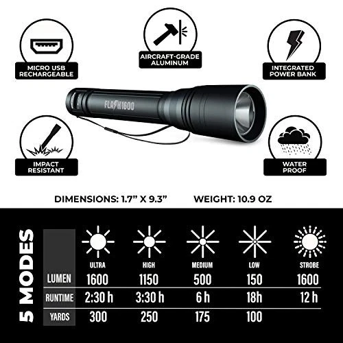 Return Policy Fast Delivery Trusted seller Blazin Rechargeable Flashlight | 1600 Lumen Tactical LED Flashlight with 5 Modes |16 Hours Battery Runtime | 300 Yard Visibility | Powerful Micro-USB Waterproof EDC Torch Product Description EXCLUSIVE: Power Bank Integrated Flashlight! Recharge your phone or tablet from your flashlight. Perfect for emergency situations so you're never more than a few minutes away from a working phone. [RECHARGEABLE] Blazin's tactical flashlights can be conveniently charged when you want from any wall charger, computer, car or power bank. Other rechargeable flashlights have removable batteries, are inconvenient and require bulky chargers. [SUPER BRIGHT] Our 1600 lumens rechargeable LED flashlight has 300 yards of visibility. Unparalleled security with a super bright LED flashlight that can light up your backyard or entire parking lot to safely walk back to your car. [5 MODES] Our tac light has 5 modes. Ultra (1600 lumen, 2:30 hrs runtime, 300 yards); High (1150, 3:30, 250); Med (500, 6:00, 175); Low (150, 18:00, 100). Our tactical light fits any situation by changing the mode according to your needs. [WATERPROOF] This waterproof flashlight is convenient for blackouts, during heavy rain or hurricanes. Don't worry if your LED waterproof flashlight falls in water. This survival flashlight is perfect to use for camping, even when it rains. Shipping Returns Payment Shipping Shipping is FREE to all addresses other than APO/PO boxes in the lower 48 states. All our stock ships from US-based warehouses. Shipped via USPS or UPS (depending on location and package weight) Unless stated otherwise, all orders will ship within 24-72 hours of your payment being processed. Check our feedback to see the great reviews of FAST shipping we offer. Returns Seller does not accept returns Payment We currently accept payment via eBay managed payments only. Once payment is cleared, we will dispatch your shipment within 1-3 business days. Please refer to the "Shipping" tab for more information regarding shipping speed to your destination.
