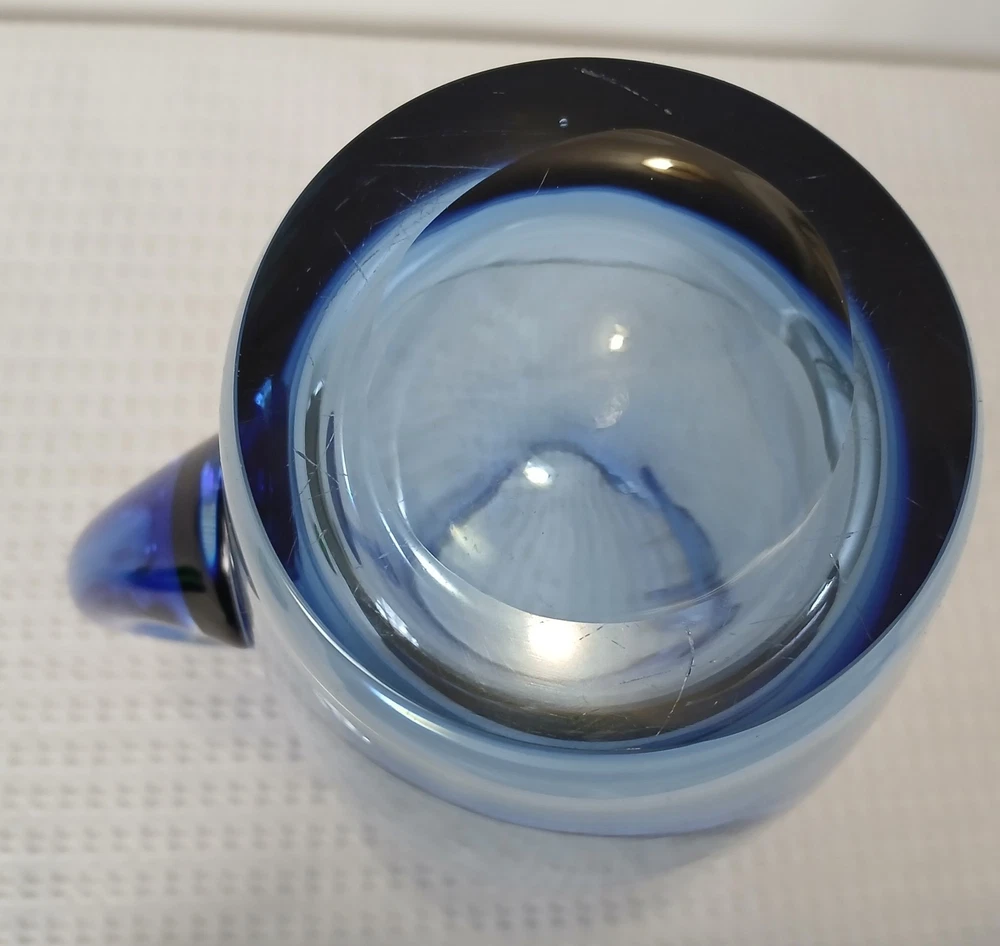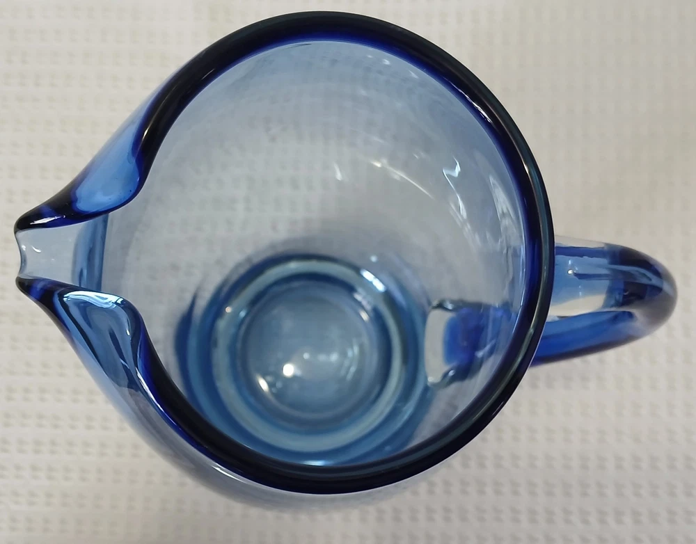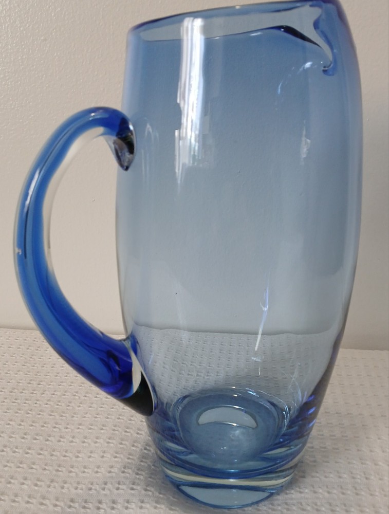This item is pre-owned, vintage, and possibly antique with no damages chips or cracks. There may be a couple of flea bites and bubbles in the glass as I believe this to be hand-blown it's unmarked but looks to be inspired by Blenko or Bohemia Glass. It's very heavy, weighs about 4 pounds. Approximately 10x8x4 inches. You receive the same pitcher shown. Pictures show all angles and details, and a tape measure for size reference. Carefully packed and shipped to you by the next business day