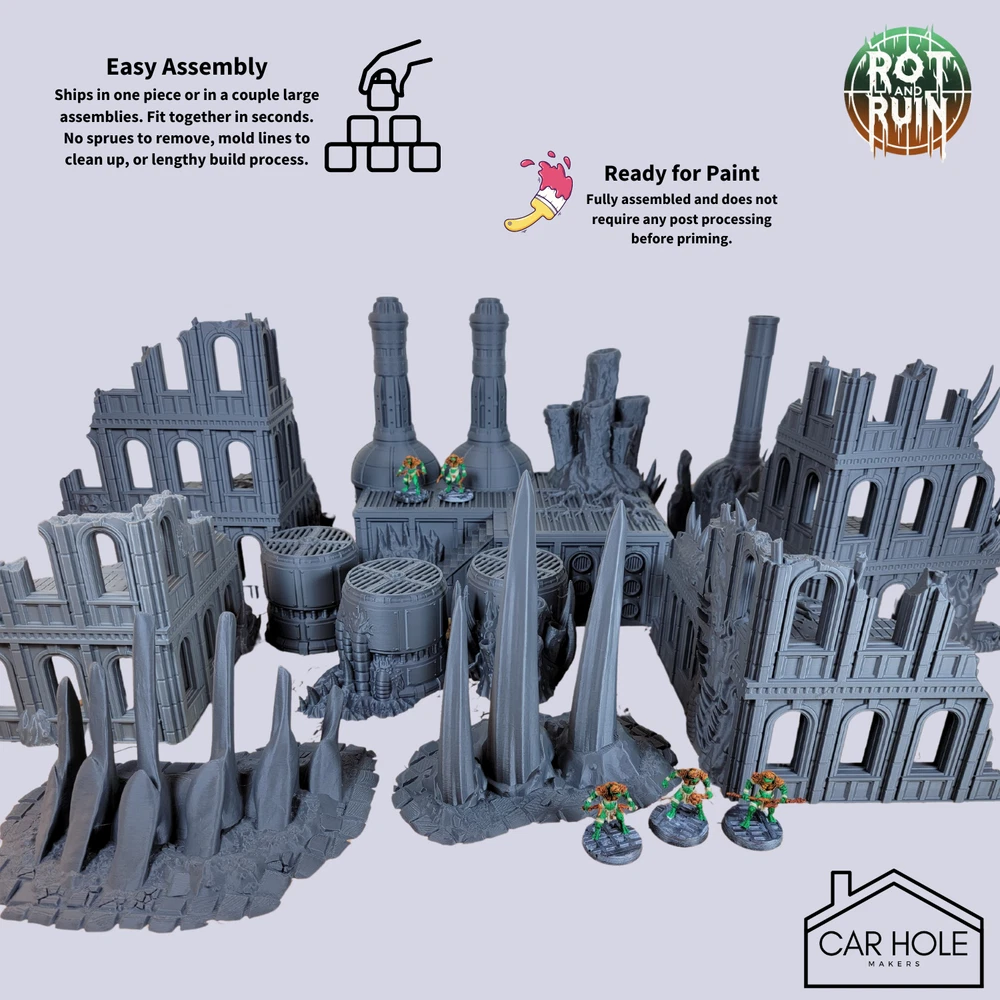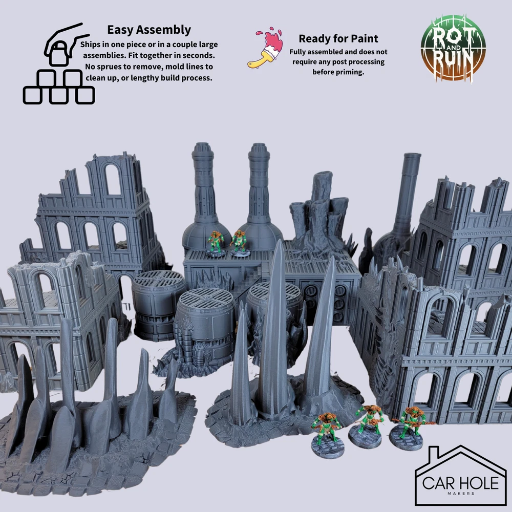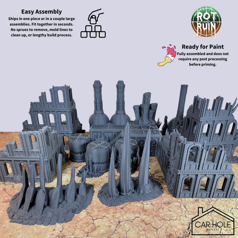 Full Blight World Set: Corrupted Corner Ruins (4 Pieces) Chimneys (2 Pieces) Bone Formations (2 Pieces) Reservoirs (2 Pieces) Models arrive already mostly assembled and ready for play, no glue required. Models come in black PLA and require no clipping, gluing, washing, filing or post processing of any kind. Just grab some hardware store primer and paint with your favorite miniature paints. Some larger pieces are broken down into a few large sub-assemblies for shipping. You may wish to glue these before or after painting to make them more sturdy on the battlefield. Scale. This tabletop scenery is suitable for miniatures 28mm or 32mm in scale. Please note this item is 3D printed. It may have layer lines or other small imperfections caused by the printing process. This item is NOT a Games Workshop product and is not endorsed or affiliated with Games Workshop. This terrain item is designed with the purpose to be compatible with 28mm and 32mm miniatures and miniature role playing game products. All of these ruins were designed by Sacrusmundus and printed under a commercial license.