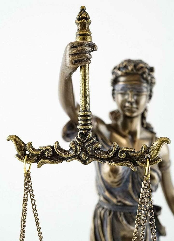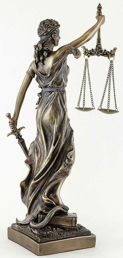 Roman goddess of Justice Carrying the scales of justice in one hand and a in the other and with her eyes blindfolded Symbolizes the fair and equal administration of the law without corruption, avarice, prejudice, or favor Measures approx. 13" tall. Cold Cast Bronze Justitia was the Roman goddess of Justice and is portrayed as carrying the scales of justice in one hand and a in the other and with her eyes blindfolded which symbolizes the fair and equal administration of the law without corruption, avarice, prejudice, or favor in the legal systems. This statue is beautifully designed, sculpted and handcrafted to the finest detail in Cold Cast Bronze. "Cold-Casting" is a term used to describe the process of mixing metal powder with a resin to create castings that give the appearance of solid metal, without the high cost of using actual metal. Measures approx. 13" tall.