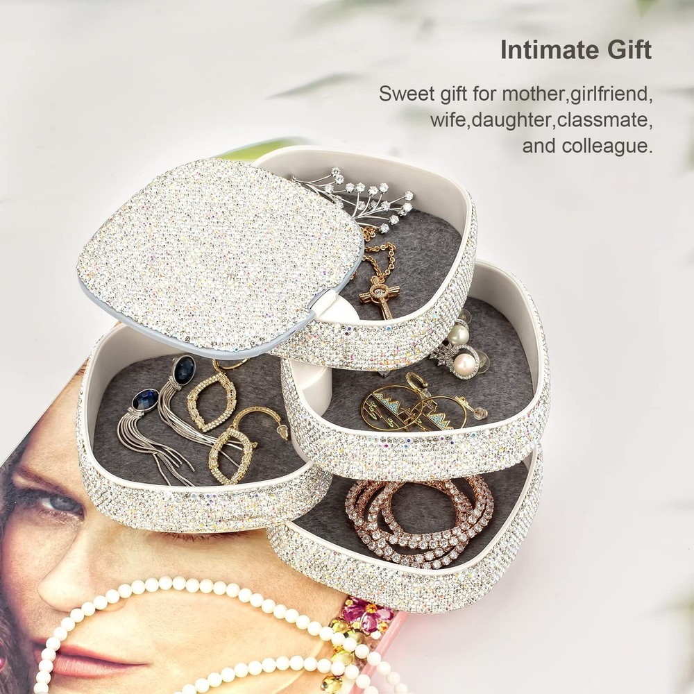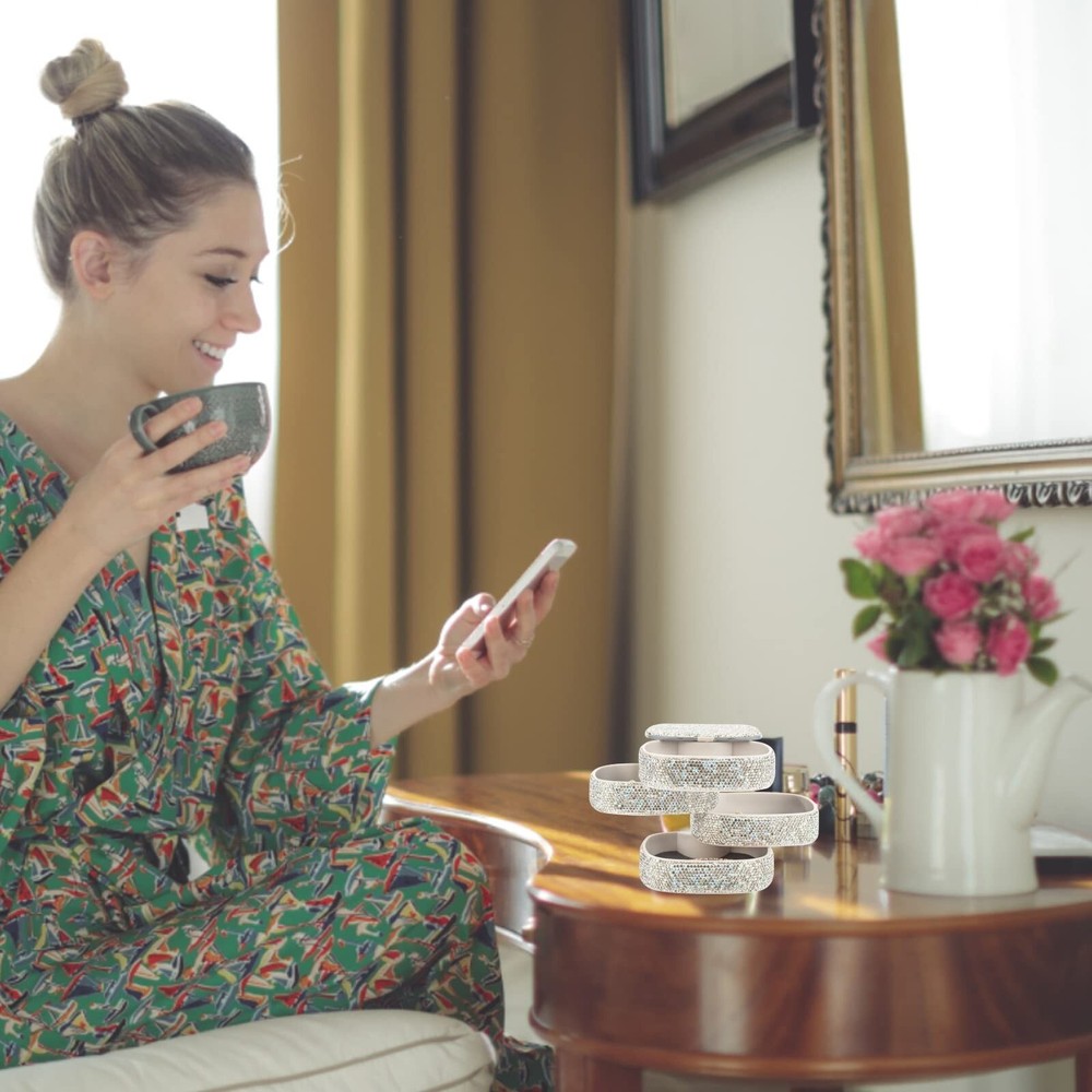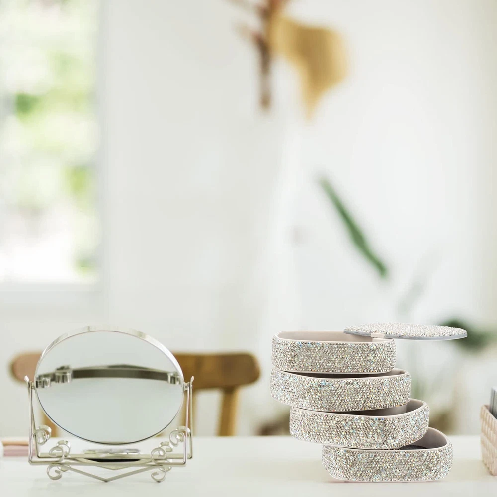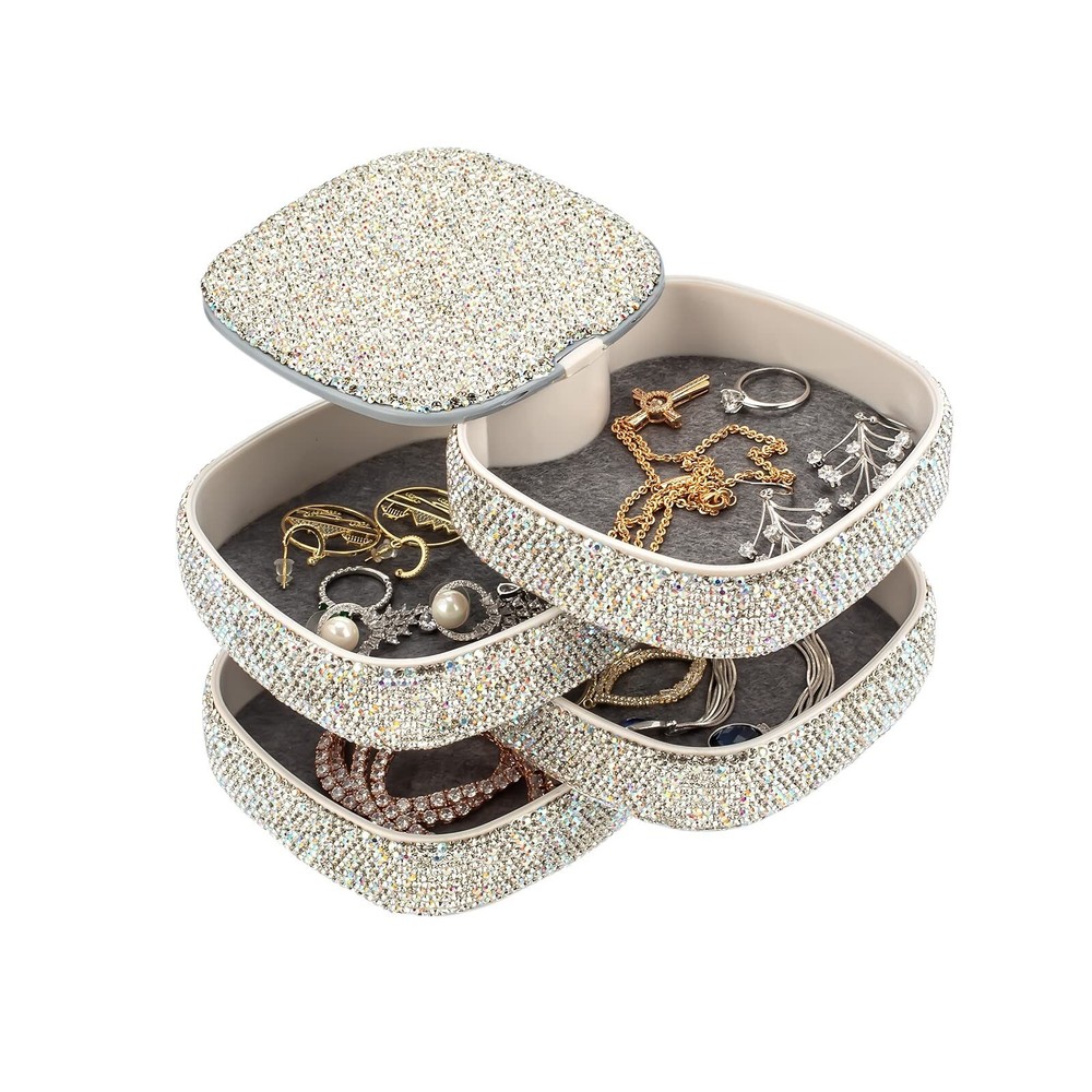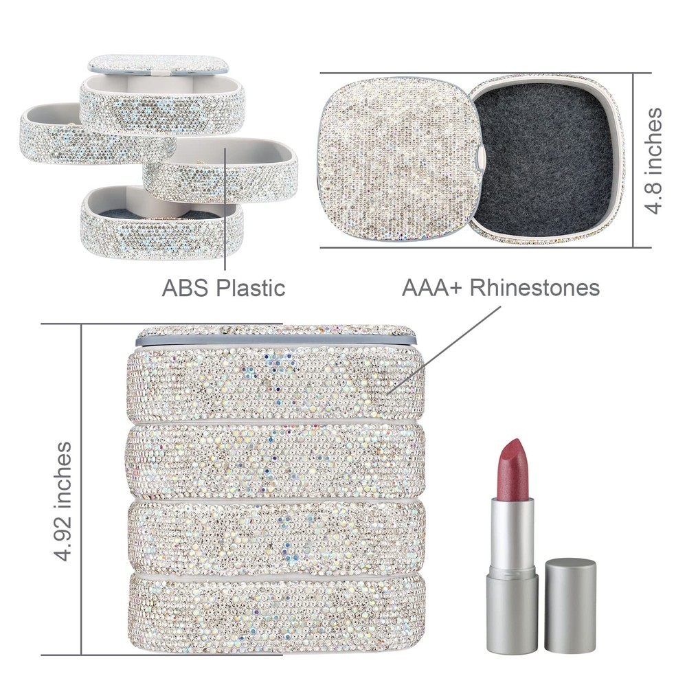 Bling Jewelry Organizer Portable Small Jewelry Storage Box Shining Jewelry Holder Case for Women 4-Layer Rotating Jewelry Tray Case with Mirror for Jewelry - Buy Now with Fast Shipping! Bling Jewelry Organizer Portable Small Jewelry Storage Box Shining Jewelry Holder Case for Women 4-Layer Rotating Jewelry Tray Case with Mirror for Jewelry Product Details Color: White Brand: UPPWOO Material: Plastic Style: Square-4 Layers-Rotated Special Feature: Jewelry Storage Recommended Uses For Product: Earring Product Dimensions: 4.8"D x 4.9"W x 4.7"H Target Audience: Women Shape: Rectangular Finish Type: 涂色 Color: White Brand: UPPWOO Material: Plastic Style: Square-4 Layers-Rotated Special Feature: Jewelry Storage Recommended Uses For Product: Earring Product Dimensions: 4.8"D x 4.9"W x 4.7"H Target Audience: Women Shape: Rectangular Finish Type: 涂色 Inner Material: Cotton Item Weight: 0.54 Kilograms Number of Compartments: 4 Warranty Type: Limited Warranty Jewelry Storage Type: Jewelry Box Number of Items: 1 UPC: 747923740124 Manufacturer: UPPWOO Factory Occasion: Mother's Day, Wedding, Birthday, Valentine's Day Mounting Type: 立式 Closure Type: Latch Item Weight: 1.19 pounds Finish: 涂色 Special Features: Jewelry Storage Batteries Included?: No Batteries Required?: No Date First Available: March 1, 2022 Key Features ✅ Rotating Jewelry Organizer - Shining and modern style, rotate into any look you like, excellent dressing table decor; it's a compact cylinder when closed, and isolate dust to better maintain the luster of jewelry. ✅ Classified Layout - 4 Layers make spacious enough to store your jewelries. Keep your jewelry separated and easy find what you need. ✅ Ideal Size - Size: 4.8*4.7*4.9 inch. 4-layer storage space, perfect size for travel, home or anywhere you need, to help classify your different jewelrys, keep Earrings/ Rings/ Diamond/ Necklaces/ Bracelets/ Brooches/ Hairpin/ Watches preventing from tangle. ✅ High Quality Materials - Made of premium ABS plastic and AAA+ Rhinestones, non-toxic, odor-free and durable. Internal soft non-woven fabric for preventing scratch and tarnish, give you a safe storage space to protect the jewelry. ✅ Perfect Gift- Sweet gift for mother, girlfriend, wife, daughter, sister, friend, classmate, and colleague. Ideal gift for Mother's Day, Valentine's Day, Birthday, Anniversary, Christmas. Paper box packing. Product Description