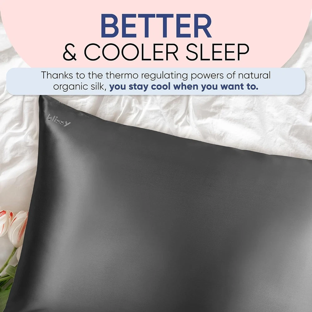 Blissy Silk Pillowcase - 100% Pure Mulberry - 22 Momme 6A Queen, Gray Description Features: 100% 22-momme 6a Grade Mulberry Silk 22-MOMME 6A GRADE MULBERRY FIBERS: Blissy Silk Pillowcases are handmade and crafted from high quality 22 Momme 100% Pure Mulberry Silk. We have spent countless hours prototyping, testing and using our products to ensure the highest quality and durability. TAKE YOUR HAIR FROM DRAB TO FAB: No more bedhead or tired hair! Kiss dryness and tangles goodbye! Blissy prevents the tugging and pulling provided by ordinary pillowcases. Plus the non-absorbent surface helps to maintain your hair’s naturally producing oils. SKIN SAVING: Why waste time and money on a pillowcase that will only absorb vital skin nutrients? With Blissy 100% Mulberry Silk, your skin will maintain the balanced moisture it needs to form a protective layer. Fight against dryness and acne, two sides of the same coin! BETTER & COOLER SLEEP: The temperature regulating properties of the Blissy silk pillowcase allow you to keep cool at all times during the night without the discomfort associated with fluctuating temperature and the constant tossing and turning for a restful night sleep. ENJOY A FRESHER MORNING: Say farewell to discomfort and hello to a more soothing sleep with our silk pillowcase. Its smooth surface is less prone to irritating sensitive skin, helping you wake up feeling refreshed, with a clearer complexion and a more comfortable start to your day. Product Details: Brand: BLISSY Pillow Type: Bed Pillow Material: Silk Size: Queen Product Dimensions: 26"L x 20"W Color: Gray Recommended Uses For Product: Indoor, Skin Protection Closure Type: Zipper Special Feature: Cooling Product Care Instructions: Machine Wash Style: Classic Theme: No Theme Pattern: Solid Number of Items: 1 Thread Count: 400 Fabric Type: 100% 22-momme 6a Grade Mulberry Silk Number of Sets: 1 Number of Pieces: 1 UPC: 850009689306 Item Weight: 4.6 ounces Manufacturer: BLISSY Item model number: Blissy Batteries required: No Handling We will ship all orders within 1 business day of payment. Delivery We Do Not Ship Outside of the Continental US. Return Policy All items qualify for returns within 30 days of receipt. Buyer is responsible for return shipping on any item that is not damaged. Feedback We take our reputation seriously, we buy and sell online, so we understand the value of trust. If you are unsatisfied with your order, please contact us and we will work with you to resolve it to your satisfaction.