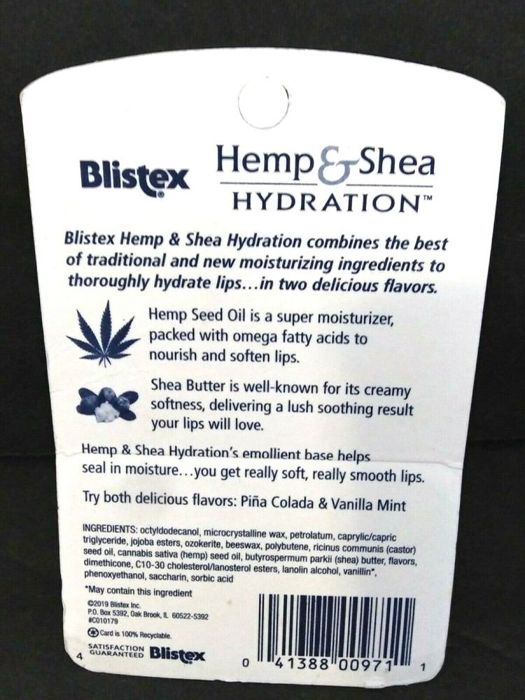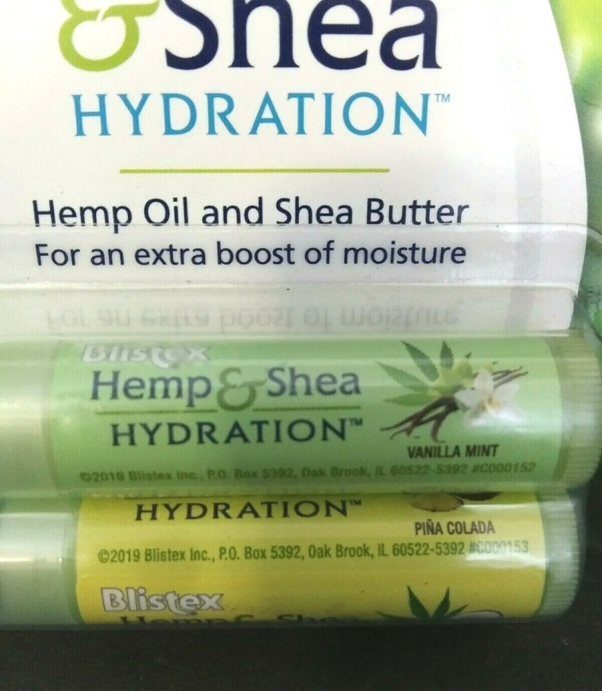 Blistex Adult Lip Balm Hemp And Shea Hydration Vanilla Mint And Pina Colada NEW The Blistex Adult Lip Balm in Hemp and Shea Hydration combines nourishing ingredients like Shea Butter and Jojoba Esters to provide deep hydration for dry, chapped lips. The lip balm comes in a delightful vanilla mint and pina colada flavor, making it a treat for your lips. With a PAO of 12 months, this product is perfect for all skin types and is proudly made in the United States by the trusted brand Blistex.