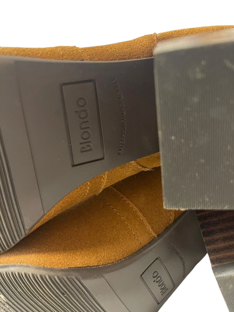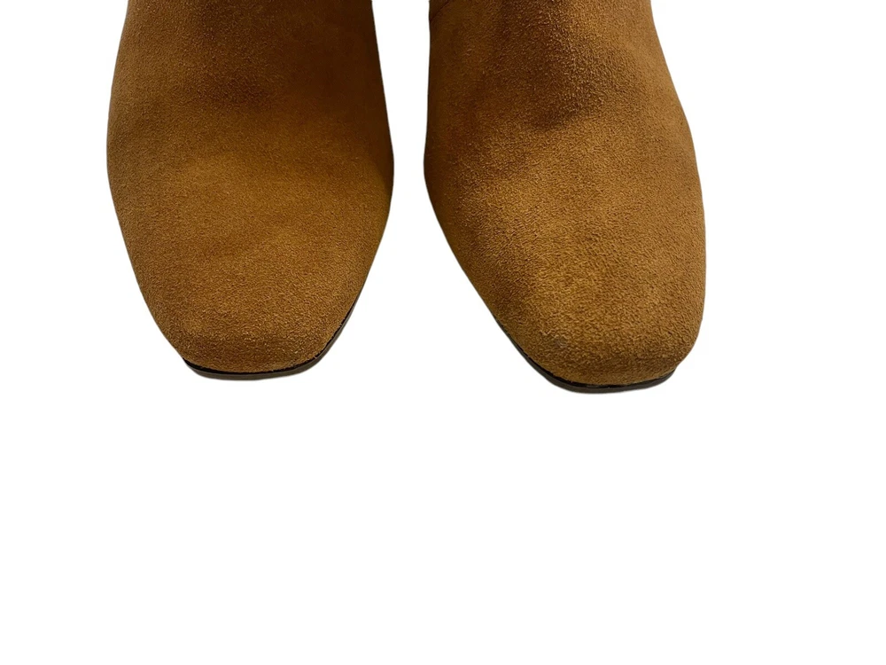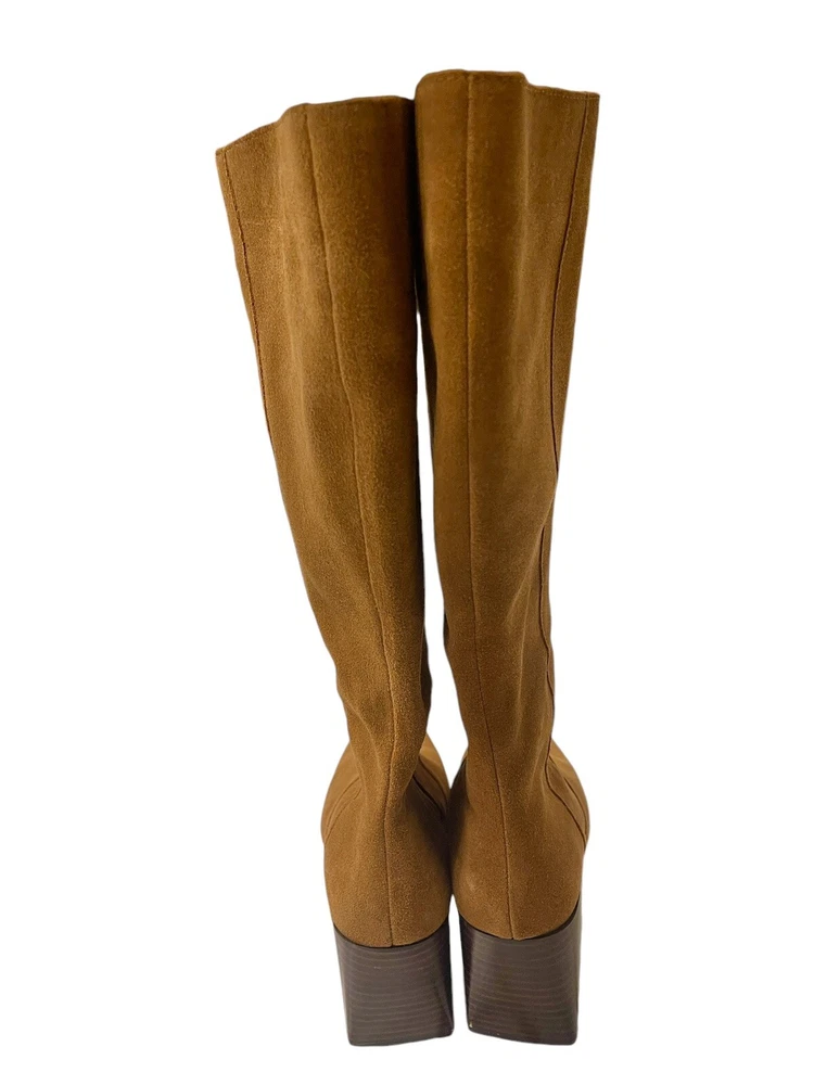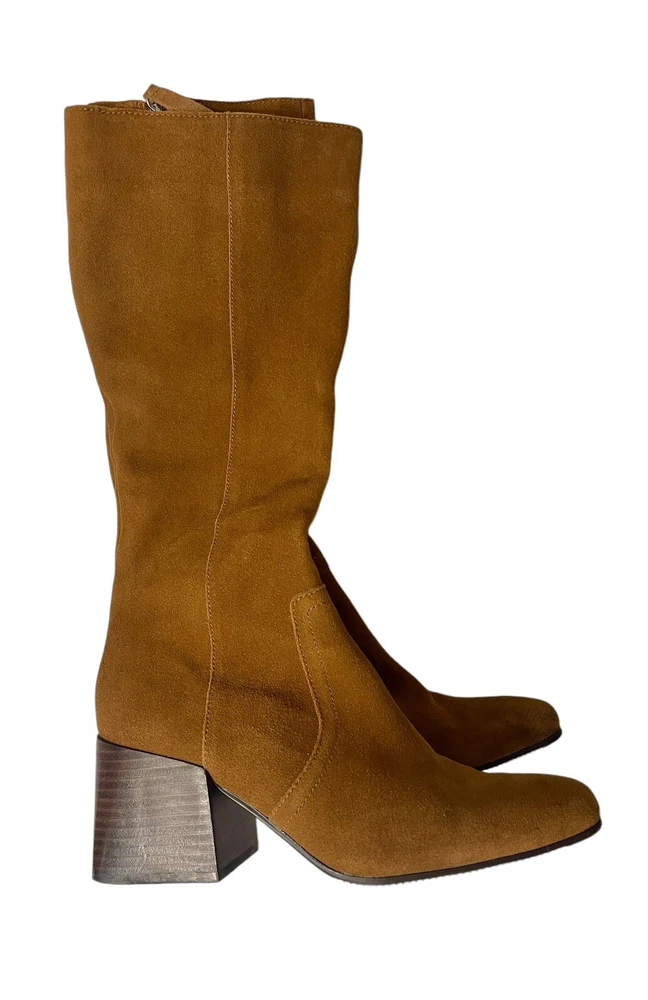 In excellent condition Waterproof suede upper Inside zipper closure Square toe Synthetic lining Fabric footbed Approx. 14" shaft height Approx. 12" calf circumference 2.75" stacked block heel Rubber sole