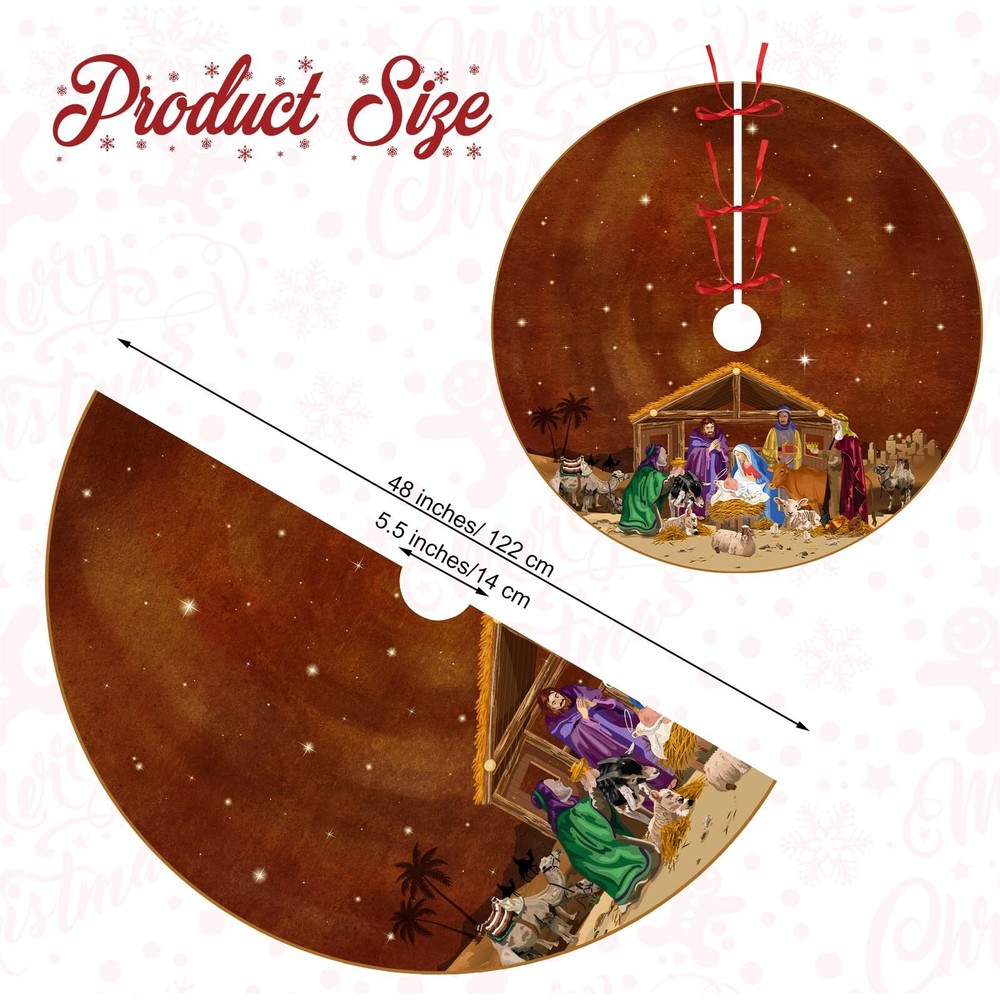 Blosssound Christmas Nativity Tree Skirt 48 Inch Nativity Scene Christmas Tree Mat Jesus Christian Winter Holiday Party Decor Farmhouse Tree Ornaments Xmas Indoor Outdoor Supplies(Brown) Nativity Scene: the theme of our religious tree mat is the birth of Jesus; On the Xmas tree mat there are shepherds, the Virgin Mary, Jesus, king, a wooden house, buffaloes, camels, lambs, etc.; Which showing the scene of Jesus' birth vividly Right Size: measuring 48 inches in diameter, this Christmas tree skirt is the ideal size for most Christmas trees; Just place it around the base of your tree, then put some Christmas decorations on it, and watch as it instantly elevates your holiday decor Quality Materials: our nativity tree skirt is made of polyester, soft and durable, not easy to slide; The patterns are exquisite and clearly printed; Not only does it protect the floors from pine needles and tree sap, but also adds warmth to your home Easy to Use: our Jesus Christmas tree decor adopts rope straps design, which can be firmly fixed by just simply fasten, and it is very convenient to install; Simply make your home merry and bright with this beautiful and festive tree skirt Christmas Decorations: complete your merry Christmas celebrations with this Xmas tree skirt; Whether you're hosting a merry Christmas family party or simply want to create a cozy atmosphere in your home, this tree skirt is sure to impress your guests Features: Creative Christmas decoration: Our Jesus Christian themed Christmas tree skirt is to express our celebration and commemoration of the birth of Jesus, making your Christmas decoration more special, unique and memorable. Good choice for gifts: The Xmas tree decor is beautifully printed and well-made. You can give it to your friends, family, lovers, neighbors, etc. Those who receive this Christmas gift will be very happy and fell your care and love. Specifications: Material: polyester Color: brown Size: 48 inch Package Include: 1 x brown Christmas tree skirt Notes: Manual measurement, there may be slight differences in size. Due to the screen display, the color of the item may differ slightly from the picture. Shipping We offer FREE shipping on all orders! We ship within Three business days of payment, usually sooner. We use a selection of shipping services such as UPS, FedEx, USPS etc. We only ship to the lower 48 states, no APO/FPO addresses or PO Boxes allowed. Local pickups and combined shipping options are not provided at this time. Return You can return a product for up to 30 days from the date you purchased it. Any product you return must be in the same condition you received it and in the original packaging. Please keep the receipt. Payment We accept payment by any of the following methods: PayPal Please pay as soon as possible after winning an auction, as that will allow us to post your item to you sooner! Feedback Customer satisfaction is very important to us. If you have any problem with your order, please contact us and we will do our best to make you satisfied. Contact Us If you have any queries, please contact us via ebay. We usually respond within 24 hours on weekdays. Please visit our eBay store to check out other items for sale! Thank you for shopping at our store.