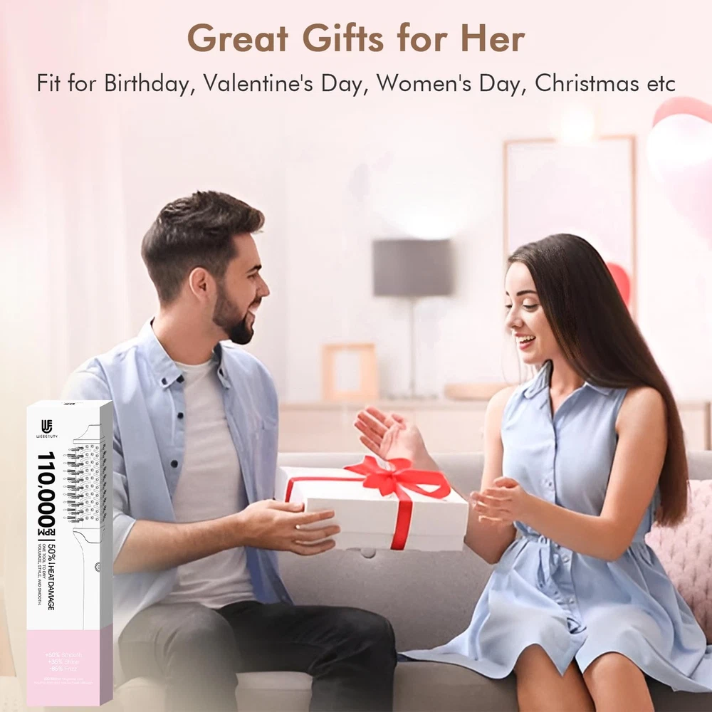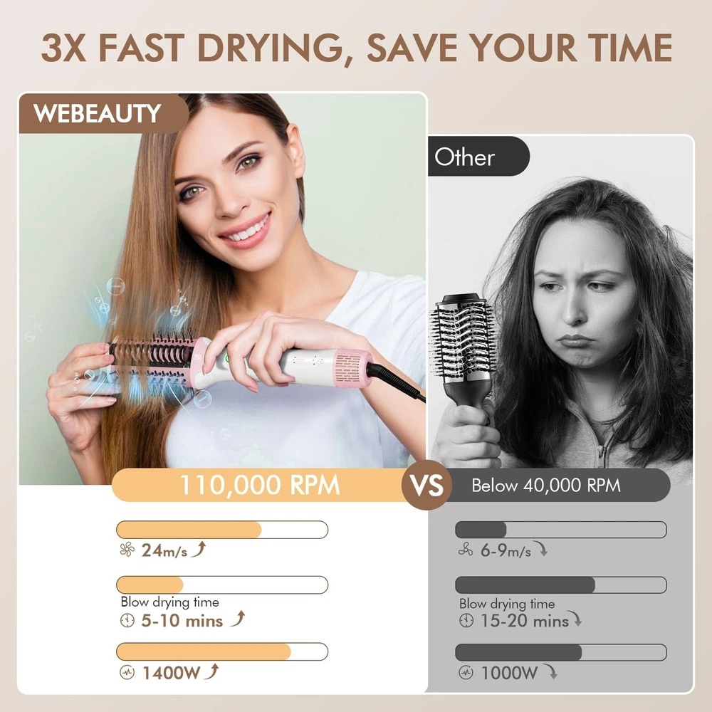 Blow Dryer Brush Hair Straightener | High-Speed 2-in-1 Hair Styler One Step Hot Air Brush Hair Dryer Volumizer with Straightening Brush Comb for Silky Smooth 110000 RPM Black High-Speed Motor for Fast Drying: Experience salon-quality results with our ultra-efficient BLDC motor delivering 110,000 RPM and 24 m/s airflow - 6X faster than standard styling tools. This blowout brush dryer combines high-speed performance, reducing styling time while creating smooth, voluminous blowouts or sleek straight styles effortlessly All In One Hair Styler: Our advanced unique design hair dryer brush and heated straightening comb in one. Switch seamlessly between different modes with one button. Whether you're smoothing frizz, straightening strands, or creating bouncy curls, this 2-in-1 hot air & straightening brush gives you salon-worthy results. Create hairstyle without multiple tools Three Temps & Speed Setting + Cool Shot: Three heat settings and three speed levels adapt to every hair type—fine to coarse to fit all hair texture whatever you have fine, normal, or thick straight, waves or curl shair—achieve your idea styling results. One-button cool shot locks in styles ensuring long-lasting hold and shine Smart Haircare Technology: Ceramic-coated plates and millions of negative ions ensure even heat distribution up to 395°F, minimizing thermal damage. Negative ions neutralize static for 72-hour frizz control. Enjoy bouncy, frizz-free hair without worrying about the harmful effects of high temperatures. Say hello to smooth, shiny salon-worthy styles Pro-level Designing: Crafted with a premium aluminum barrel (instead of flimsy plastic) for faster, even heat distribution and a sleek, professional look, even if it’s slightly heavier than standard models. Meticulous craftsmanship ensures top-tier durability and performance, and we’ve included a handy cleaning brush to keep your styling tool in peak condition Idea Gift-Ready Set: Premium color box packaging makes the all in one blow dryer hot air brush an idea gifts for her. A thoughtful present for women on birthdays, Valentine's Day, Women's Day, Mother’s Day, Christmas, New Year holidays etc. Surprise your wife, mom, sisters, aunt, friends or teacher with a pro stylist experience at home