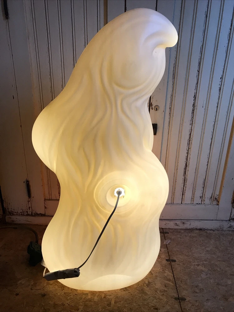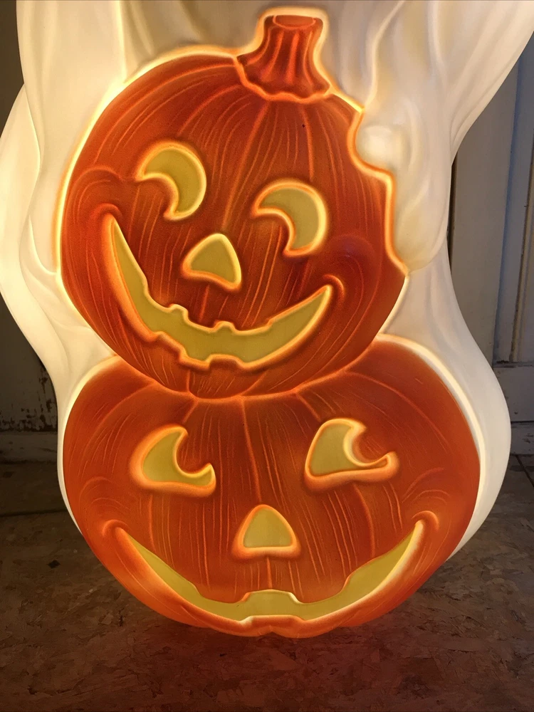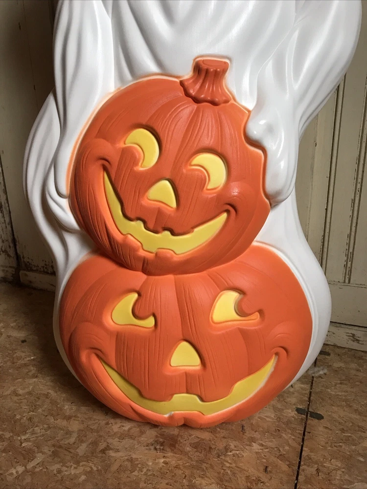 Blow Mold Halloween lighted Ghost with Pumpkins newly made using the original Grand Venture mold. Lighted with a bright LED bulb. Stands 31” inches tall. Great look. Made in the U.S.A. Look over pictures to help with description. Thanks. Shipped UPS or Fed Ex. No PO Box shipping.