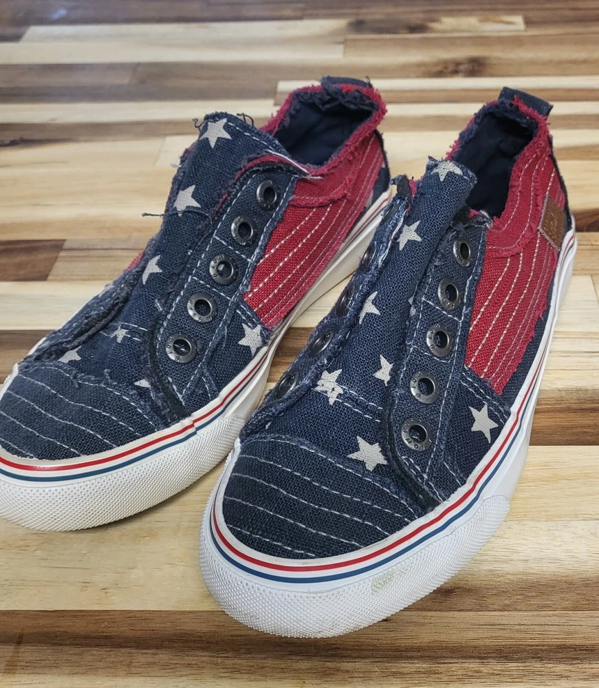 Elevate your shoe collection with these patriotic Blowfish Malibu canvas slip-on sneakers. Featuring a flag pattern, distressed frayed detailing, and a navy star design, these sneakers are perfect for activewear or casual occasions. The slip-on closure and athletic style make them ideal for summer, fall, and spring seasons. With a US shoe size of 6.5, they are designed for women who love to flaunt their sense of style. Add these sneakers to your wardrobe today and let your feet do the talking!