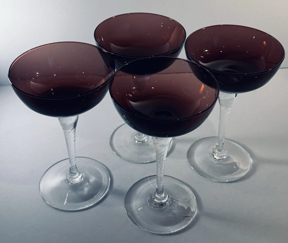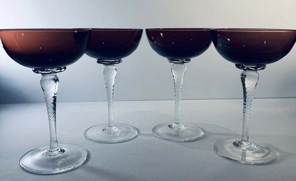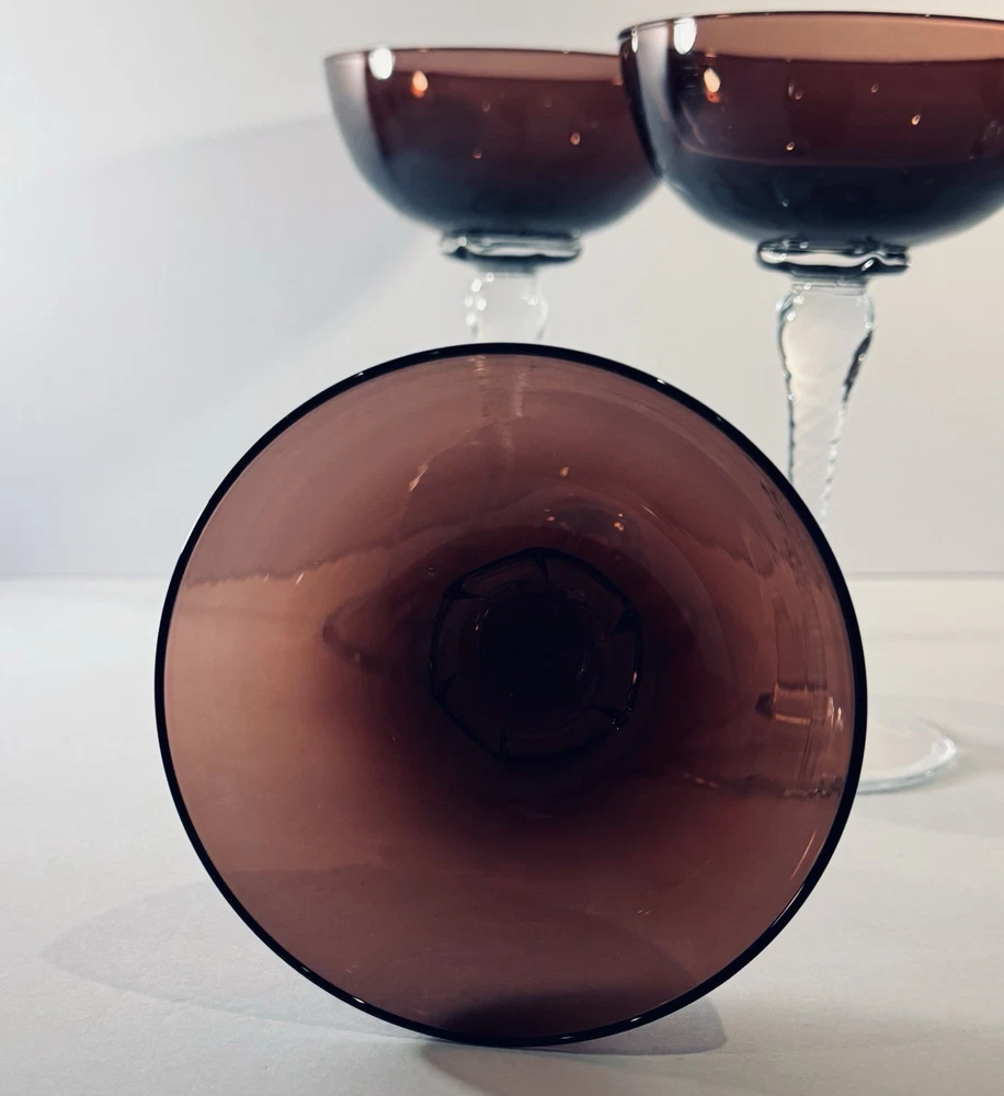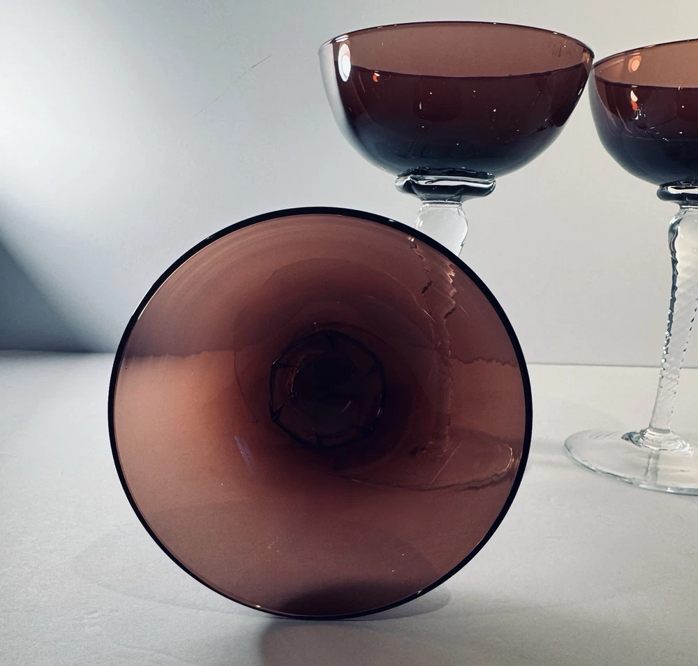 Sip in style with this set of 4 stunning hand-blown amethyst coupe glasses. Each features a rich plum-toned bowl, a sculptural twisted clear stem, and a unique blown-glass detail where the bowl meets the stem—an artisan touch that sets them apart. • Material: Hand-blown glass • Color: Deep amethyst bowl • Stem: Twisted clear glass • Detail: Subtle artisan flair under the bowl • Height: Approx. 6 1/4” • Quantity: Set of 4 ( I have 8 available total) • Condition: Excellent vintage – no chips or cracks Elegant, collectible, and perfect for champagne, cocktails, or dessert wines.