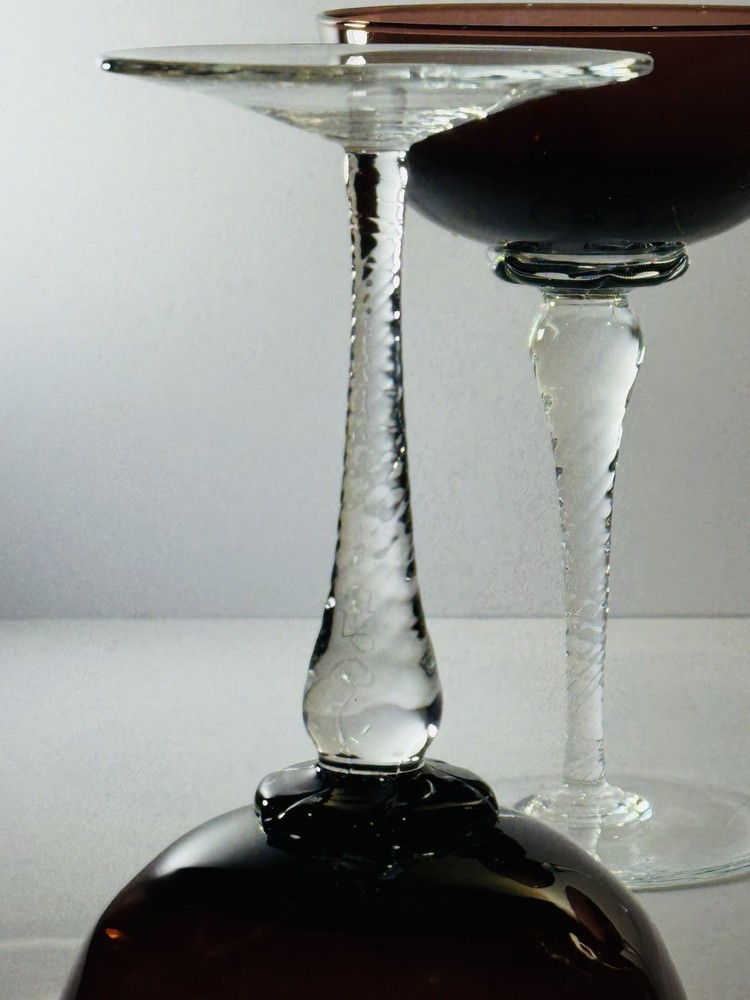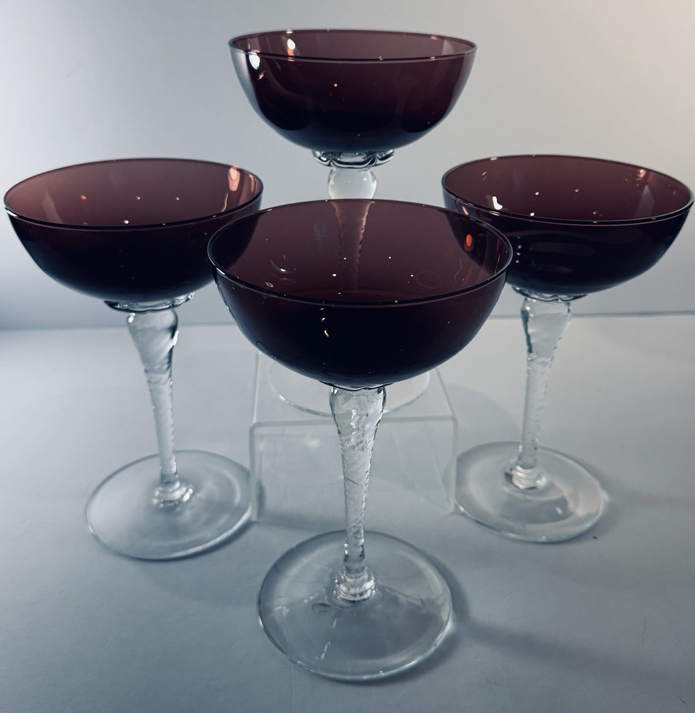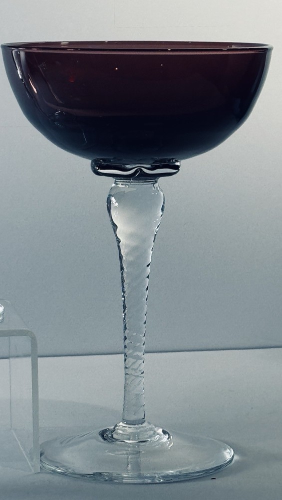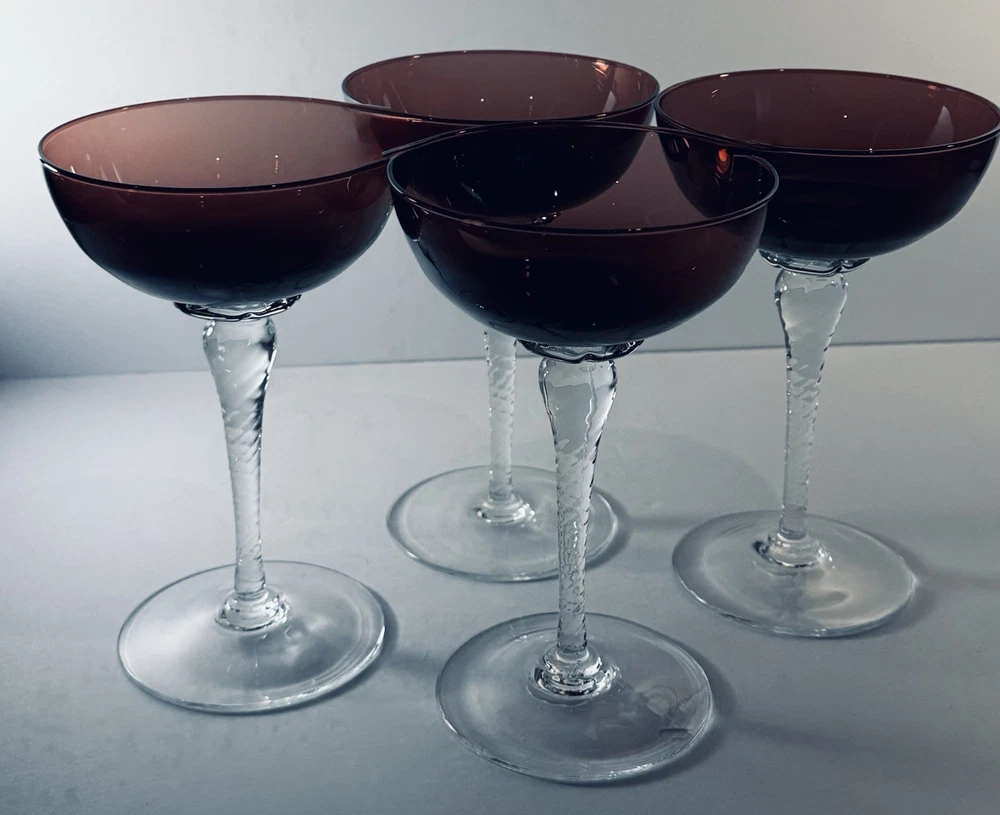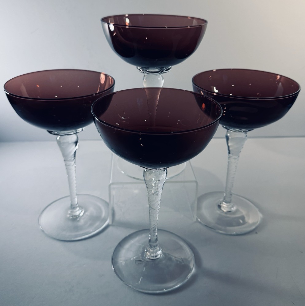 Sip in style with this set of 4 stunning hand-blown amethyst coupe glasses. Each features a rich plum-toned bowl, a sculptural twisted clear stem, and a unique blown-glass detail where the bowl meets the stem—an artisan touch that sets them apart. • Material: Hand-blown glass • Color: Deep amethyst bowl • Stem: Twisted clear glass • Detail: Subtle artisan flair under the bowl • Height: Approx. 6 1/4” • Quantity: Set of 4 ( I have 8 available total) • Condition: Excellent vintage – no chips or cracks Elegant, collectible, and perfect for champagne, cocktails, or dessert wines.
