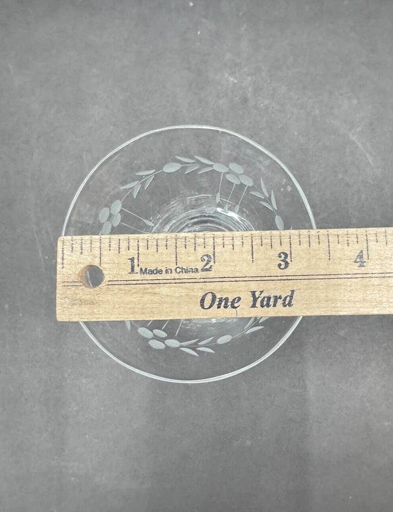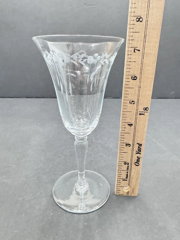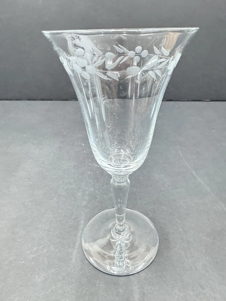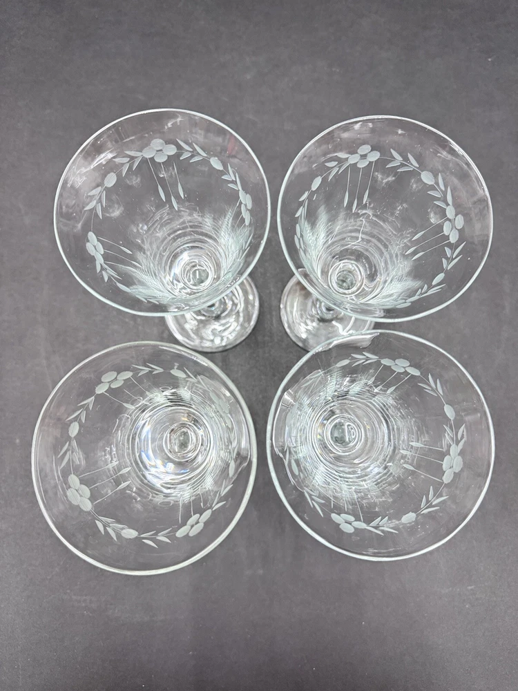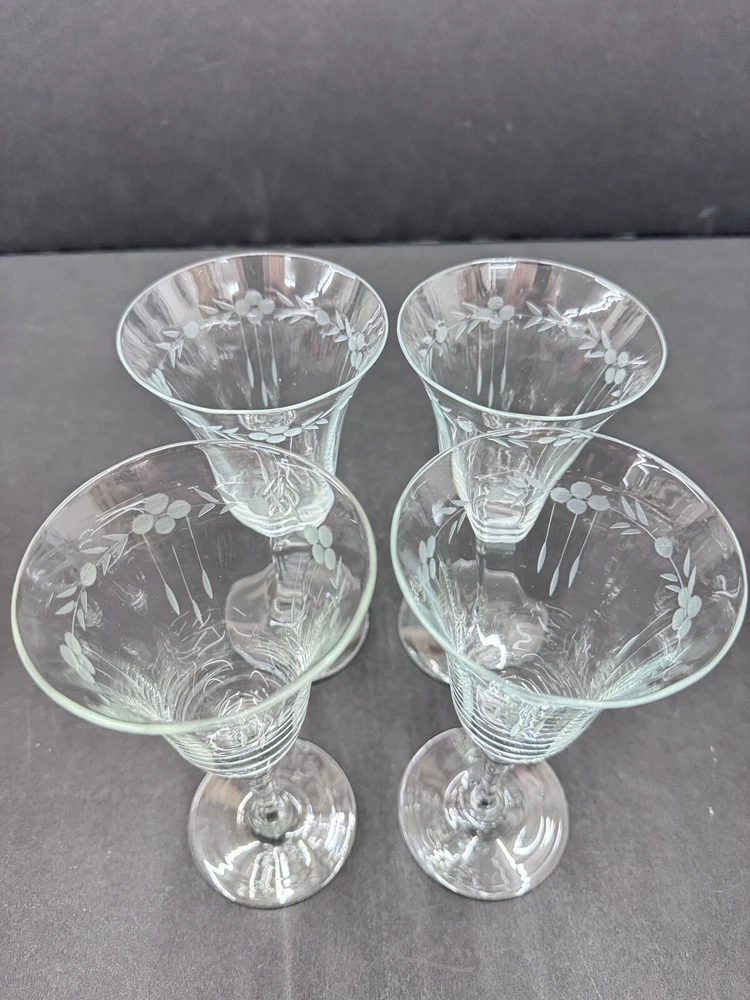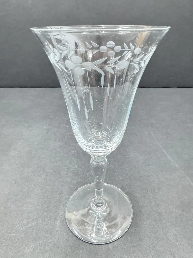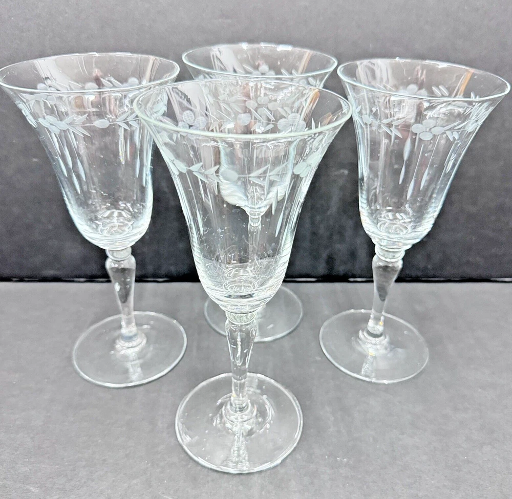 Set of four vintage clear glass water goblets featuring etched patterns of berries and leaves. Each goblet has a capacity of 6 ounces, a diameter of 3 3/8 inches, and a height of 7 1/8 inches. The goblets have an Art Nouveau style and are unmarked. They are recommended for hand wash only and are suitable for all occasions. Made of glass using blown glass production technique with cut glass details.
