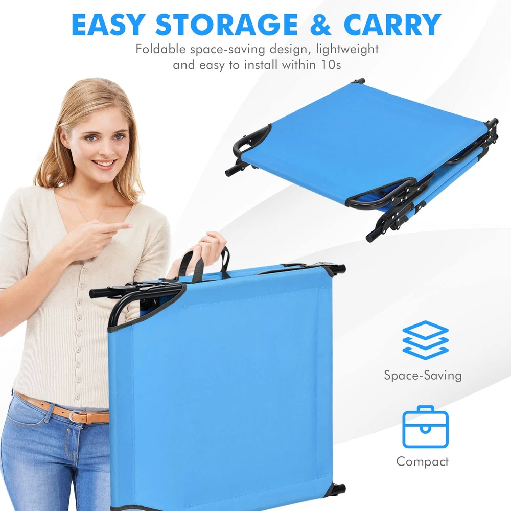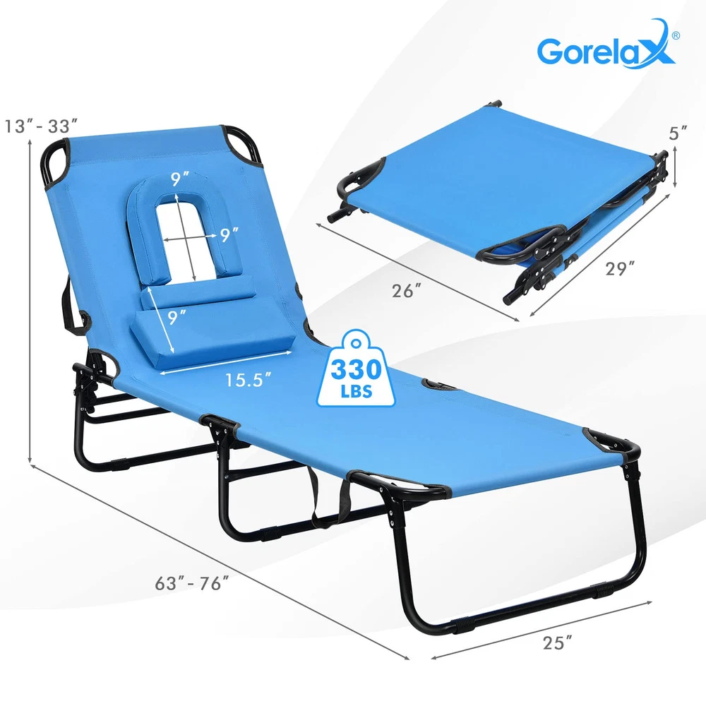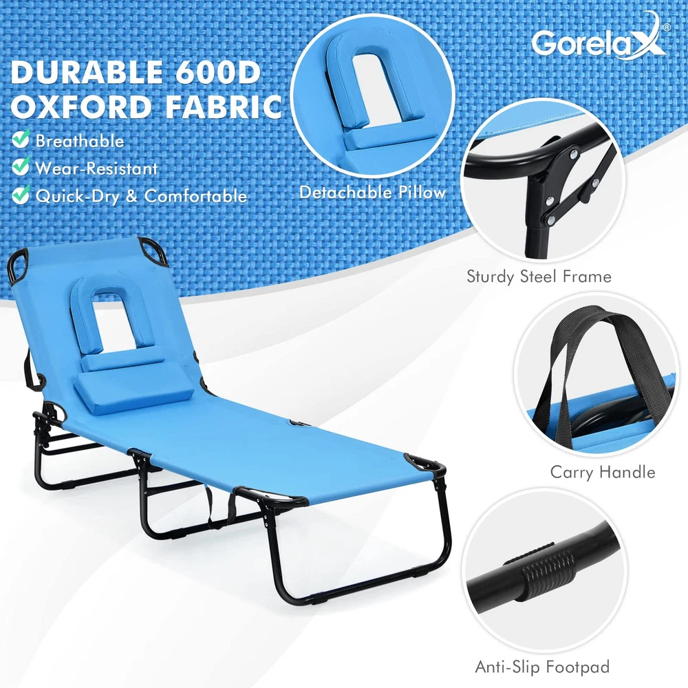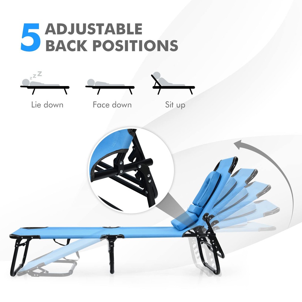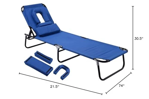 Main: this adjustable chair is ready to keep you comfortable while sleeping, sunbathing or reading, with various° of tilt it is designed to fit your needs. It is great for outdoor use, like the patio, garden, Park, poolside & beach. If you're looking for a high quality chaise lounge Style beach chair without the high end price tag, you have found what you are looking for. Feature: durable folding chaise lounge with adjustable positions removable padded pillows serve as a Headrest or for other support purposes The body is made from durable woven oxford cloth, providing cool comfortable, ventilated seating, & a sturdy steel frame also, the folding design lets the chair fold down into a tiny footprint, making it perfect for traveling heavy-duty durable 600D Oxford cloth of high tensity ergonomic design to reduce muscle tension & multi position Adjustable backrest lays completely flat specifications: Color: Blue material: steel frame & Oxford overall Dimensions: 74"(L) x 21. 5"(W) x 15"-30. 5"(H) folded dimension: 31"(l) x22"(w) x5"(thickness) weight: 11lbs Package include: 1× Beach Chaise Lounge 4-Level Adjustable Reclining Angles: With 4 levels adjustable back height, this lounge chair can help you adjust your lying position to meet your various needs. Its footrest frame can also be adjusted according to your own preferences. Ergonomic & Humanized Designs: Featuring ergonomic design, this chaise lounge chair can effectively reduce muscle tension. Moreover, it comes with a hole so that you can face down and enjoy the sun tanning of back. Sturdy & Durable Structure: Made of durable 600D oxford fabric, this folding bench chair is not easy to damage or deform, keeping breathable in the hot summer. Heavy-duty steel frame gives the reclining chair stability and it can withstand up to 300 pounds. Lightweight & Portable Design: This sun lounger recliner only weighs 11 pounds and its folded size is 31"L x 22"W x 5"H. You can easily fold it up and take it anywhere to enjoy your outdoor leisure time. Designed for Wide Applications: The outdoor reclining chair can be used not only indoors and outdoors, but also for camping or the beach. You can sunbathe or nap on it in the backyard, on the patio, beach or around the pool in your spare time.